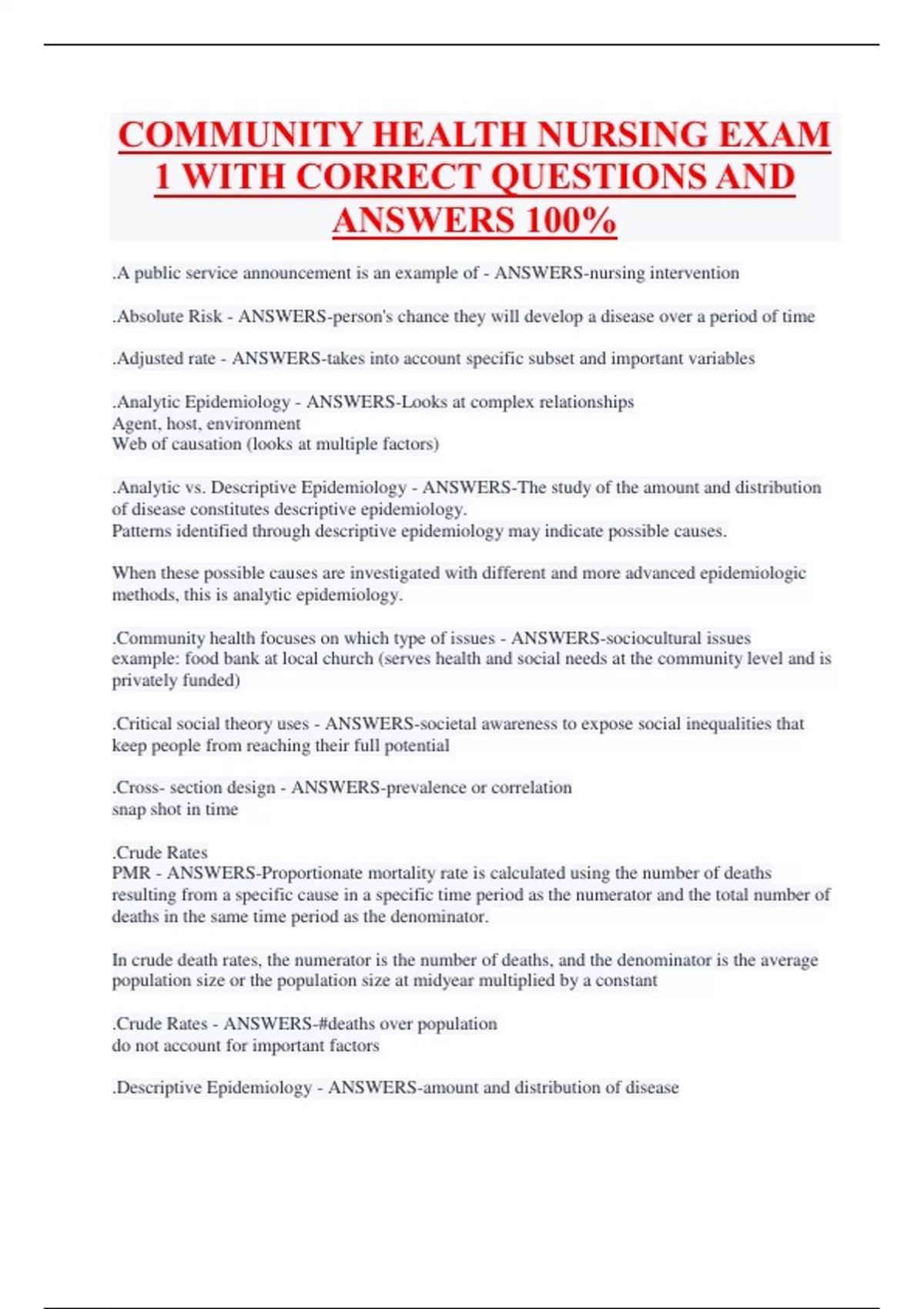 .A public service announcement is an example of - ANSWERS-nursing intervention .Absolute Risk - ANSWERS-person's chance they will develop a disease over a period of time .Adjusted rate - ANSWERS-takes into account specific subset and important variables .Analytic Epidemiology - ANSWERS-Looks at complex relationships Agent, host, environment Web of causation (looks at multiple factors) .Analytic vs. Descriptive Epidemiology - ANSWERS-The study of the amount and distribution of disease constitutes descriptive epidemiology. Patterns identified through descriptive epidemiology may indicate possible causes. When these possible causes are investigated with different and more advanced epidemiologic methods, this is analytic epidemiology. .Community health focuses on which type of issues - ANSWERS-sociocultural issues example: food bank at local church (serves health and social needs at the community level and is privately funded) .Critical social theory uses - ANSWERS-societal awareness to expose social inequalities that keep people from reaching their full potential .Cross- section design - ANSWERS-prevalence or correlation snap shot in time .Crude Rates PMR - ANSWERS-Proportionate mortality rate is calculated using the number of deaths resulting from a specific cause in a specific time period as the numerator and the total number of deaths in the same time period as the denominator. In crude death rates, the numerator is the number of deaths, and the denominator is the average population size or the population size at midyear multiplied by a constant .Crude Rates - ANSWERS-#deaths over population do not account for important factors .Descriptive Epidemiology - ANSWERS-amount and distribution of disease person, place, time approach .Determinants of health - ANSWERS-biology behavior social environment physical environment (what is experienced by the senses) policies and interventions .Epidemiology - ANSWERS-the research that shows the determinant and distribution of disease in populations .First visiting nurse - ANSWERS-Francis Root .Four important aspects of community - ANSWERS-people place interactions commonalities .Goals of Healthy People 2020 - ANSWERS-Focus on achieving health among community 20% smoking 50% premature death .Health Promotion - ANSWERS-activities directed towards improving the well0being and reaching the best health potential. Health education, groups, community outreaches .Health Protection - ANSWERS-intent .Hill's Criteria for Causality - ANSWERS-Temporality Strength of association Dose-response relationship Biological Plausibility consistency alternate explanation experimental coherence/analogy .Incidence rates - ANSWERS-number of newly reported cases that occur during a specified period of time; most sensitive indicator of changing health in a community .Indicators of Health - ANSWERS-The official registration records of births, deaths, marriages, divorces, and adoptions form the basis of data in vital statistics. When compared with previous years, vital statistics provide indicators of population growth or reduction. Census tracts facilitate the organization of resident information in specific community geographic locales. National Health Survey Data describes health trends in a national sample. .Interventions to Conduct Community Assessment - ANSWERS-Focus groups are effective for remote and vulnerable segments of a community and for those with underdeveloped opinions. These sessions can produce greater interaction and expression of ideas than surveys and may provide more insight into an aggregate's opinions. The community health nurse may gather some data by interviewing key informants in the community. Informants may be knowledgeable residents, elected officials, or health care providers. A community forum may be held to discuss selected questions. A telephone survey may be useful for selected questions. .Measure of morbidity - ANSWERS-looks at trends .Measures of mortality - ANSWERS-looks at severity .Milio's framework for prevention (1976) provides a complement to the HBM - ANSWERS-and a mechanism for directing attention upstream and examining opportunities for nursing intervention at the population level .Needs Assessment - ANSWERS-A needs assessment is completed by the community health nurse to gain understanding of the community's perspective on health status, the services used or required, and concerns. .Nursing Theory improves community nursing by - ANSWERS-guiding data collection help interpret data easier to diagnose problems .Odds Ratio - ANSWERS-the odds of having the disease when suspected factor is present as oppose to not present looking at those with disease and without disease similar to risk restrospective- looking back .Odds ration is very similar to risk raito if - ANSWERS-the disease is rare .Orem's self-care deficit theory is based on - ANSWERS-individual self-care needs and explains the level of nursing interventions required to assist clients to obtain optimal health .PH is prevention and promotion of population health at the - ANSWERS-federal and state level .PMR - ANSWERS-proportionate mortality ratio .Political and economic interventions are the most effective way to address - ANSWERS-public determinants of health .Population vs. Aggregate - ANSWERS-Population- group of people with common personal or environmental characteristics ALL elders in a community Aggregate- subgroup of people within a population PREGNANT teenagers within a school district .Prevalence Rate - ANSWERS-the total number of cases (new and old) that exist in specified time period .Primary Secondary Tertiary Prevention - ANSWERS-Primary prevention occurs when intervention activities take place before disease development. Immunization is an example of primary prevention that provides specific protection. Secondary prevention occurs after pathogenesis, namely screening and physical examinations that are aimed at early diagnosis. Tertiary prevention focuses on rehabilitation