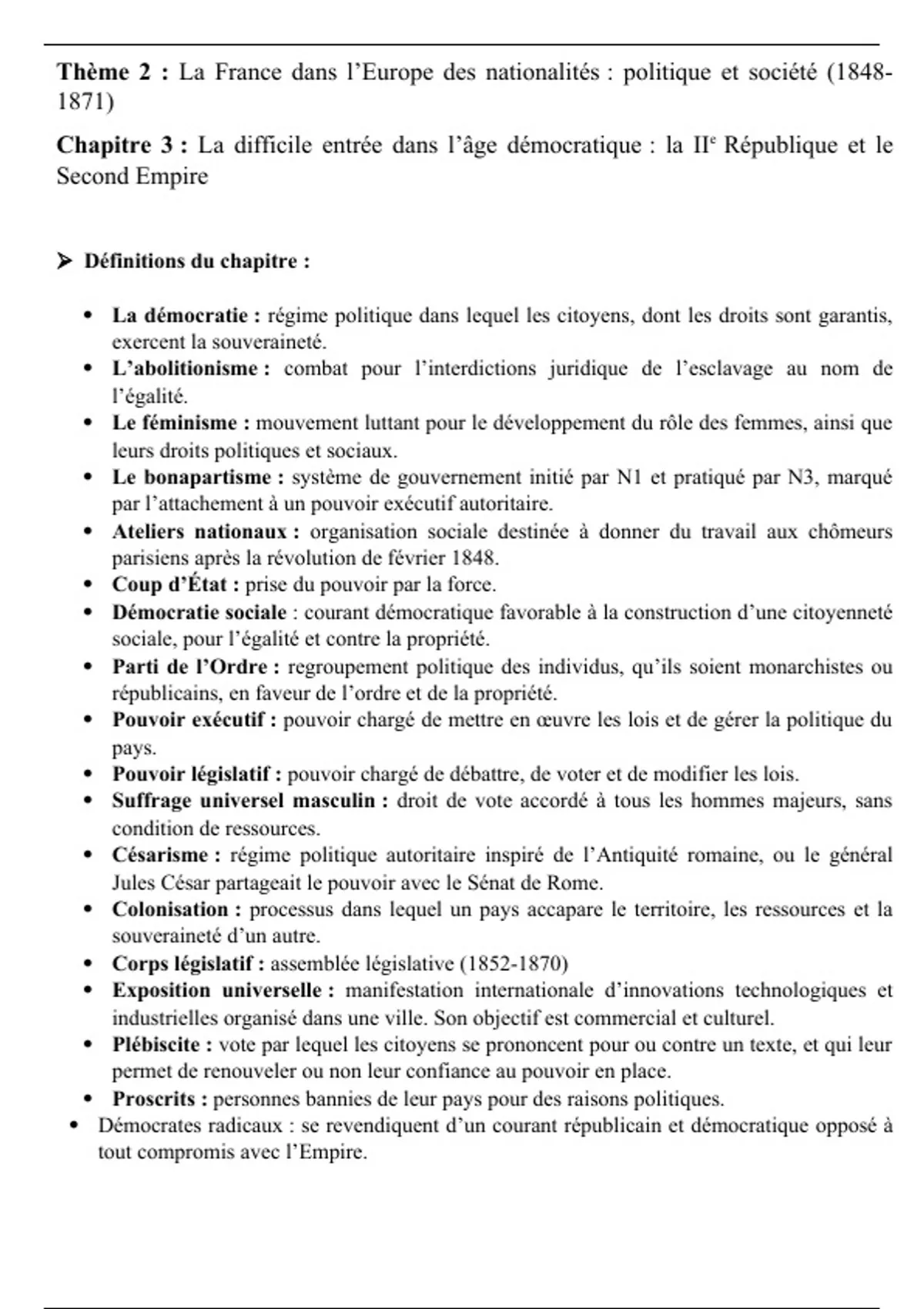 Thème 2: La France dans l’Europe des nationalités : politique et société () Chapitre 1: La difficile entrée dans l’âge démocratique: la IIe République et le Second Empire Ce document est un résumé (plus ou moins) du thème 2 chapitre 1 d’histoire du programme de première bac français (2024). Contenu : - Définitions - Contexte - Introduction - Cours (3) - PPO + Études Abbreviations utilisées : - AN: Assemblée nationale - s.u.m : suffrage universel masculin - N3 / N1: Napoléon III / Napoléon I - R.U : Royaume - Uni