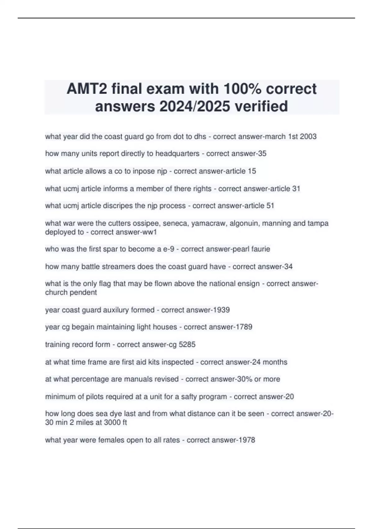 AMT2 final exam with 100% correct answers 2024/2025 verified what year did the coast guard go from dot to dhs - correct answer-march 1st 2003 how many units report directly to headquarters - correct answer-35 what article allows a co to inpose njp - correct answer-article 15 what ucmj article informs a member of there rights - correct answer-article 31 what ucmj article discripes the njp process - correct answer-article 51 what war were the cutters ossipee, seneca, yamacraw, algonuin, manning and tampa deployed to - correct answer-ww1 who was the first spar to become a e-9 - correct answer-pearl faurie how many battle streamers does the coast guard have - correct answer-34 what is the only flag that may be flown above the national ensign - correct answerchurch pendent year coast guard auxilury formed - correct answer-1939 year cg begain maintaining light houses - correct answer-1789 training record form - correct answer-cg 5285 at what time frame are first aid kits inspected - correct answer-24 months at what percentage are manuals revised - correct answer-30% or more minimum of pilots required at a unit for a safty program - correct answer-20 how long does sea dye last and from what distance can it be seen - correct answer-20- 30 min 2 miles at 3000 ft what year were females open to all rates - correct answer-1978 who was a two time winner of the life saving award - correct answer-fredrick hatch the cg's eviromental protection begain in 1822 with - correct answer-timber reserve service interpersonal relations are not allowed at a small shore units of less than how many people - correct answer-60 when are interpersonal relations allowed on cutters - correct answer-never what documents require no format - correct answer-(sop) standard operating procedure what cg directive must be reviewed annually by its originator and cancelled when no longer needed - correct answer-manuals when doesnt a mishap need to be reported - correct answer-cg civilian cuts his leg off with a chainsaw while at home on weekend what training is self paced, completed with time available and may or may not have completion dates - correct answer-non-resident training ( correspondence course) what schools have specific beginning and end dates - correct answer-"c" memeber involved in an alcohol situation are required what action - correct answermember will be counseled who is ultimately responsible for the supply source on a pr - correct answer-contracting officer which is not a reported mishap - correct answer-cg reservist, non on active duty is killed in car accident addiction prevention specialist may not be assigned as - correct answer-unit cdar all electrical equip. should be plugged in with what - correct answer-3 prong ground wire what directive is cancelled after 12 months - correct answer-commandant note all units with 50 or more people are required what - correct answer-(hrc) human relations council emi will not exceed how manys hours per day - correct answer-2 hours what chit is required before going aloft - correct answer-aloft chit when was the tampa sunk - correct answer-w
