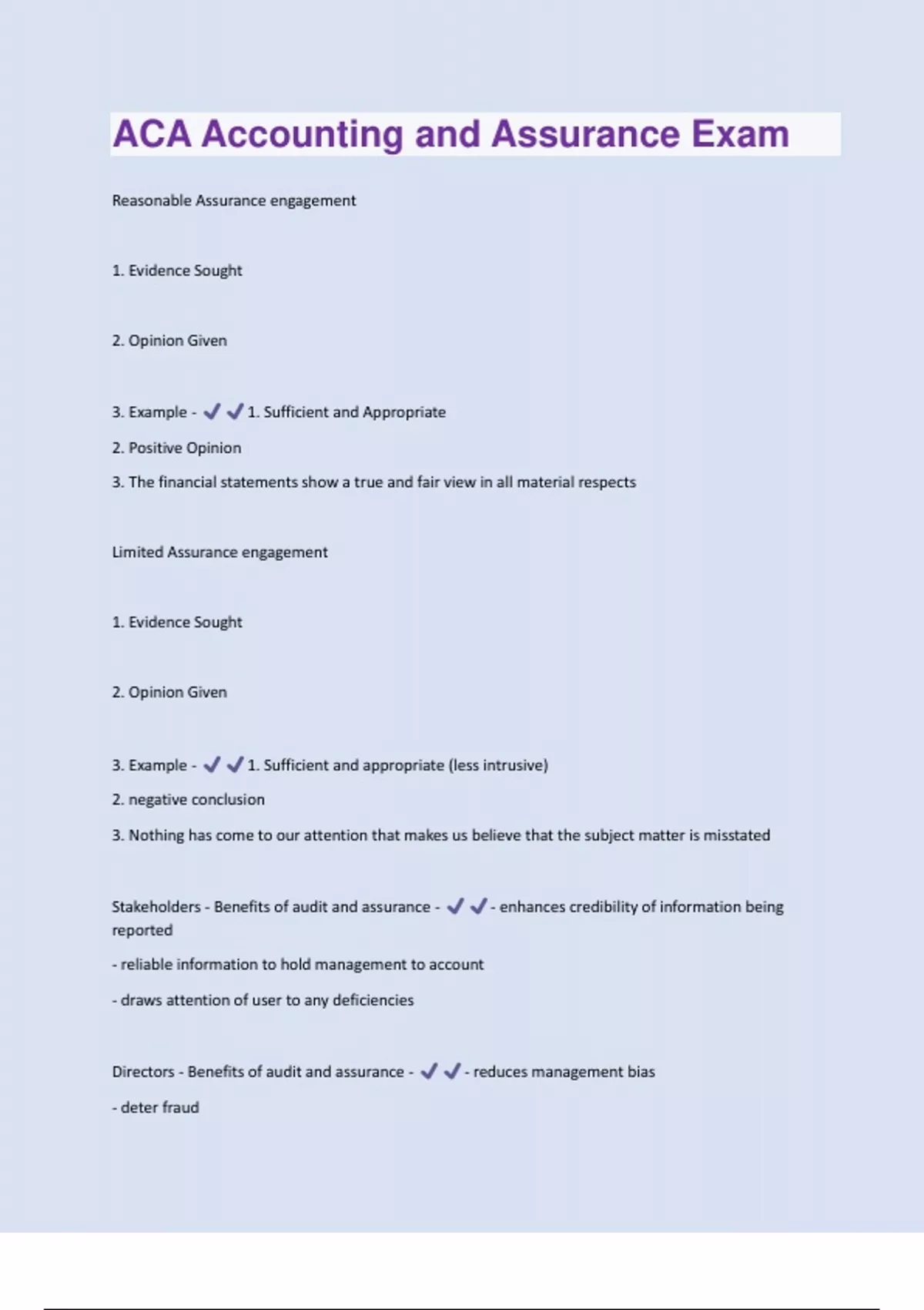 Reasonable Assurance engagement 1. Evidence Sought 2. Opinion Given 3. Example - 1. Sufficient and Appropriate 2. Positive Opinion 3. The financial statements show a true and fair view in all material respects Limited Assurance engagement 1. Evidence Sought 2. Opinion Given 3. Example - 1. Sufficient and appropriate (less intrusive) 2. negative conclusion 3. Nothing has come to our attention that makes us believe that the subject matter is misstated Stakeholders - Benefits of audit and assurance - - enhances credibility of information being reported - reliable information to hold management to account - draws attention of user to any deficiencies Directors - Benefits of audit and assurance - - reduces management bias - deter fraud- enhances reliability of information being reported on - management letter contains constructive advice on internal controls Customers and Suppliers - Benefits of audit and assurance - - helps determine whether they should trade with the company lenders / banks - Benefits of audit and assurance - - business is scrutinised by another set of eyes - gives added confidence to lenders, making it easier for companies to raise finance Employees - Benefits of audit and assurance - - confidence over job security - confidence over bonuses payable if linked to profits Society - Benefits of audit and assurance - - ensures high quality, reliable information, circulates in the market - helps to improve company's reputation - additional assurance to 3rd parties such as tax authorities