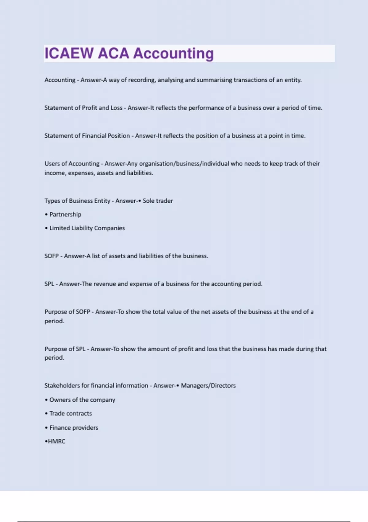 Accounting - Answer-A way of recording, analysing and summarising transactions of an entity. Statement of Profit and Loss - Answer-It reflects the performance of a business over a period of time. Statement of Financial Position - Answer-It reflects the position of a business at a point in time. Users of Accounting - Answer-Any organisation/business/individual who needs to keep track of their income, expenses, assets and liabilities. Types of Business Entity - Answer-• Sole trader • Partnership • Limited Liability Companies SOFP - Answer-A list of assets and liabilities of the business. SPL - Answer-The revenue and expense of a business for the accounting period. Purpose of SOFP - Answer-To show the total value of the net assets of the business at the end of a period. Purpose of SPL - Answer-To show the amount of profit and loss that the business has made during that period. Stakeholders for financial information - Answer-• Managers/Directors • Owners of the company • Trade contracts • Finance providers •HMRCCapital Expenditure - Answer-Expenditure which results in the acquisition of non-current assets or an improvement or enhancement of their earning capacity (>1yr) (NCA) Revenue Expenditure - Answer-Expenditure which is incurred either for trade purposes (e.g. items for resale) or to maintain the existing earning capacity of non-current assets (e.g repairing) Code of Ethics (IFAC) - Answer-• Professional Behaviour • Objectivity • Professional Competence & due care • Confidentiality • Integrity Business entity concept - Answer-A business is a separate entity from its owner. Capital - Answer-How much the business owes back to the owner. Year-end capital Equation - Answer-Bal. at start of year + net profit + capital inj. - drawings Share capital Equation - Answer-Bal. at start of year + Further investment in shares by new stakeholders Retained Earnings Equation - Answer-Bal. at start of year + Profit - dividends