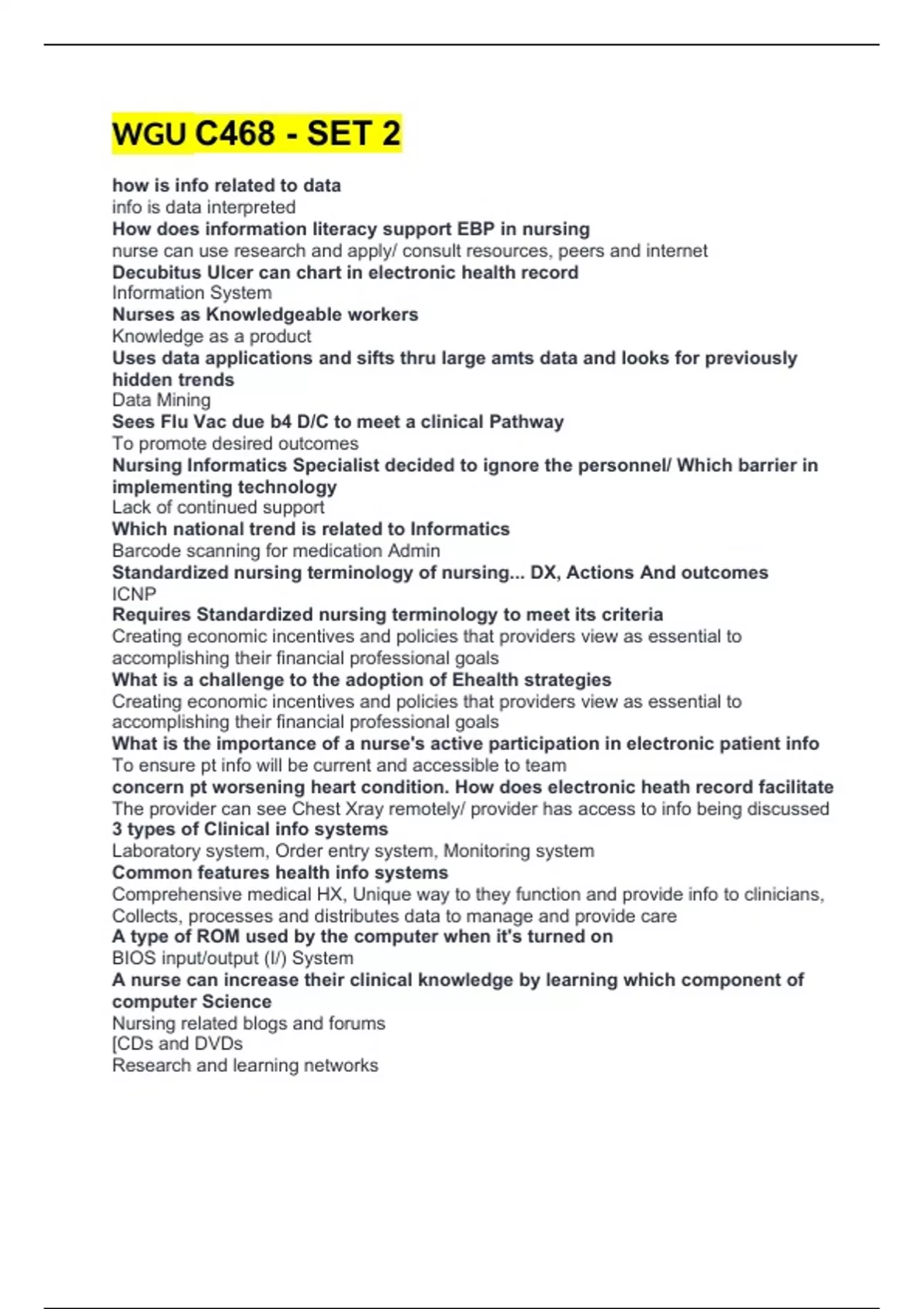 WGU C468 - SET 2 how is info related to data info is data interpreted How does information literacy support EBP in nursing nurse can use research and apply/ consult resources, peers and internet Decubitus Ulcer can chart in electronic health record Information System Nurses as Knowledgeable workers Knowledge as a product Uses data applications and sifts thru large amts data and looks for previously hidden trends Data Mining Sees Flu Vac due b4 D/C to meet a clinical Pathway To promote desired outcomes Nursing Informatics Specialist decided to ignore the personnel/ Which barrier in implementing technology Lack of continued support Which national trend is related to Informatics Barcode scanning for medication Admin Standardized nursing terminology of nursing... DX, Actions And outcomes ICNP Requires Standardized nursing terminology to meet its criteria Creating economic incentives and policies that providers view as essential to accomplishing their financial professional goals What is a challenge to the adoption of Ehealth strategies Creating economic incentives and policies that providers view as essential to accomplishing their financial professional goals What is the importance of a nurse's active participation in electronic patient info To ensure pt info will be current and accessible to team concern pt worsening heart condition. How does electronic heath record facilitate The provider can see Chest Xray remotely/ provider has access to info being discussed 3 types of Clinical info systems Laboratory system, Order entry system, Monitoring system Common features health info systems Comprehensive medical HX, Unique way to they function and provide info to clinicians, Collects, processes and distributes data to manage and provide care A type of ROM used by the computer when it's turned on BIOS input/output (I/) System A nurse can increase their clinical knowledge by learning which component of computer Science Nursing related blogs and forums [CDs and DVDs Research and learning networks The computer literate nurse with the use of nursing informatics will have the knowledge and as a result will have the _______________ and ____________ in nursing Power and influence Using a computer system, a user must be comfortable in utilizing input and output devices. This definition identifies which concept Human technology interface Cognitive informatics can be defined as o study the connection between the brains and minds way of collecting and processing info Which one of the following is the component of cognitive science that uses computer modeling through artificial neural networks to try to explain human intellectual abilities? Connectionism Wang (2003) described cognitive informatics (CI) as an emerging transdisciplinary field of study that attempts to bridge the gap of understanding how information is processed in the mind and in the computer. True A process of various ways of understanding and examine the moral life is called Ethics A social convention about right and wrong human conduct that are so widely shared that they form a stable general agreement Morals Which theoretical framework emerged as a foundation for ethical decision making Principalism The best definition of nursing informatics is An integration of nursing science, computer science and information science. The unique combination of sciences creates a blend that is greater than the sum of its parts this definition can describe an unique component of Nursing Informatics Is an elemental process within informatics where one can file, store, and manipulate data Information management Which concept is an important consideration the Informatics Nurse Specialist must consider regarding the safety of the user. When developing information structures and solutions The difference between knowledge and wisdom is that Wisdom is knowledge that is applied in an appropriate manner. The ease of learning a computer application, and other issues of human performance is know as Usability The key concepts of nurse, person, health and environment are known as The Metaparadigm : A decision support system is A rule based system that uses a knowledge base and a set of rules to make action recommendations