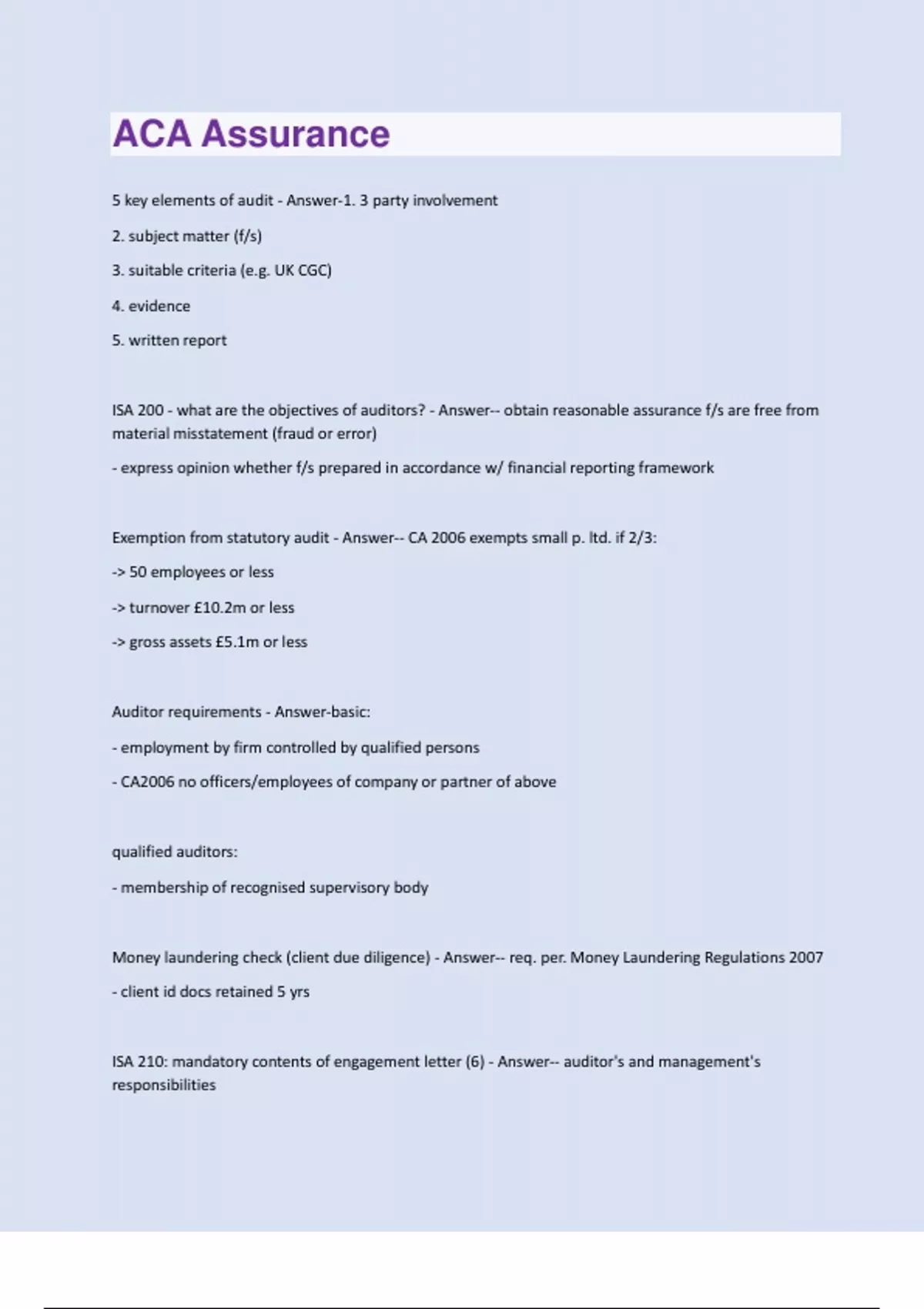 5 key elements of audit - Answer-1. 3 party involvement 2. subject matter (f/s) 3. suitable criteria (e.g. UK CGC) 4. evidence 5. written report ISA 200 - what are the objectives of auditors? - Answer-- obtain reasonable assurance f/s are free from material misstatement (fraud or error) - express opinion whether f/s prepared in accordance w/ financial reporting framework Exemption from statutory audit - Answer-- CA 2006 exempts small p. ltd. if 2/3: -> 50 employees or less -> turnover £10.2m or less -> gross assets £5.1m or less Auditor requirements - Answer-basic: - employment by firm controlled by qualified persons - CA2006 no officers/employees of company or partner of above qualified auditors: - membership of recognised supervisory body Money laundering check (client due diligence) - Answer-- req. per. Money Laundering Regulations 2007 - client id docs retained 5 yrs ISA 210: mandatory contents of engagement letter (6) - Answer-- auditor's and management's responsibilities- scope of work (stat/non-stat) - form of reports (reasonable/limited) - written confirmation of firm's acceptance of engagement - level of access to books & records (full = audit & limited = review engagement) - reporting framework ISA 210: optional contents of engagement letter (5) - Answer-- limitations of engagement - confidentiality/restricted use of report - reliance on internal controls - basis of fee calculations - restrictions on auditor's liability Key components of audit strategy - Answer-- understanding the entity and its environment - materiality - risk assessment - nature, extent & timing of audit procedures - direction, supervision & review of work ISA 315 - what 6 things are important in understanding the entity and its environment? - Answer-- industry, regulatory, financial reporting framework - nature of the entity - accounting policies - objectives and strategies & business risks that may result in material misstatement - measurement of entity's financial performance - internal controls ISA 315 - How to understand the entity and its environment? (4) - Answer-- enquires of management & client staff - analytical procedures- observation - inspection Risk assessment - Answer--> audit risk = inherent risk x control risk x detection risk Audit risk - Answer-= risk auditor gives inappropriate opinion on f/s Inherent risk - Answer-= risk of misstatement in a transaction irregardless of internal controls Control risk - Answer-= risk of material misstatement not prevented, detected or corrected by internal controls Detection risk - Answer-= risk auditor's procedures will not detect material misstatement