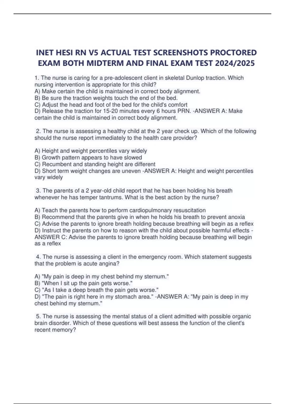 INET HESI RN V5 ACTUAL TEST SCREENSHOTS PROCTORED EXAM BOTH MIDTERM AND FINAL EXAM TEST 2024/2025 1. The nurse is caring for a pre-adolescent client in skeletal Dunlop traction. Which nursing intervention is appropriate for this child? A) Make certain the child is maintained in correct body alignment. B) Be sure the traction weights touch the end of the bed. C) Adjust the head and foot of the bed for the child's comfort D) Release the traction for 15-20 minutes every 6 hours PRN. -ANSWER A: Make certain the child is maintained in correct body alignment. 2. The nurse is assessing a healthy child at the 2 year check up. Which of the following should the nurse report immediately to the health care provider? A) Height and weight percentiles vary widely B) Growth pattern appears to have slowed C) Recumbent and standing height are different D) Short term weight changes are uneven -ANSWER A: Height and weight percentiles vary widely 3. The parents of a 2 year-old child report that he has been holding his breath whenever he has temper tantrums. What is the best action by the nurse? A) Teach the parents how to perform cardiopulmonary resuscitation B) Recommend that the parents give in when he holds his breath to prevent anoxia C) Advise the parents to ignore breath holding because breathing will begin as a reflex D) Instruct the parents on how to reason with the child about possible harmful effects - ANSWER C: Advise the parents to ignore breath holding because breathing will begin as a reflex 4. The nurse is assessing a client in the emergency room. Which statement suggests that the problem is acute angina? A) "My pain is deep in my chest behind my sternum." B) "When I sit up the pain gets worse." C) "As I take a deep breath the pain gets worse." D) "The pain is right here in my stomach area." -ANSWER A: "My pain is deep in my chest behind my sternum." 5. The nurse is assessing the mental status of a client admitted with possible organic brain disorder. Which of these questions will best assess the function of the client's recent memory? A) "Name the year." "What season is this?" (pause for answer after each question) B) "Subtract 7 from 100 and then subtract 7 from that." (pause for answer) "Now continue to subtract 7 from the new number." C) "I am going to say the names of three things and I want you to repeat them after me: blue, ball, pen." D) "What is this on my wrist?" (point to your watch) Then ask, "What is the purpose of it?" -ANSWER C: "I am going to say the names of three things and I want you to repeat them after me: blue, ball, pen." 6. In planning care for a 6 month-old infant, what must the nurse provide to assist in the development of trust? A) Food B) Warmth C) Security D) Comfort -ANSWER C: Security 7. A nurse has just received a medication order which is not legible. Which statement best reflects assertive communication? A) "I cannot give this medication as it is written. I have no idea of what you mean." B) "Would you please clarify what you have written so I am sure I am reading it correctly?" C) "I am having difficulty reading your handwriting. It would save me time if you would be more careful." D) "Please print in the future so I do not have to spend extra time attempting to read your writing." -ANSWER B) "Would you please clarify what you have written so I am sure I am reading it correctly?" 8. What is the most important consideration when teaching parents how to reduce risks in the home? A) Age and knowledge level of the parents B) Proximity to emergency services C) Number of children in the home D) Age of children in the home -ANSWER D: Age of children in the home 9. A 35 year-old client with sickle cell crisis is talking on the telephone but stops as the nurse enters the room to request something for pain. The nurse should A) Administer a placebo B) Encourage increased fluid intake C) Administer the prescribed analgesia D) Recommend relaxation exercises for pain control -ANSWER C: Administer the prescribed analgesia 10. While caring for a toddler with croup, which initial sign of croup requires the nurse's immediate attention? A) Respiratory rate of 42 B) Lethargy for the past hour C) Apical pulse of 54 D) Coughing up copious secretions -ANSWER A: Respiratory rate of 30 11. A client is admitted with low T3 and T4 levels and an elevated TSH level. On initial assessment, the nurse would anticipate which of the following assessment findings? A) Lethargy B) Heat intolerance C) Diarrhea D) Skin eruptions -ANSWER A: Lethargy 12. The emergency room nurse admits a child who experienced a seizure at school. The father comments that this is the first occurrence, and denies any family history of epilepsy. What is the best response by the nurse? A) "Do not worry. Epilepsy can be treated with medications." B) "The seizure may or may not mean your child has epilepsy." C) "Since this was the first convulsion, it may not happen again." D) "Long term treatment will prevent future seizures." -ANSWER B: "The seizure may or may not mean your child