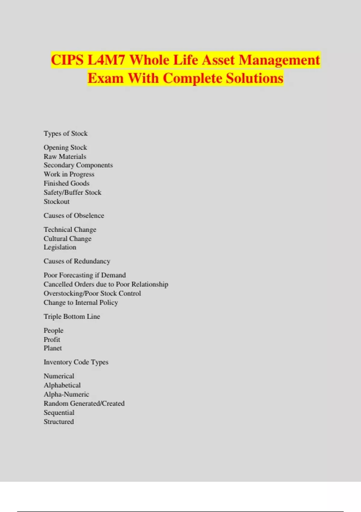 CIPS L4M7 Whole Life Asset Management Exam With Complete Solutions Types of Stock Opening Stock Raw Materials Secondary Components Work in Progress Finished Goods Safety/Buffer Stock Stockout Causes of Obselence Technical Change Cultural Change Legislation Causes of Redundancy Poor Forecasting if Demand Cancelled Orders due to Poor Relationship Overstocking/Poor Stock Control Change to Internal Policy Triple Bottom Line People Profit Planet Inventory Code Types Numerical Alphabetical Alpha-Numeric Random Generated/Created Sequential Structured Factors Influencing Storage Location Cost Availability Suitability Nature of Items to be Stored Access to Transport Infrastructure Considerations when Designing a Warehouse Flow Types of Inventory Raw Materials Components Work in Progress Finished Goods Purpose of Stores/Warehouses Make stock available to customers Maintain safe environment for workers in warehouse Maintain secure environment and avoid stock losses EAN13 Barcode 2D Barcode Types of Stock Opening Stock Raw Materials Secondary Components Work in Progress Finished Goods Safety/Buffer Stock Stockout Materials Handling Equipment Dollies Sack Trucks Trolleys Turntable Trucks Roll Cages Order Pickers Pallet Trucks Pallet Stackers