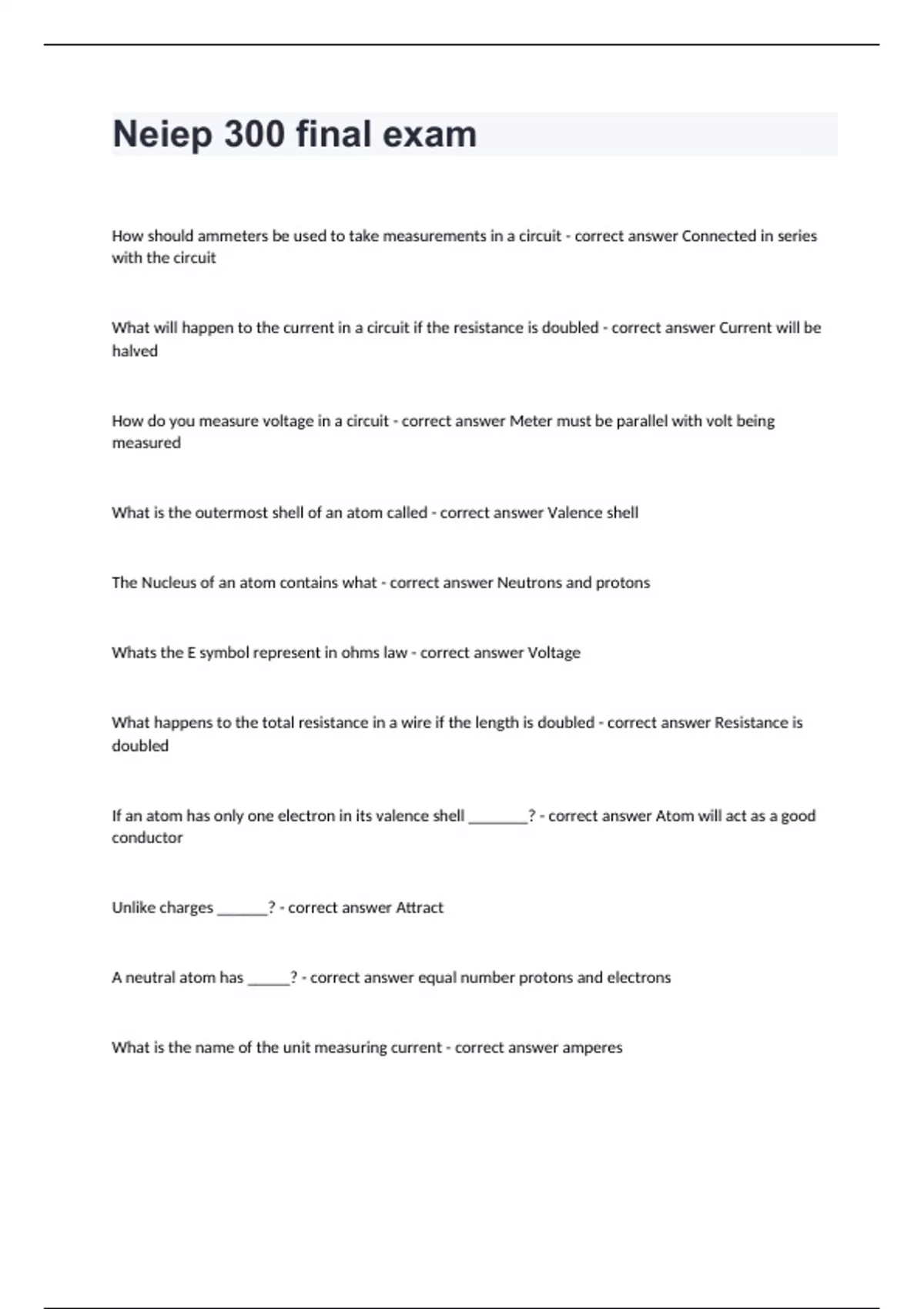 Neiep 300 final exam How should ammeters be used to take measurements in a circuit - correct answer Connected in series with the circuit What will happen to the current in a circuit if the resistance is doubled - correct answer Current will be halved How do you measure voltage in a circuit - correct answer Meter must be parallel with volt being measured What is the outermost shell of an atom called - correct answer Valence shell The Nucleus of an atom contains what - correct answer Neutrons and protons Whats the E symbol represent in ohms law - correct answer Voltage What happens to the total resistance in a wire if the length is doubled - correct answer Resistance is doubled If an atom has only one electron in its valence shell _______? - correct answer Atom will act as a good conductor Unlike charges ______? - correct answer Attract A neutral atom has _____? - correct answer equal number protons and electrons What is the name of the unit measuring current - correct answer amperes