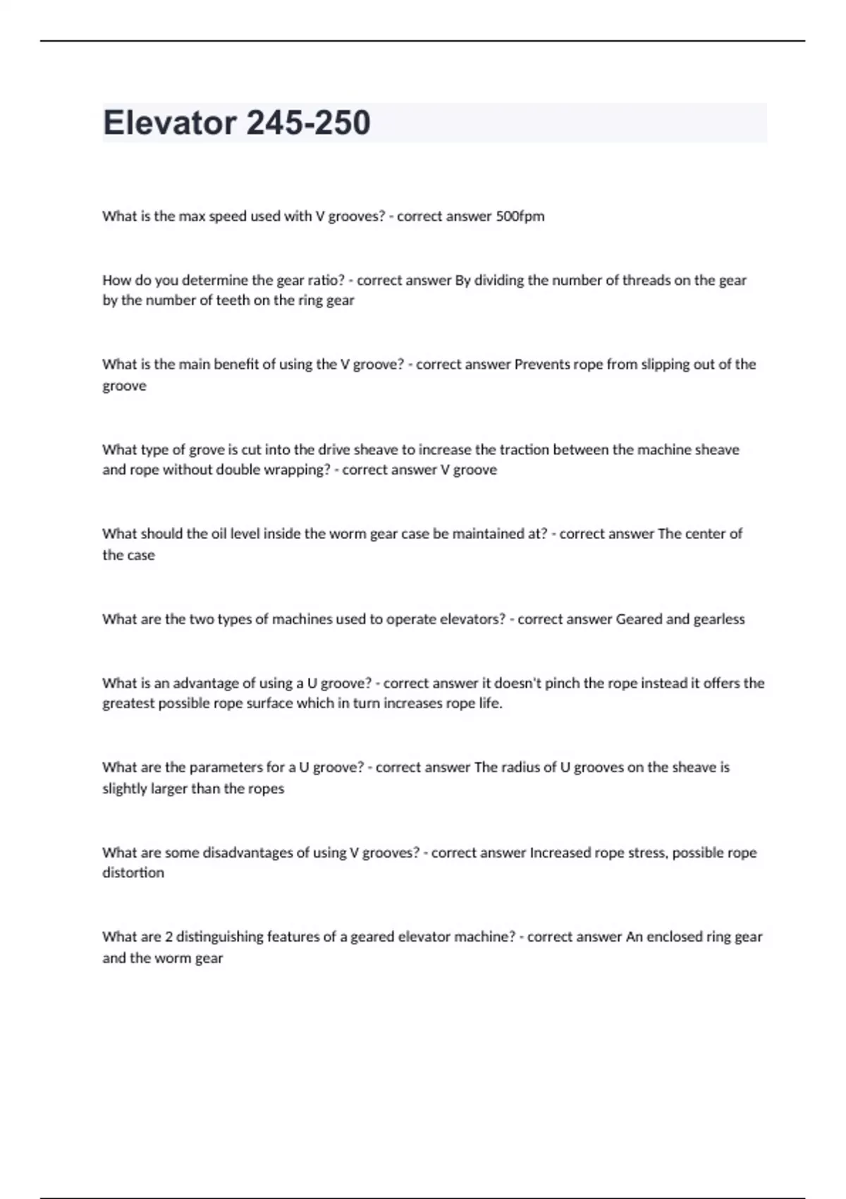 Elevator 245-250What is the max speed used with V grooves? - correct answer 500fpm How do you determine the gear ratio? - correct answer By dividing the number of threads on the gear by the number of teeth on the ring gear What is the main benefit of using the V groove? - correct answer Prevents rope from slipping out of the groove What type of grove is cut into the drive sheave to increase the traction between the machine sheave and rope without double wrapping? - correct answer V groove What should the oil level inside the worm gear case be maintained at? - correct answer The center of the case What are the two types of machines used to operate elevators? - correct answer Geared and gearless What is an advantage of using a U groove? - correct answer it doesn't pinch the rope instead it offers the greatest possible rope surface which in turn increases rope life. What are the parameters for a U groove? - correct answer The radius of U grooves on the sheave is slightly larger than the ropes What are some disadvantages of using V grooves? - correct answer Increased rope stress, possible rope distortion What are 2 distinguishing features of a geared elevator machine? - correct answer An enclosed ring gear and the worm gear