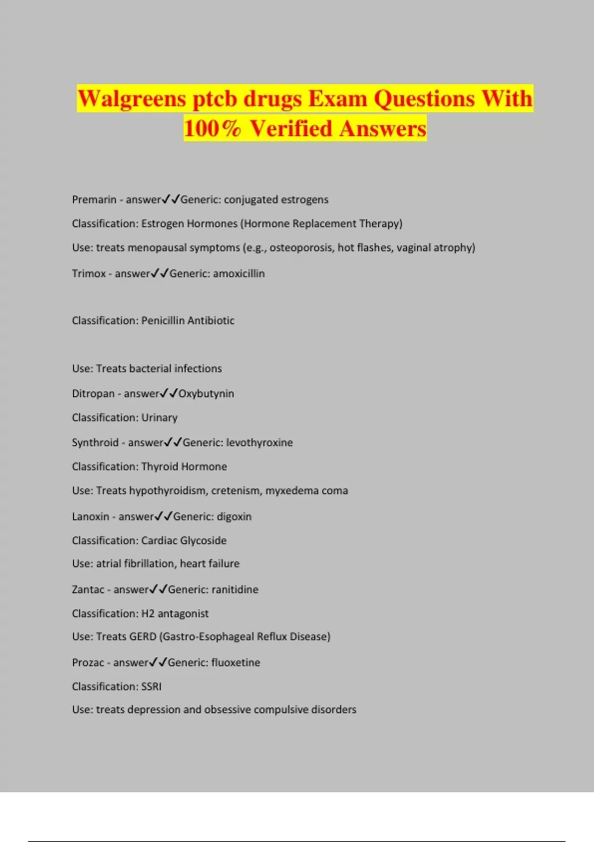 Walgreens ptcb drugs Exam Questions With 100% Verified Answers Premarin - answerGeneric: conjugated estrogens Classification: Estrogen Hormones (Hormone Replacement Therapy) Use: treats menopausal symptoms (e.g., osteoporosis, hot flashes, vaginal atrophy) Trimox - answerGeneric: amoxicillin Classification: Penicillin Antibiotic Use: Treats bacterial infections Ditropan - answerOxybutynin Classification: Urinary Synthroid - answerGeneric: levothyroxine Classification: Thyroid Hormone Use: Treats hypothyroidism, cretenism, myxedema coma Lanoxin - answerGeneric: digoxin Classification: Cardiac Glycoside Use: atrial fibrillation, heart failure Zantac - answerGeneric: ranitidine Classification: H2 antagonist Use: Treats GERD (Gastro-Esophageal Reflux Disease) Prozac - answerGeneric: fluoxetine Classification: SSRI Use: treats depression and obsessive compulsive disorders Vicodin - answerGeneric: Hydrocodone w/ APAP, acetaminophen Classification: Opiate Analgesic Use: Treats moderate to severe pain Coumadin - answerGeneric: Warfarin Classification: Anticoagulant , cardiovascular Use: Prevents the formation of blood clots Zoloft - answerGeneric: sertraline Classification: SSRI Use: treats depression and obsessive compulsive disorder Prilosec - answerGeneric: omeprazole Classification: Proton-Pump Inhibitor ,gastrointestinal, antacid Use: Treats GERD, duodenal, & gastric ulcers; heartburn Norvasc - answerGeneric: Amlodipine Classification: Calcium Channel Blocker, cardiovascular Use: Hypertension, angina Mobic - answerGeneric: Meloxicam Classification: Non-steroid, anti-inflammatory drug NSAID Use: Treats Arthritis Proventil - answerGeneric: albuterol Classification: Bronchodilator Use: Treats asthma; bronchospasm Dyazide - answerGeneric: triamterene/HCTZ Classification: Diuretic, cardiovascular Use: Treats hypertension; edema Aciphex - answerGeneric: rabeprazole Classification: Proton-Pump Inhibitor Use: ulcers; Gastro-Esophageal Reflux Disease (GERD) Zestril, Prinivil - answerGeneric: lisinopril Classification: ACE Inhibitor, cardiovascular Use: Congestive heart failure, hypertension Lasix - answerGeneric: furosemide Classification: Loop Diuretic, cardiovascular Use: Treats hypertension, congestive heart failure Zocor - answerGeneric: simvastatin Classification: antilipemic agent (lipid/cholesterol lowering agent) Use: treats hypercholesterolemia Paxil - answerGeneric: paroxetine Classification: SSRI Use: Treats depression obsessive-compulsive disorder, & panic disorder Actos - answerGeneric: pioglitazone Classification: Oral Antidiabetic Use: diabetes mellitus Cipro - answerGeneric: ciprofloxacin Classification: Fluoroquinolone Antibiotic Use: treats respiratory, urinary tract, and middle ear infection K-Dur, Klor-Con - answerGeneric: potassium chloride Classification: Potassium Replacement Use: Treats hypokalemia (low levels of potassium) Digitek - answerGeneric: digoxin Classification: Cardiac Glycoside Use: atrial fibrillation, heart failure Advair Diskus - answerGeneric: salmeterol/fluticasone