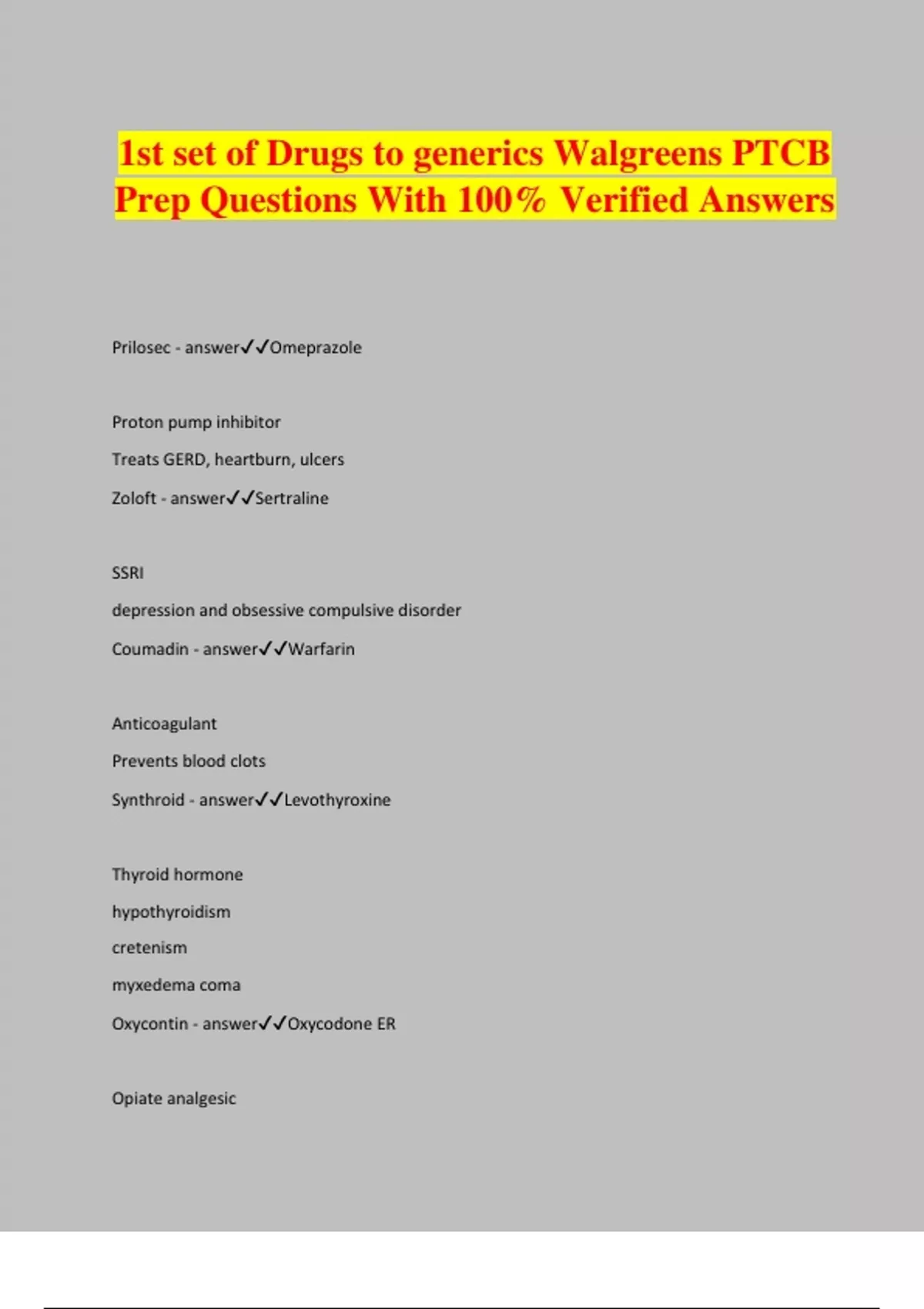 1st set of Drugs to generics Walgreens PTCB Prep Questions With 100% Verified Answers