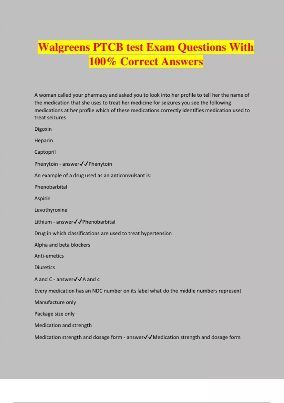 Walgreens PTCB test Exam Questions With 100% Correct Answers A woman called your pharmacy and asked you to look into her profile to tell her the name of the medication that she uses to treat her medicine for seizures you see the following medications at her profile which of these medications correctly identifies medication used to treat seizures Digoxin Heparin Captopril Phenytoin - answerPhenytoin An example of a drug used as an anticonvulsant is: Phenobarbital Aspirin Levothyroxine Lithium - answerPhenobarbital Drug in which classifications are used to treat hypertension Alpha and beta blockers Anti-emetics Diuretics A and C - answerA and c Every medication has an NDC number on its label what do the middle numbers represent Manufacture only Package size only Medication and strength Medication strength and dosage form - answerMedication strength and dosage form The appearance of crystals in mannitol injections would indicate that the product Was exposed to excessive cold Has settled during stripping Contains impurities and should be returned Was formulated using sterile saline - answerWas exposed to excessive cold The medication furosemide may have which of the following side effects Hyper kalemia Hypertension Polyuria Hypercalcemia - answerPolyuria What substances are not commonly found in a TPN Lipids Dextrose Anabiotic's Amino acids - answerAnabiotic's Which may interfere with the absorption of iron Anti-acids Milk Tetracycline All of the above - answerAll of the above Which of the following is a NSAID Ibuprofen Isosorbride dinitrste Nifedipine Apap - answerIbuprofen Which of the following is an antidepressant Zoloft Lanoxin Dyazide Dilantin - answerZoloft Which of the following medication should be classified as an anti-Anxiety agent Lisiniopril diazepam tetracycline carbamazepine - answerDiazepam Which of the following statements about blood disorders is true A-ferrous sulfate is an example of an iron product that can treat all your deficiency B-Onlyferrous gluconate can treat iron deficiency C-non-drug products can bind to iron to decrease iron absorption D-vitamin B 12 is the product that elevates iron deficiency not ferrous sulfate or furious gluconate - answerA a dr orders 100 units of insulin and 500 ML's of D5W to be at administered over six hours how much insulin will be delivered in the first 90 minutes of infusion Five units 10 units 20 units 25 units - answer25 units A doctor write a prescription for Phenergan 6 ounces how many ML's should be dispensed 60 180 280 480 - answer180