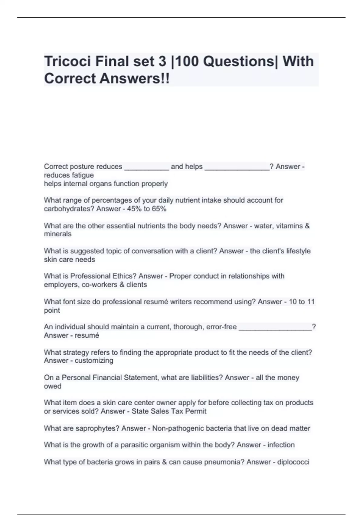 Tricoci Final set 3 |100 Questions| With Correct Answers!!