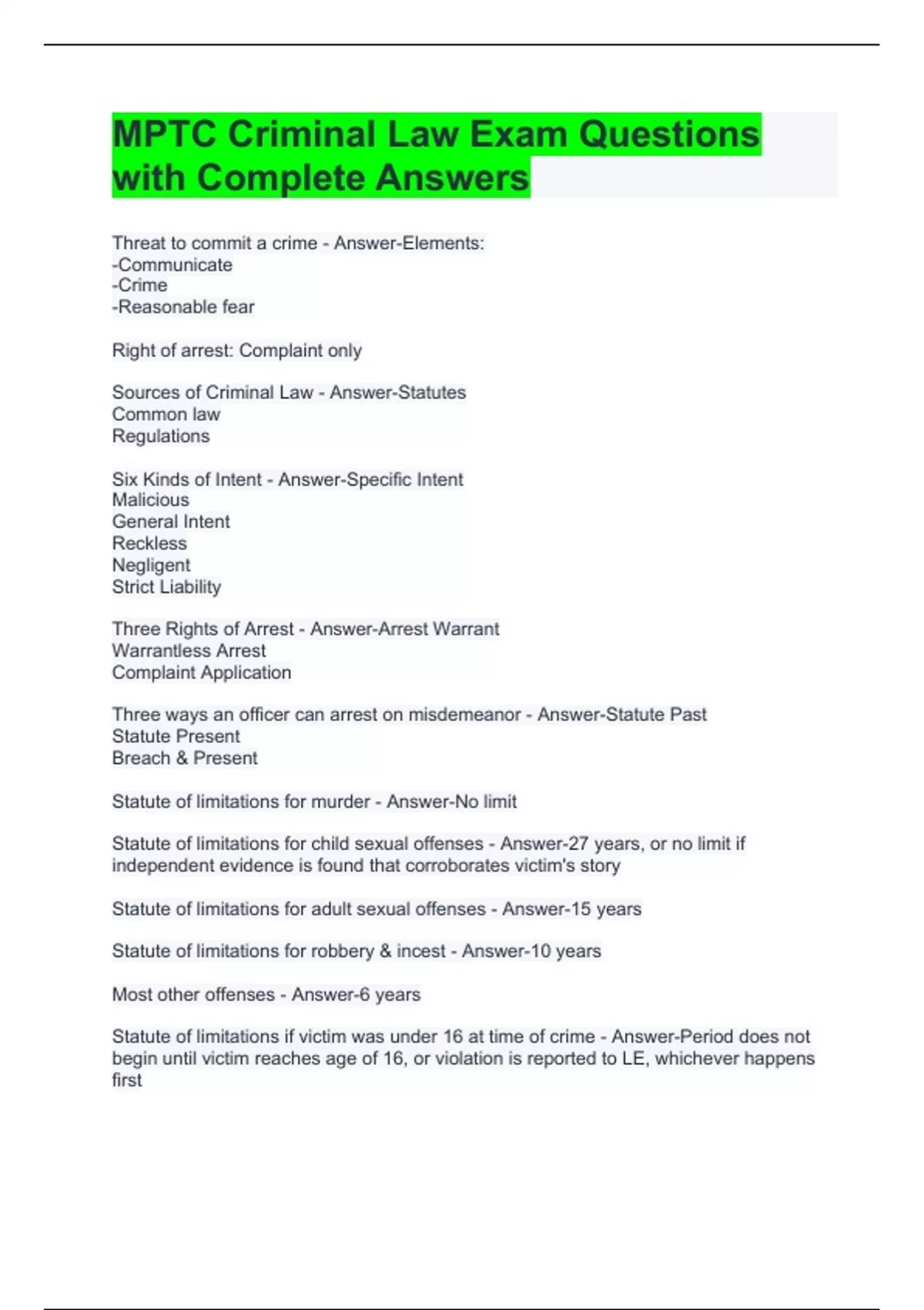mptc criminal law exam questions with complete ans