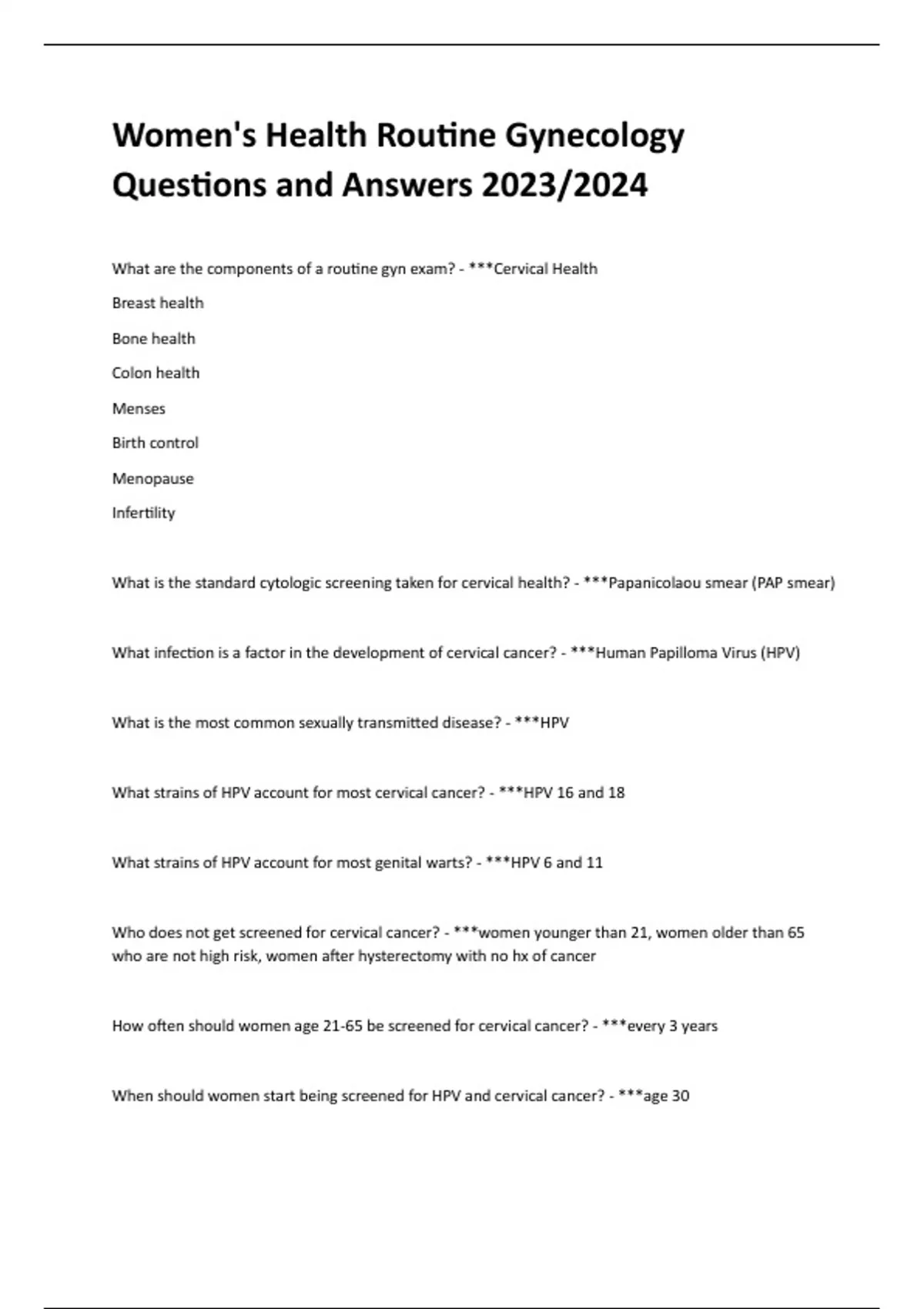 Women's Health Routine Gynecology Questions and Answers 2023/2024