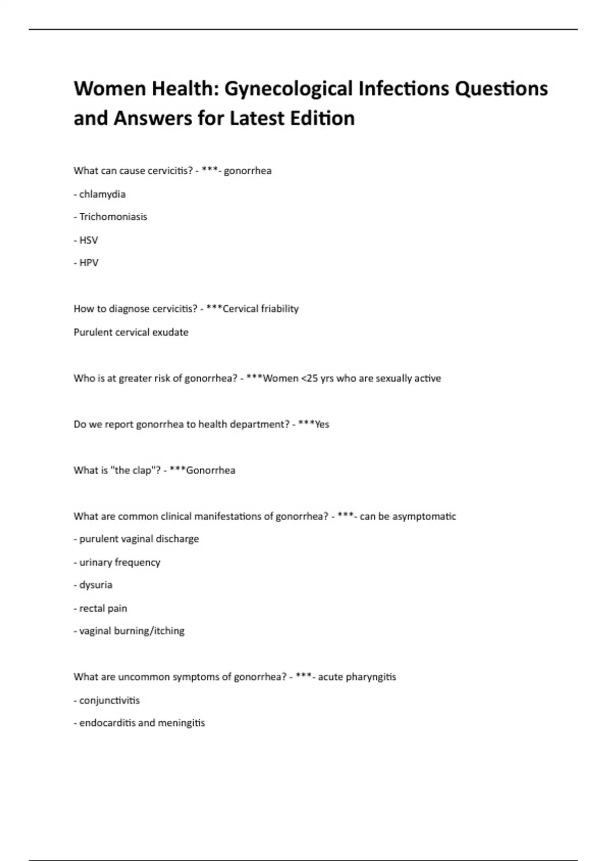 Women Health: Gynecological Infections Questions and Answers for Latest Edition What can cause cervicitis? - ***- gonorrhea - chlamydia - Trichomoniasis - HSV - HPV How to diagnose cervicitis? - ***Cervical friability Purulent cervical exudate Who is at greater risk of gonorrhea? - ***Women <25 yrs who are sexually active Do we report gonorrhea to health department? - ***Yes What is "the clap"? - ***Gonorrhea What are common clinical manifestations of gonorrhea? - ***- can be asymptomatic - purulent vaginal discharge - urinary frequency - dysuria - rectal pain - vaginal burning/itching What are uncommon symptoms of gonorrhea? - ***- acute pharyngitis - conjunctivitis - endocarditis and meningitis What are complications of gonorrhea? - ***- PID - Fitz-Hugh Curtis syndrome - Salpingitis - ectopic pregnancy - endocarditis - meningitis - pregnancy complications What causes gonorrhea? - ***Neisseria gonorrhoeae What is Neisseria gonorrhoeae? - ***Gram negative diplococci which causes gonorrhea (think Gonorrhea=Green) What is used to diagnose gonorrhea? - ***NAAT- genital swab What is the drawback of NAAT test for gonorrhea? - ***Does not test for sensitivity How do we treat gonorrhea? - ***- cover for gonorrhea prior to results - ceftriaxone IM once (500mg <150kg and 1g IM >150kg) - if cephalosporin allergy—> gentamicin IM (240mg) and azithromycin (2g PO) What is most commonly reported infectious diseases in US? - ***Chlamydia Who has an increased risk of chlamydia? - ***People with multiple sexual partners and lower socioeconomic status What are the clinical manifestations of chlamydia? - ***- women commonly are asymptomatic - mucopurulent vaginal discharge