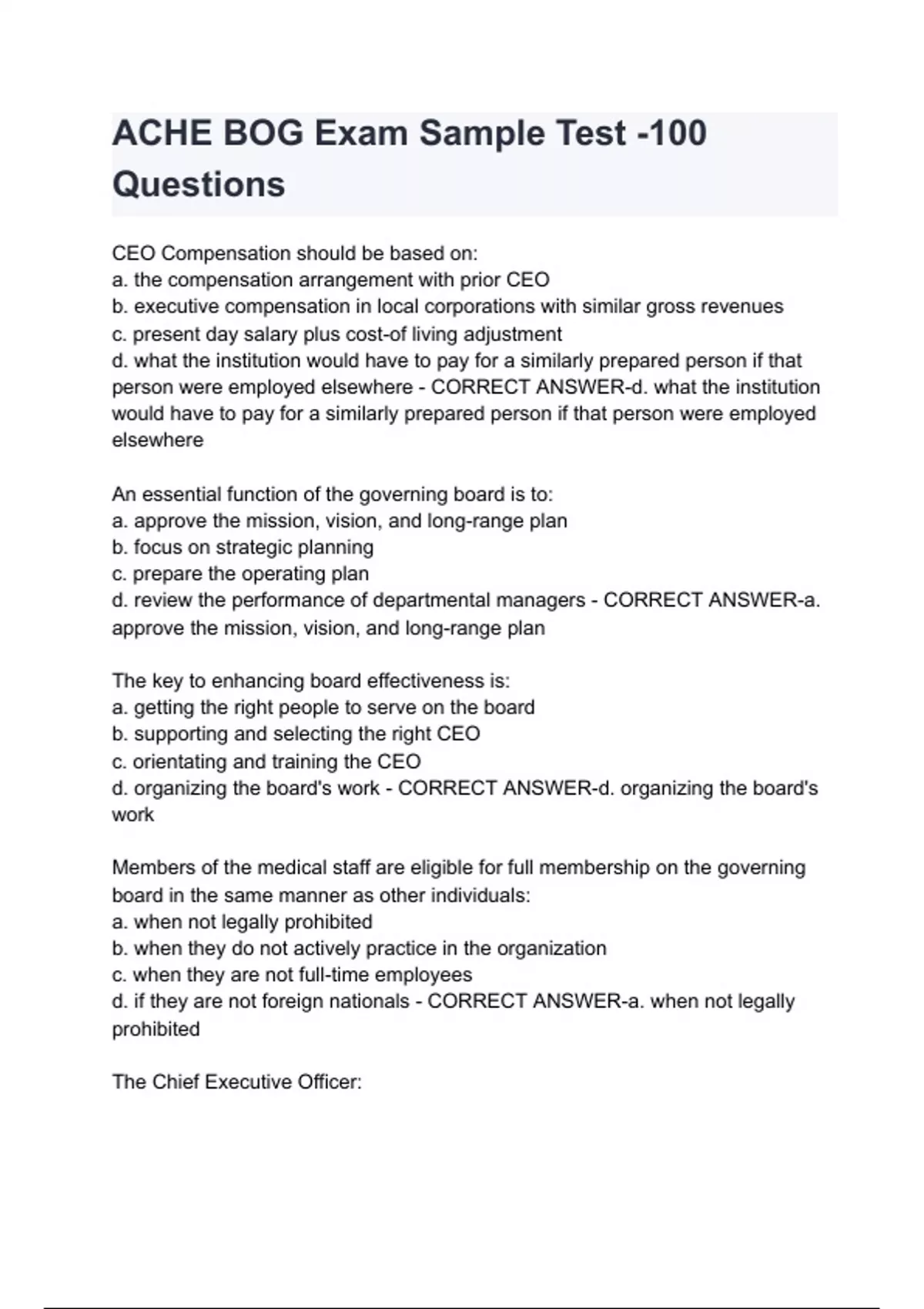 ACHE BOG Exam Sample Test -100 Questions & answers