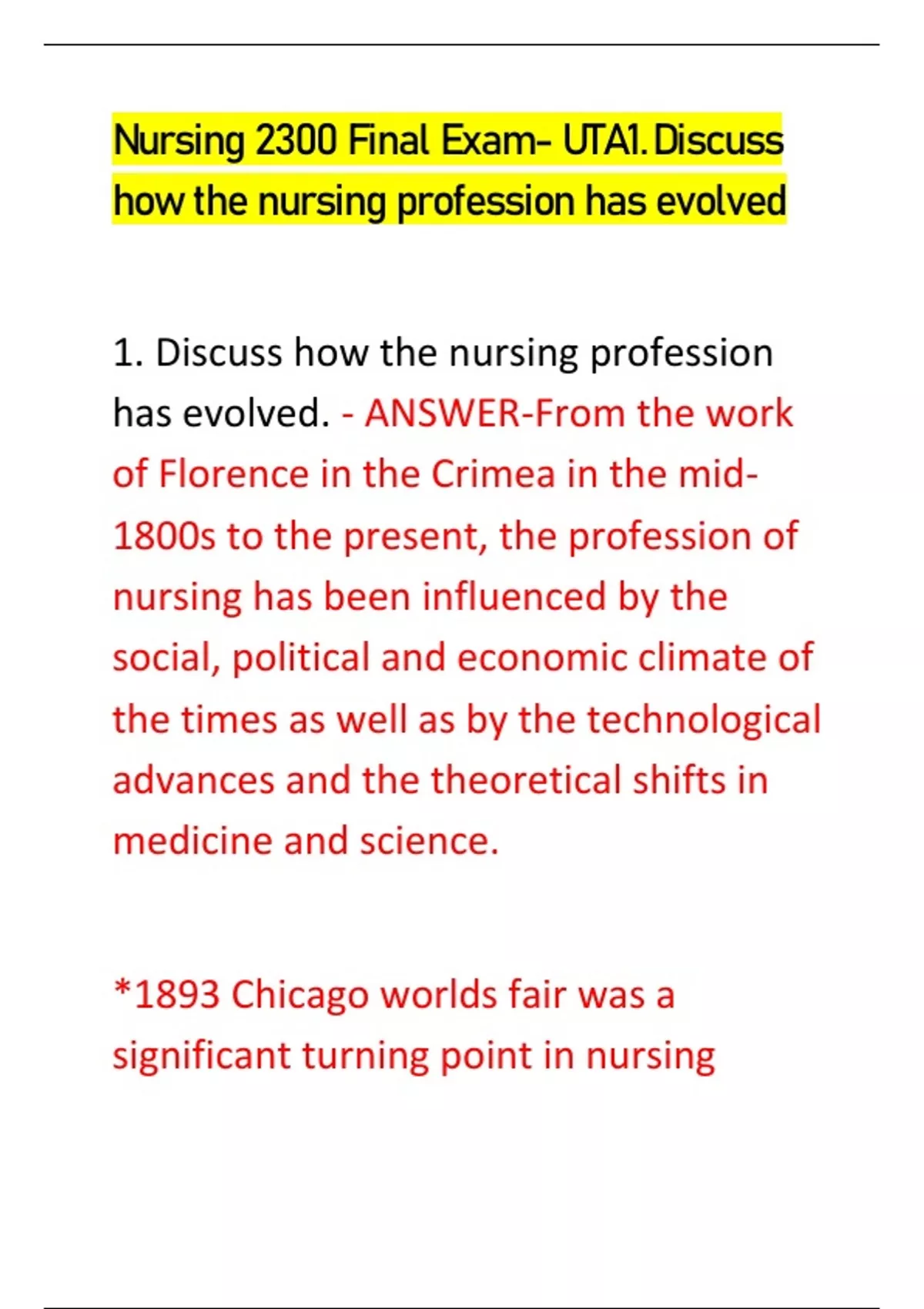 Nursing 2300 Final Exam- UTA1.Discuss how the nursing profession has evolved