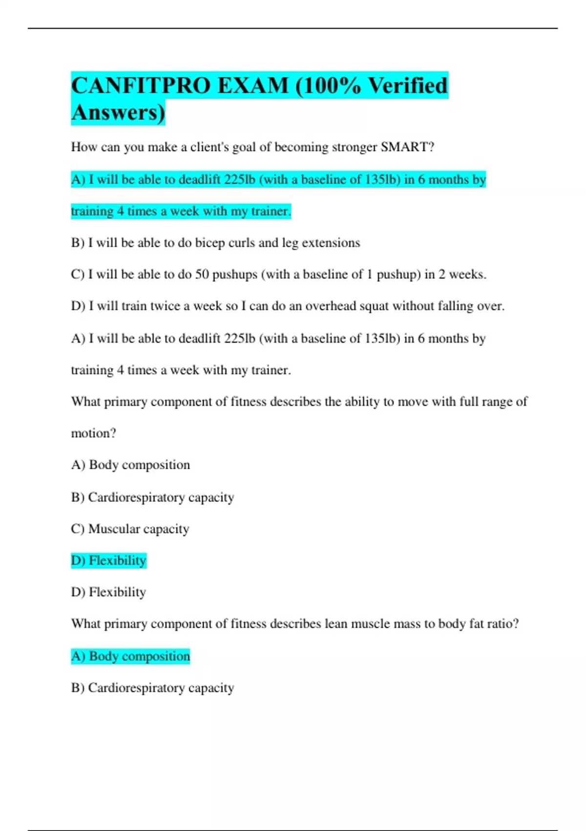 CANFITPRO EXAM (100% Verified Answers) How can you make a client's goal of becoming stronger SMART? A) I will be able to deadlift 225lb (with a baseline of 135lb) in 6 months by training 4 times a week with my trainer. B) I will be able to do bicep curls and leg extensions C) I will be able to do 50 pushups (with a baseline of 1 pushup) in 2 weeks. D) I will train twice a week so I can do an overhead squat without falling over. A) I will be able to deadlift 225lb (with a baseline of 135lb) in 6 months by training 4 times a week with my trainer. What primary component of fitness describes the ability to move with full range of motion? A) Body composition B) Cardiorespiratory capacity C) Muscular capacity D) Flexibility D) Flexibility What primary component of fitness describes lean muscle mass to body fat ratio? A) Body composition B) Cardiorespiratory capacity C) Muscular capacity D) Flexibility A) Body composition What are SMART goals? A) Specific, measurable, attainable/action, realistic, time sensitive B) Specific e.g, I want to be more fit — what does that mean? Measurable; objective units. e.g, I want to be more fit — how much weight do you want to lose? Attainable; frequency. e.g., do you have the time and resources to do it? Realistic e.g., losing 50 pounds in one month is not realistic Time Sensitive e.g., having a 'due date' (e.g., by Jan. 1, 2019) What are the primary components of fitness? A) Cardiorespiratory capacity, muscular capacity, flexibility, body composition B) Body fat percentage, lean muscle mass, nutritional intake, intensity of workouts C) Frequency, intensity, time, type D) Heart rate, blood pressure, strength, flexibility A) Cardiorespiratory capacity, muscular capacity, flexibility, body composition What are the six fundamental movements? 1. Push 2. Pull 3. Bend 4. Rotation 5. Squat 6. Lunge Which of the following is the easiest variation for resistive exercise equipment? A) Bodyweight B) Gravity-assisted devices C) TRX suspension trainers D) Dumbbells B) Gravity-assisted devices Which kind of fundamental movement would a lat pulldown be? A) Push B) Pull C) Rotation D) Bend B) Pull What are the four elements of a strong program design? A) Safe, challenging, effective, sustainable B) Effective, sustainable, enjoyable, efficient C) Safe, efficient, enjoyable, effective D) Effective, challenging, enjoyable, diverse C) Safe, efficient, enjoyable, effective What kind of fundamental movement would a deadlift be? A) Push B) Pull C) Rotation D) Bend (hip hinge) D) Bend (hip hinge) Which kind of fundamental movement would a bench press be? A) Push B) Pull C) Rotation D) Bend (hip hinge) A) Push What kind of fundamental movement would a cable row?