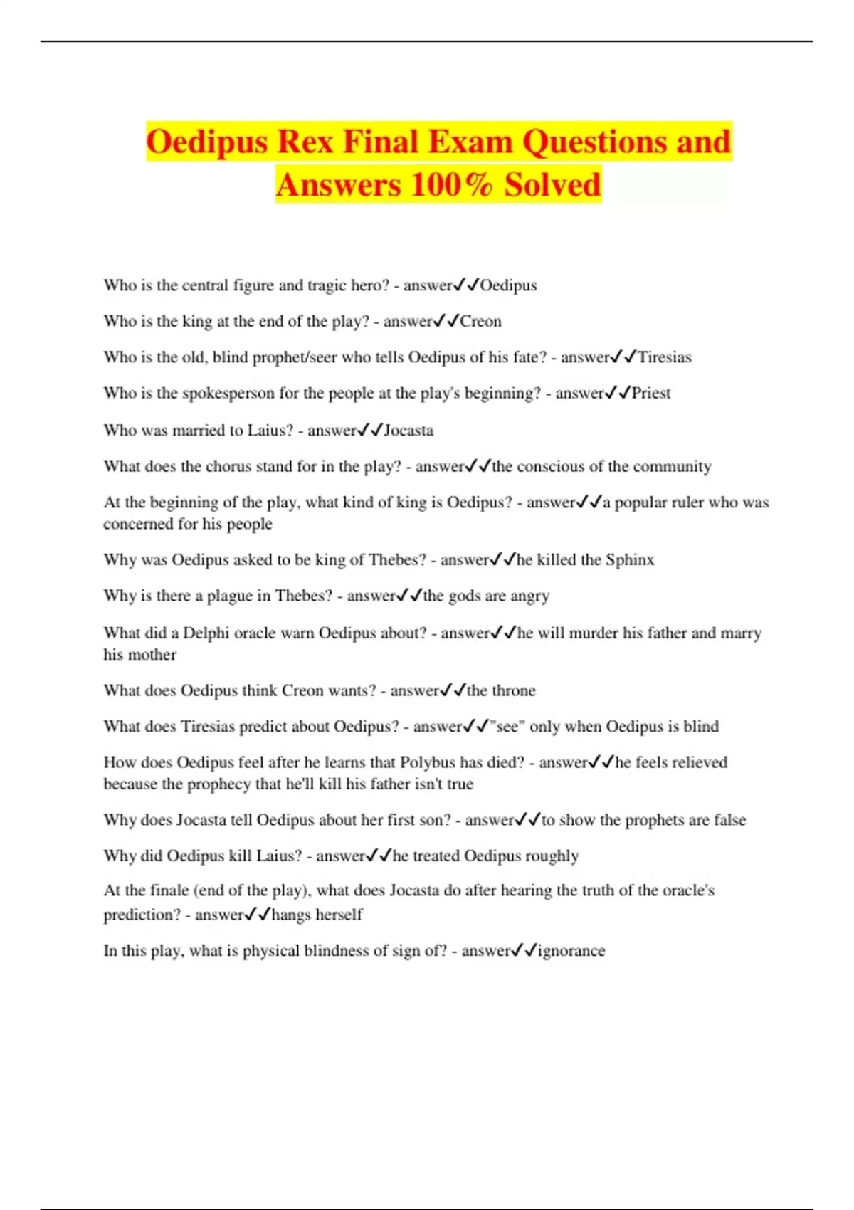 Oedipus Rex Final Exam Questions and Answers 100% Solved