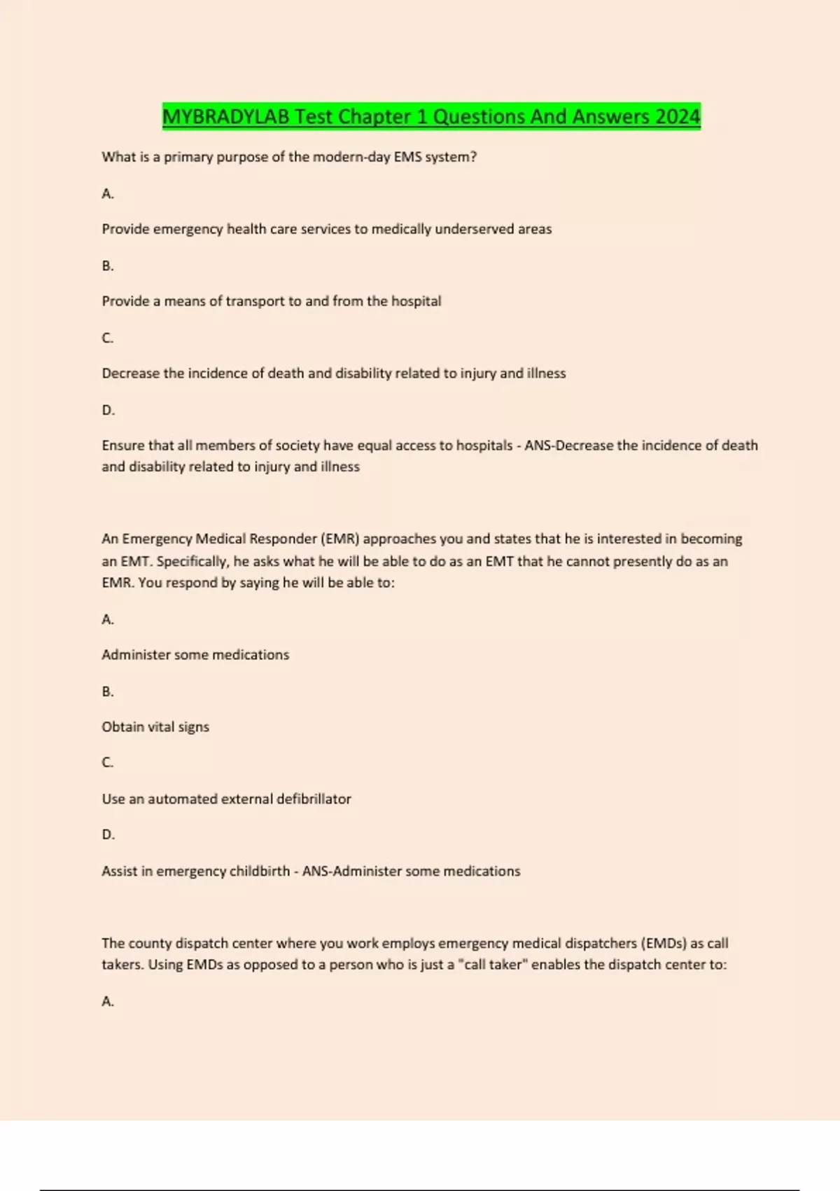 MYBRADYLAB Test Chapter 1 Questions And Answers 2024 What is a primary purpose of the modern-day EMS system? A. Provide emergency health care services to medically underserved areas B. Provide a means of transport to and from the hospital C. Decrease the incidence of death and disability related to injury and illness D. Ensure that all members of society have equal access to hospitals - ANS-Decrease the incidence of death and disability related to injury and illness An Emergency Medical Responder (EMR) approaches you and states that he is interested in becoming an EMT. Specifically, he asks what he will be able to do as an EMT that he cannot presently do as an EMR. You respond by saying he will be able to: A. Administer some medications B. Obtain vital signs C. Use an automated external defibrillator D. Assist in emergency childbirth - ANS-Administer some medications The county dispatch center where you work employs emergency medical dispatchers (EMDs) as call takers. Using EMDs as opposed to a person who is just a "call taker" enables the dispatch center to: A. Process all emergency calls, including those asking for police, fire, and EMS assistance B. Properly utilize an enhanced 911 call-taking system C. Use computer technology when dispatching the closest ambulance...