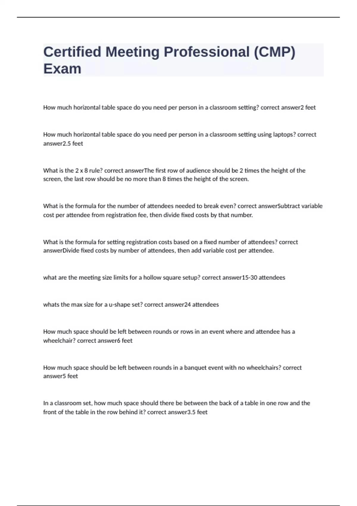 Certified Meeting Professional (CMP) Exam How much horizontal table space do you need per person in a classroom setting? correct answer2 feet How much horizontal table space do you need per person in a classroom setting using laptops? correct answer2.5 feet What is the 2 x 8 rule? correct answerThe first row of audience should be 2 times the height of the screen, the last row should be no more than 8 times the height of the screen. What is the formula for the number of attendees needed to break even? correct answerSubtract variable cost per attendee from registration fee, then divide fixed costs by that number. What is the formula for setting registration costs based on a fixed number of attendees? correct answerDivide fixed costs by number of attendees, then add variable cost per attendee. what are the meeting size limits for a hollow square setup? correct answer15-30 attendees whats the max size for a u-shape set? correct answer24 attendees How much space should be left between rounds or rows in an event where and attendee has a wheelchair? correct answer6 feet How much space should be left between rounds in a banquet event with no wheelchairs? correct answer5 feet In a classroom set, how much space should there be between the back of a table in one row and the front of the table in the row behind it? correct answer3.5 feet What's the maximum number of seats per row and rows per section that you should use in a theatre set? correct answer14 In a theatre set, how much space should be left between adjacent chairs in a row? correct answer2" minimum How many square feet per person for reception? correct answer9-10 sq. ft. What % of sleeping rooms should be accessible? correct answer2% What is the rise to run for stag