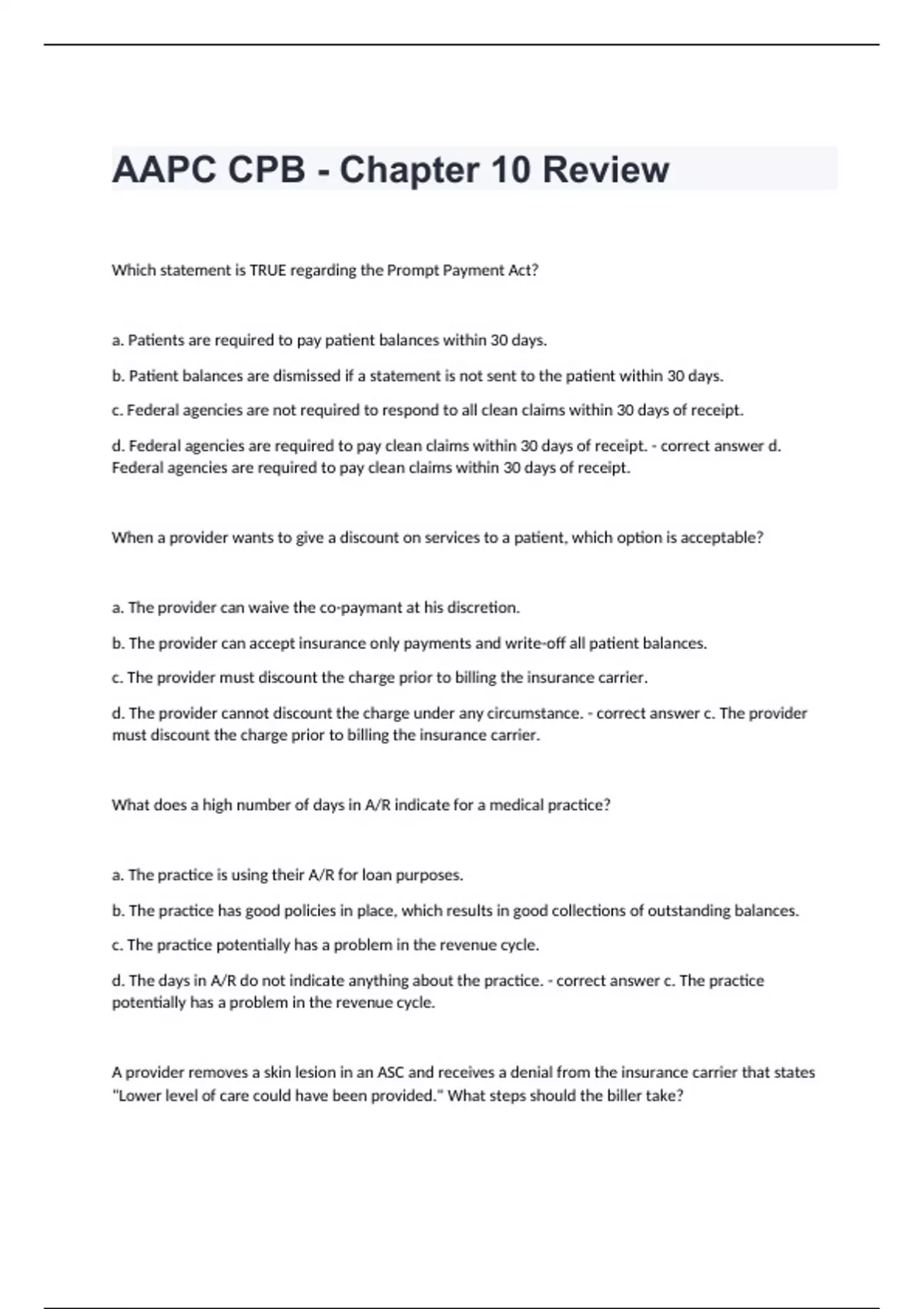 AAPC CPB - Chapter 10 ReviewWhich statement is TRUE regarding the Prompt Payment Act? a. Patients are required to pay patient balances within 30 days. b. Patient balances are dismissed if a statement is not sent to the patient within 30 days. c. Federal agencies are not required to respond to all clean claims within 30 days of receipt. d. Federal agencies are required to pay clean claims within 30 days of receipt. - correct answer d. Federal agencies are required to pay clean claims within 30 days of receipt. When a provider wants to give a discount on services to a patient, which option is acceptable? a. The provider can waive the co-paymant at his discretion. b. The provider can accept insurance only payments and write-off all patient balances. c. The provider must discount the charge prior to billing the insurance carrier. d. The provider cannot discount the charge under any circumstance. - correct answer c. The provider must discount the charge prior to billing the insurance carrier. What does a high number of days in A/R indicate for a medical practice? a. The practice is using their A/R for loan purposes. b. The practice has good policies in place, which results in good collections of outstanding balances. c. The practice potentially has a problem in the revenue cycle. d. The days in A/R do not indicate anything about the practice. - correct answer c. The practice potentially has a problem in the revenue cycle. A provider removes a skin lesion in an ASC and receives a denial from the insurance carrier that states "Lower level of care could have been provided." What steps should the biller take?