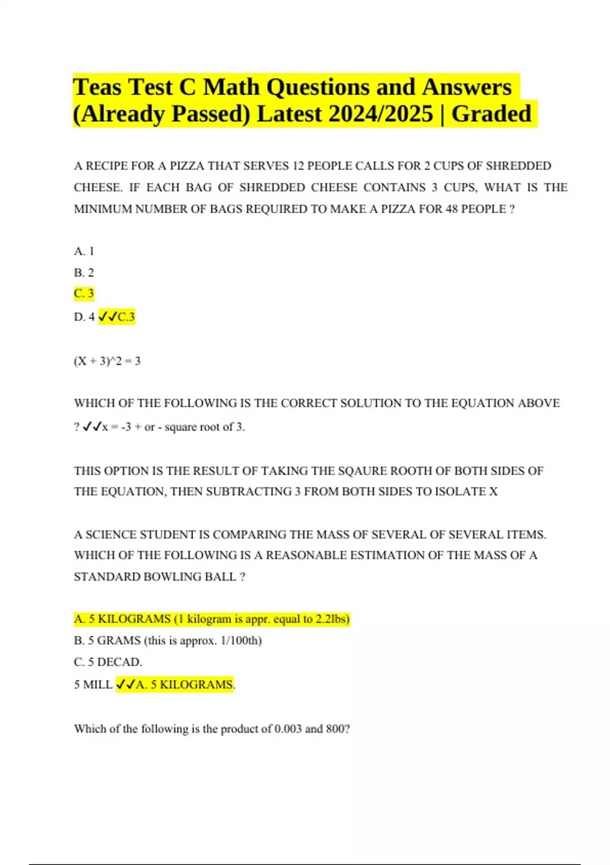 A RECIPE FOR A PIZZA THAT SERVES 12 PEOPLE CALLS FOR 2 CUPS OF SHREDDED CHEESE. IF EACH BAG OF SHREDDED CHEESE CONTAINS 3 CUPS, WHAT IS THE MINIMUM NUMBER OF BAGS REQUIRED TO MAKE A PIZZA FOR 48 PEOPLE ? A. 1 B. 2 C. 3 D. 4 C.3 (X + 3)^2 = 3 WHICH OF THE FOLLOWING IS THE CORRECT SOLUTION TO THE EQUATION ABOVE ? x = -3 + or - square root of 3. THIS OPTION IS THE RESULT OF TAKING THE SQAURE ROOTH OF BOTH SIDES OF THE EQUATION, THEN SUBTRACTING 3 FROM BOTH SIDES TO ISOLATE X A SCIENCE STUDENT IS COMPARING THE MASS OF SEVERAL OF SEVERAL ITEMS. WHICH OF THE FOLLOWING IS A REASONABLE ESTIMATION OF THE MASS OF A STANDARD BOWLING BALL ? A. 5 KILOGRAMS (1 kilogram is appr. equal to 2.2lbs) B. 5 GRAMS (this is approx. 1/100th) C. 5 DECAD. 5 MILL A. 5 KILOGRAMS. Which of the following is the product of 0.003 and 800? Teas Test C Math Questions and Answers (Already Passed) Latest 2024/2025 | Graded A) 0.24 B) 2.4 C) 24 D) 240 B) 2.4 (multiplying 800*3, then moving the decimal point 3 spaces to the left) -7(Y - 4) = -Y - 26 WHICH OF THE FOLLOWING CORRECTLY SOLVES THE EQUATION ABOVE FOR Y ? Y = 9 SIMPLIFY -7(Y-4) -7Y + 28 = -Y - 26 -6Y + 28 = -26 -6Y = -54 Y = 9 Paint brushes cost $2.00 each and tubes of paint cost $3.00 each. If Rebecca has $36 to spend on pain supplies, which of the following inequalities represents how many paint brushes (b) and tubes (t) he can buy? A) 3b = 2t ≤ 36 B) 2b + 3t ≤ 36 C) 2b + 3t ≥ 36 D) 3b + 2t ≥ 36 B) 2b + 3t ≤ 36 because the brushes are $2 each, total cost of the brushes can be represented by 2b, tubes of pain (t) are $3each Which of the following is the product of 0.05 and 0.7? A) 0.0035 B) 0.035 C) 0.35 D) 3.5 B) 0.035 0.05*0.7 or 5*7 and move decimal 3 to the left A basketball player attempts 15 shots during a game. The player misses 7 shots. Which of the following is the percentage of shots the player made, rounded to the nearest percent? A) 19% B) 47% C) 53% D) 21% C) 53% 8/15= 0.53*100 = 53 Which of the following is the equivalent percentage for 66/33? A) 200% B) 50% C) 0.5% D) 0.02% A) 200% 66/33= 2 2*100=200 Solve for the following equation for x.10-4x=2 A) -3 B) -2 C) 2 D) 3 C) 2 subtract both sides by 10 then divide both sides by -4 to solve for x During which months is the average temperature in the range of 70° F to 80 ° F?