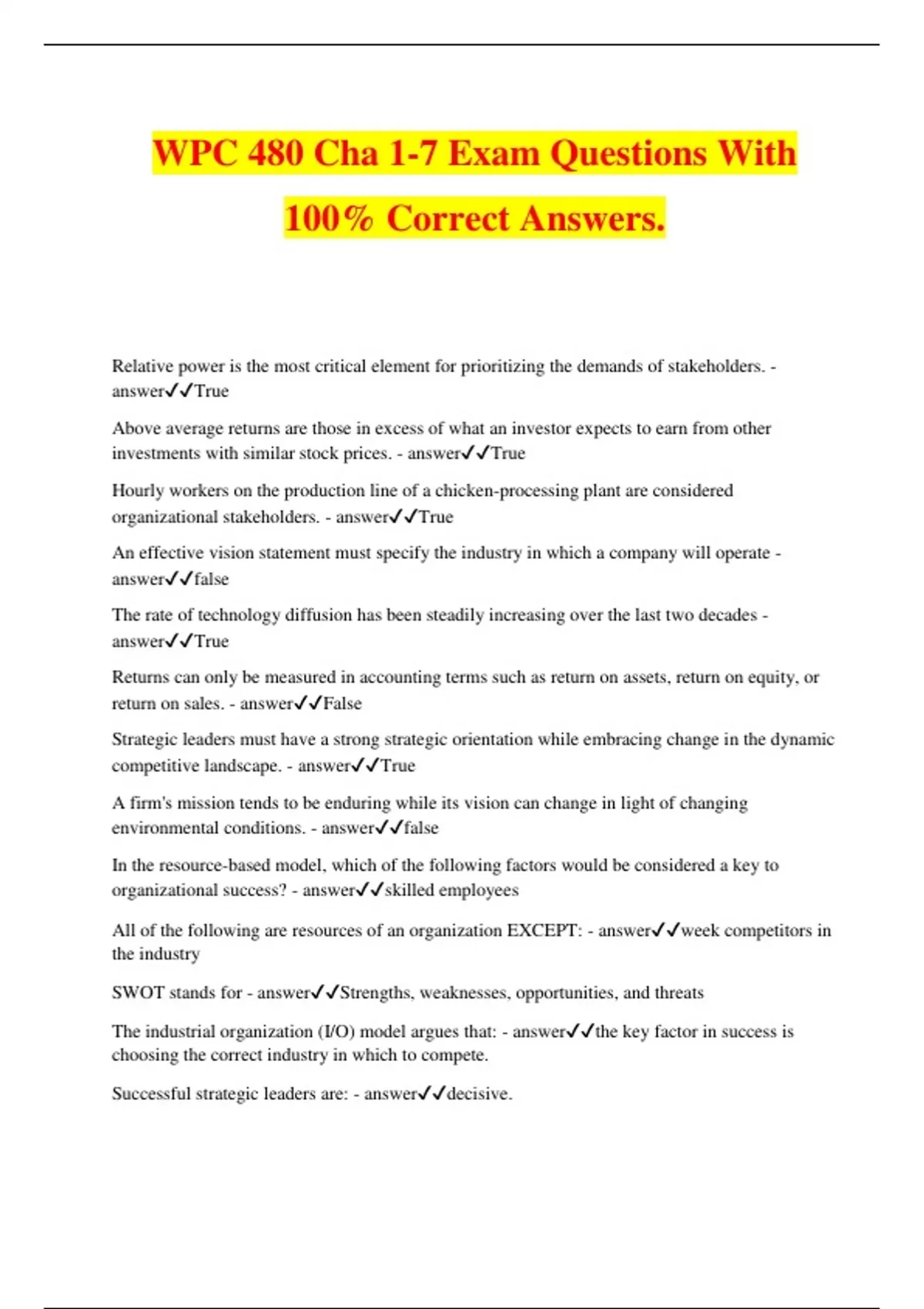 WPC 480 Cha 1-7 Exam Questions With 100% Correct Answers. Relative power is the most critical element for prioritizing the demands of stakeholders. - answerTrue Above average returns are those in excess of what an investor expects to earn from other investments with similar stock prices. - answerTrue Hourly workers on the production line of a chicken-processing plant are considered organizational stakeholders. - answerTrue An effective vision statement must specify the industry in which a company will operate - answerfalse The rate of technology diffusion has been steadily increasing over the last two decades - answerTrue Returns can only be measured in accounting terms such as return on assets, return on equity, or return on sales. - answerFalse Strategic leaders must have a strong strategic orientation while embracing change in the dynamic competitive landscape. - answerTrue A firm's mission tends to be enduring while its vision can change in light of changing environmental conditions. - answerfalse In the resource-based model, which of the following factors would be considered a key to organizational success? - answerskilled employees All of the following are resources of an organization EXCEPT: - answerweek competitors in the industry SWOT stands for - answerStrengths, weaknesses, opportunities, and threats The industrial organization (I/O) model argues that: - answerthe key factor in success is choosing the correct industry in which to compete. Successful strategic leaders are: - answerdecisive. committed to nurturing those around them. committed to helping the firm to create value for all stakeholder groups. In a diversified firm, corporate-level strategy is concerned with: - answerdetermining in which businesses to compete and how resources will be allocated between businesses. The Princeton Alliance Church states in its website that "PAC exists to help you live life to the fullest by knowing God, developing community and bringing hope." This pronouncement is most precisely a statement of organizational: - answervision The global economy, globalization, rapid technological change, and the increasing importance of knowledge are creating the need to: - answerdelegate strategic responsibilities to employees "closer to the action." The I/O model is grounded in: - answereconomies Product market stakeholders include the firm's customers, and the principal concern of this stakeholder group is: - answerobtaining reliable products at the lowest possible price. Organizational culture is a complex set of ideologies, symbols, and core values that are shared throughout the firm, but its development is so subtle and poorly understood that top managers cannot influence its content. - answerFALSE Rewarding those who use proper channels and procedures to report observed wrongdoings is an example of an action that should be taken by a strategic leader to develop an ethical organizational culture. - answerTRUE The decision-making discretion of top-level managers is determined partly by external environmental factors such as the industry structure, the industry's rate of growth, and the degree to which products can be differentiated. - answerTRUE Employees usually have a strong preference for firms to use the internal managerial labor market when selecting top management team members and the CEO. - answerTRUE In the past, companies had a preference for insiders to fill top-level management positions because of the desire for continuity and a continuing commitment to the firm's current vision, mission, and chosen strategies. - answerTRUE Members with substantive expertise in the firm's core functions and businesses aid the effectiveness of the top management team. - answerTRUE Transformational leadership is the most effective strategic leadership style. - answerTRUE The training of future strategic leaders yields a competitive advantage for a firm, in part because knowledge and skills are necessary for successful execution of strategy. - answerTRUE An emphasis on strategic controls encourages managers to be risk averse. - answerFALSE The CEO of YorkMark, Inc., has an exceptional amount of power in the organization. It is likely the Board of Directors is composed of sympathetic outside members and insiders who report to the CEO. - answerTRUE Human capital refers to - answerknowledge and skills of the firm's work force. Competitive aggressiveness describes a firm's: - answerpropensity to take actions that allow it to outperform rivals consistently and substantially. Billy Kroghmen is the son of a very prominent Fortune 500 CEO. Billy has had troubles. He failed out of multiple colleges, universities, and correspondence schools. He finally received his undergraduate degree from a university with only a post office box for an address. He then enrolled in the school's combined graduate accounting and law school programs, graduating with honor with degrees in both areas. After graduation, he twice failed both the CPA and bar exams, managing to set record low scores on the ethics portions of both. Despite these academic setbacks, Billy's career now seems to be thriving. He has been appointed to a number of "blue ribbon" government committees, is on the Board of Directors of two corporations and one prestigious not-for-profit organization. In at least one instance, a donor credited Billy with the idea for making a large contribution to the not-for-profit. Widespread speculation is tha - answerhigh; social; low; human The most effective leadership style is ____ leadership. - answertransformational Actions that effective strategic leaders can take to develop an ethical organizational culture include all of the following EXCEPT: - answerrelying on the fundamental goodness of individuals. The Enron employee who reported the financial manipulations at the company to her superiors can be considered to have engaged in: - answeran act of courage ____ capital increases cooperation among individuals inside and outside 