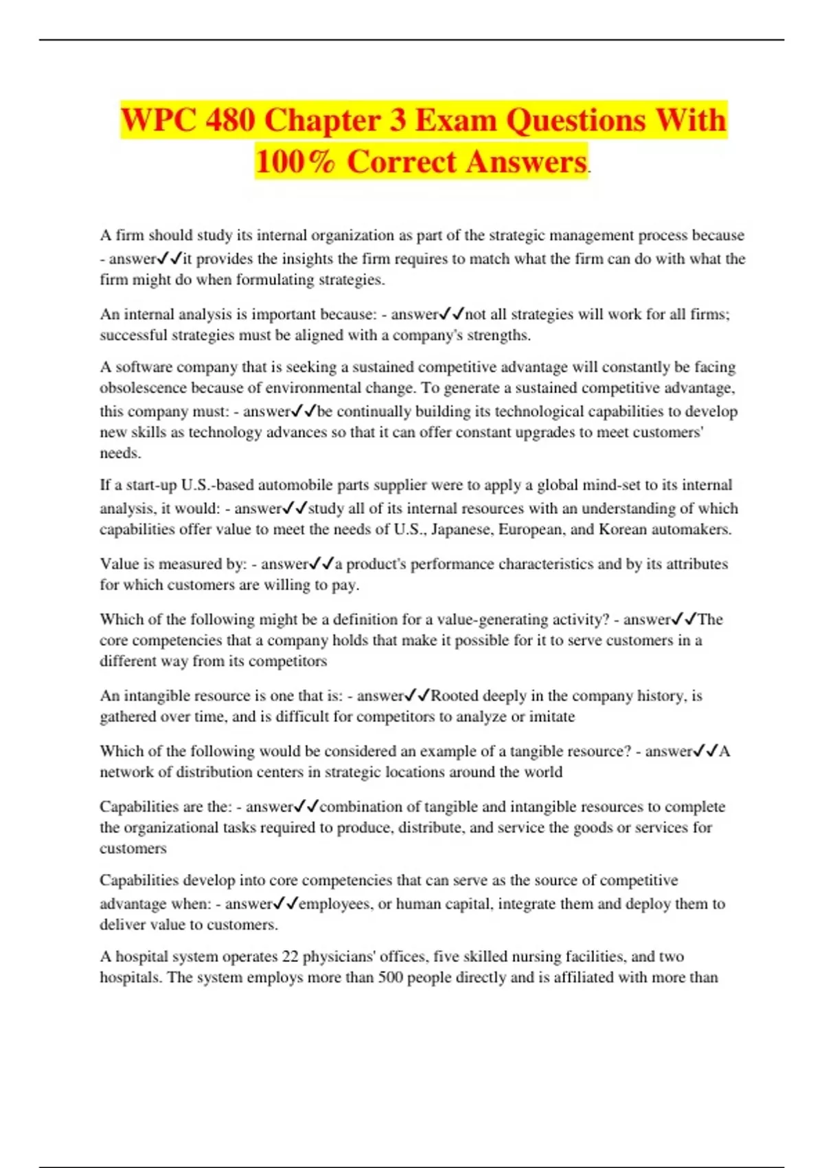 WPC 480 Chapter 3 Exam Questions With 100% Correct Answers. A firm should study its internal organization as part of the strategic management process because - answerit provides the insights the firm requires to match what the firm can do with what the firm might do when formulating strategies. An internal analysis is important because: - answernot all strategies will work for all firms; successful strategies must be aligned with a company's strengths. A software company that is seeking a sustained competitive advantage will constantly be facing obsolescence because of environmental change. To generate a sustained competitive advantage, this company must: - answerbe continually building its technological capabilities to develop new skills as technology advances so that it can offer constant upgrades to meet customers' needs. If a start-up U.S.-based automobile parts supplier were to apply a global mind-set to its internal analysis, it would: - answerstudy all of its internal resources with an understanding of which capabilities offer value to meet the needs of U.S., Japanese, European, and Korean automakers. Value is measured by: - answera product's performance characteristics and by its attributes for which customers are willing to pay. Which of the following might be a definition for a value-generating activity? - answerThe core competencies that a company holds that make it possible for it to serve customers in a different way from its competitors An intangible resource is one that is: - answerRooted deeply in the company history, is gathered over time, and is difficult for competitors to analyze or imitate Which of the following would be considered an example of a tangible resource? - answerA network of distribution centers in strategic locations around the world Capabilities are the: - answercombination of tangible and intangible resources to complete the organizational tasks required to produce, distribute, and service the goods or services for customers Capabilities develop into core competencies that can serve as the source of competitive advantage when: - answeremployees, or human capital, integrate them and deploy them to deliver value to customers. A hospital system operates 22 physicians' offices, five skilled nursing facilities, and two hospitals. The system employs more than 500 people directly and is affiliated with more than 100 additional physicians. The system offers a wide breadth of medical services, including all of the major specialties. The system was recently recognized as the top cardiac hospital in the state. Which of the following represents the company's capabilities? - answerIts complete list of medical services An industrial fabrication firm has purchased a facility capable of housing large-scale projects— as long as 120 feet. The firm could develop this tangible resource into a capability by - answeremploying engineers who can design large projects and welders who have expertise in these projects. A resource or capability can be classified as a core competency that can be a source for a sustainable competitive advantage if: - answerit is different and better than the way a competitor is executing the same capability. A capability is nonsubstitutable when: - answerIt does not have strategic equivalents. A company owns a patent, with six more years of protection, on a prescription medication that is used by people around the world. This resource is: - answerRare and valuable Which of the following capabilities meets the criteria for being a core competency, in that it is rare, valuable, costly to imitate, and nonsubstitutable? - answerCompany history and brand A capability can be considered costly to imitate when - answerit is developed because of unique historical conditions. A company is analyzing its value chain to discover its value-creating activities. While formulating its strategy, the firm will: - answerconsider the operational functions and support functions to determine which activities contribute the greatest value in the product or service being sold to customers. Outsourcing is the: - answerpurchase of a value-creating activity or support function activity from an external supplier. An attorney has grown his law firm, gaining new clients in two diverse areas—estate law and immigration law. He's not sure which specialty will become his focus in the long run. At the same time, he believes he has enough work to support hiring a paralegal. However, he is having trouble hiring a paralegal who can manage both types of clients. He was able to find a freelance paralegal referral service that connects attorneys to paralegals who have experience in a variety of specialties. He might consider outsourcing through the referral service because: - answerit provides him with the flexibility to gain capabilities to serve both types of clients without making a long-term investment A nonprofit organization is focused on providing mental health services to the homeless in its geographic area. It serves people by ensuring they receive the public assistance they are eligible for and then connects them with care providers that have expertise working with transient patients. The company's primary expenses are the salary and benefits for its staff of social