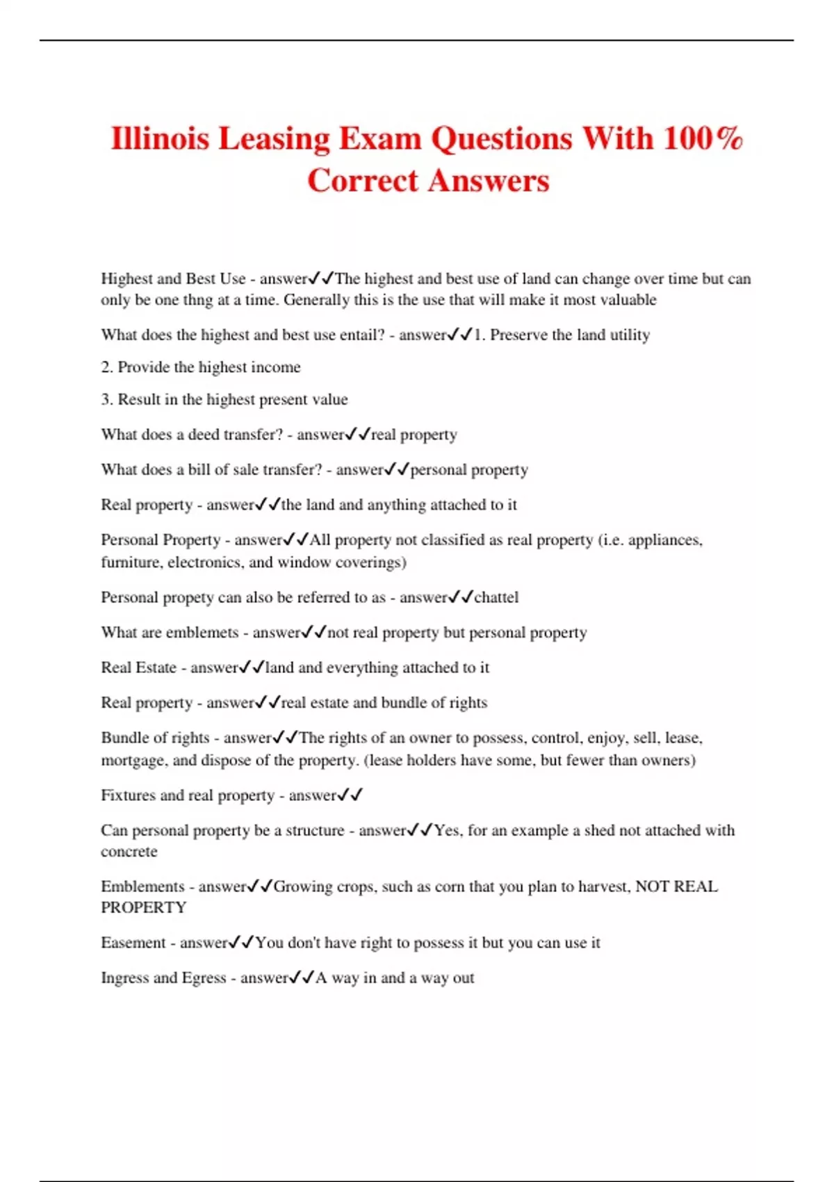 Illinois Leasing Exam Questions With 100% Correct Answers Highest and Best Use - answerThe highest and best use of land can change over time but can only be one thng at a time. Generally this is the use that will make it most valuable What does the highest and best use entail? - answer1. Preserve the land utility 2. Provide the highest income 3. Result in the highest present value What does a deed transfer? - answerreal property What does a bill of sale transfer? - answerpersonal property Real property - answerthe land and anything attached to it Personal Property - answerAll property not classified as real property (i.e. appliances, furniture, electronics, and window coverings) Personal propety can also be referred to as - answerchattel What are emblemets - answernot real property but personal property Real Estate - answerland and everything attached to it Real property - answerreal estate and bundle of rights Bundle of rights - answerThe rights of an owner to possess, control, enjoy, sell, lease, mortgage, and dispose of the property. (lease holders have some, but fewer than owners) Fixtures and real property - answer Can personal property be a structure - answerYes, for an example a shed not attached with concrete Emblements - answerGrowing crops, such as corn that you plan to harvest, NOT REAL PROPERTY Easement - answerYou don't have right to possess it but you can use it Ingress and Egress - answerA way in and a way out License - answerTemporary right to do something on someone else's property Can a license be revoked? - answeryes Liens - answerA claim or charge against the property of another Usually security for a debt Foreclosure to force property Some can be attached to properties and some can be attached to you Priority liens - mechanic or materalmen's liens in Illinois - first ones to be paid - answerIf tenant doesn't pay then in mechanics have 120 days to file in order to get paid Specific liens- against a property - answerMortgages Mechanic's Materialman's Bail Bond Real estate tax Water and sewer General - attaches to all property you own, attaches to person - answerJudgements Writ of attachment Income tax Estate and inheritance tax Gas, electric, cable How long can lien judgements last in IL - answer7 years Air rights - answerowe your property to core of the earth and then above to infinity Surface or Mineral Rights - answerTitle property will tell you if you have this Easement Apartment - answerStays with property and runs with property, not necessarily a part of land Driveways or views Dominant Easement - answerLot 2 serves lot 1 and lot 3 because they need to use their driveway to get to their houses Eminent Domain - answerTaking for the public good Street widening Land for schools Process is called condemnation - answerProcess to take property and give it to someone else Testate - test at the end - answerDies with the will Intestate - dies without a will, escheat is then in process - answerIf kerry were to die without a will, if theres no will then his wife gets half his stuff and kids get other half according to Illinois law Escheat - answerThe state takes property upon an owners death if there is no will & no heirs exist. Real property to county where located Personal property goes to state of IL Agency - answerwhen you represent someone else, principal is who you are representing, I am the agent Universal Agency - answerHandle all affairs Power of attorney - if someone gives power of attorney over real estate that ends once that person dies/is mentally unstable General Agency - answerHandles all affairs of a particular property with limited powers Property managers, Young America Special Agency - answerNarrow authorization to act for principal Listing and selling Common Law Agency - answerFiduciary Duties Accountability Care Obedience Loyalty Disclosure Statutory Duties (to a client) - answerPerform the terms of brokerage agreement Promote best interest of client Exercise reasonable care and skill