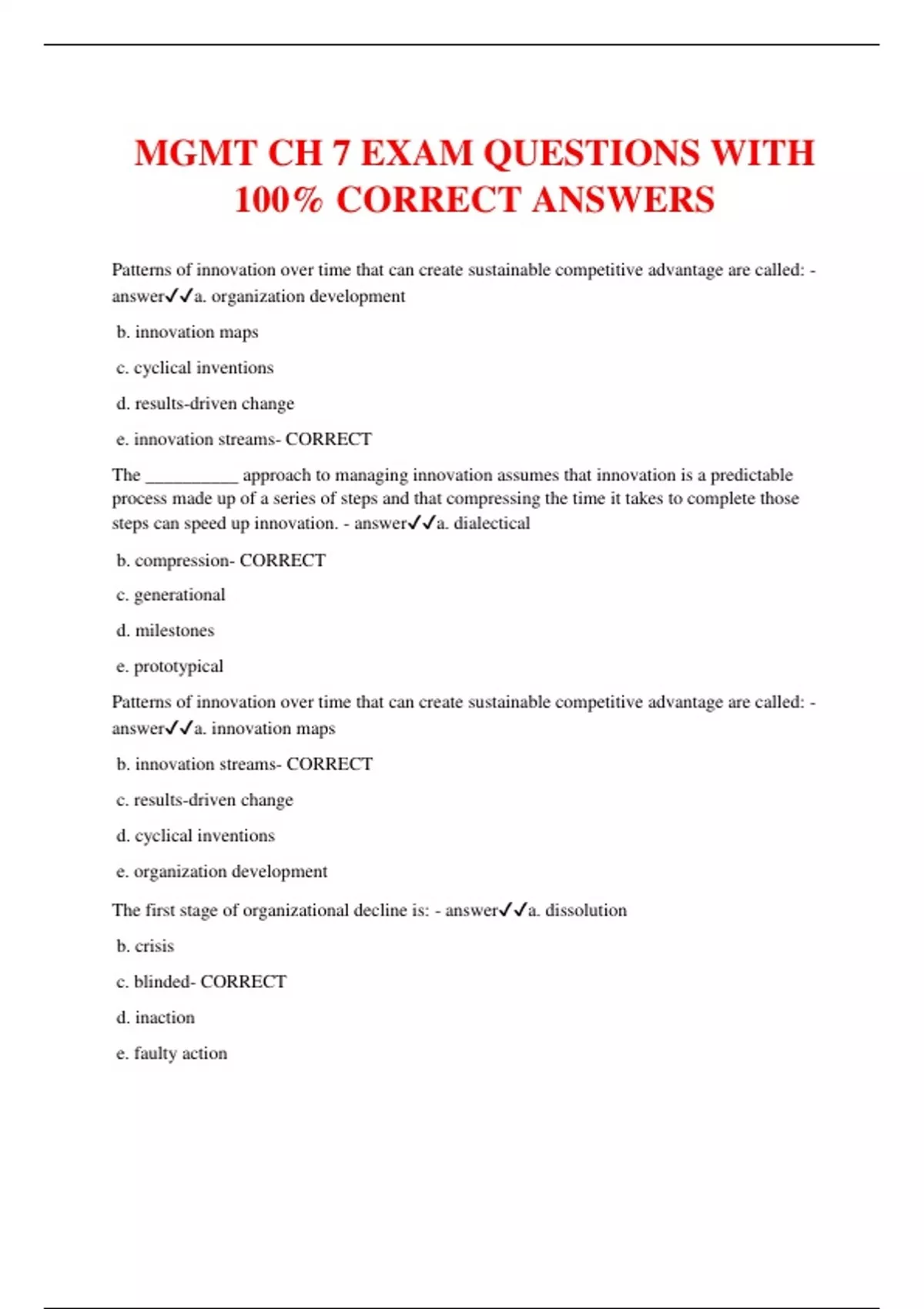MGMT CH 7 EXAM QUESTIONS WITH 100% CORRECT ANSWERS Patterns of innovation over time that can create sustainable competitive advantage are called: - answera. organization development b. innovation maps c. cyclical inventions d. results-driven change e. innovation streams- CORRECT The __________ approach to managing innovation assumes that innovation is a predictable process made up of a series of steps and that compressing the time it takes to complete those steps can speed up innovation. - answera. dialectical b. compression- CORRECT c. generational d. milestones e. prototypical Patterns of innovation over time that can create sustainable competitive advantage are called: - answera. innovation maps b. innovation streams- CORRECT c. results-driven change d. cyclical inventions e. organization development The first stage of organizational decline is: - answera. dissolution b. crisis c. blinded- CORRECT d. inaction e. faulty action Which of the following is one of the three steps in the basic process of managing organizational change outlined by Kurt Lewin? - answera. change definition b. change mentoring c. organizational dialogue d. unfreezing- CORRECT e. incremental change According to John Kotter's analysis of the errors managers make when leading change, the first and potentially most serious of these errors is: - answera. not removing obstacles to the new vision b. not establishing a great enough sense of urgency- CORRECT c. declaring victory too soon d. not anchoring changes in the corporation's culture e. a poorly designed organizational mission Organizational ____ is the successful implementation of creative ideas in organizations. - answera. deployment b. change c. innovation- CORRECT d. development e. creativity Creativity was needed to improve efficiency without raising costs at one automobile maker. Over the last few years, the company has successfully implemented a creative engineering program that allows its plants to produce more than one type of car from the same assembly line. This successful change to a flexible manufacturing system is an example of ____. - answera. corporate synergy b. assembly networking c. organizational innovation- CORRECT d. reverse engineering e. organizational networking The development of the DVD player was a source of ____ to companies in the movie industry just as VHS tapes had once been. - answera. creativity reengineering b. technological replacement
