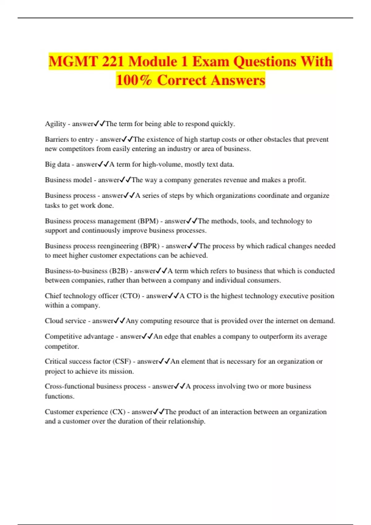 MGMT 221 Module 1 Exam Questions With 100% Correct Answers Agility - answerThe term for being able to respond quickly. Barriers to entry - answerThe existence of high startup costs or other obstacles that prevent new competitors from easily entering an industry or area of business. Big data - answerA term for high-volume, mostly text data. Business model - answerThe way a company generates revenue and makes a profit. Business process - answerA series of steps by which organizations coordinate and organize tasks to get work done. Business process management (BPM) - answerThe methods, tools, and technology to support and continuously improve business processes. Business process reengineering (BPR) - answerThe process by which radical changes needed to meet higher customer expectations can be achieved. Business-to-business (B2B) - answerA term which refers to business that which is conducted between companies, rather than between a company and individual consumers. Chief technology officer (CTO) - answerA CTO is the highest technology executive position within a company. Cloud service - answerAny computing resource that is provided over the internet on demand. Competitive advantage - answerAn edge that enables a company to outperform its average competitor. Critical success factor (CSF) - answerAn element that is necessary for an organization or project to achieve its mission. Cross-functional business process - answerA process involving two or more business functions. Customer experience (CX) - answerThe product of an interaction between an organization and a customer over the duration of their relationship. Cycle time - answerA duration of time which includes process time, during which a unit is acted upon to bring it closer to an output, and delay time, during which a unit of work is spent waiting to take the next action. Data analytics - answerThe technique of qualitatively or quantitatively analyzing a data set to reveal patterns, trends, and associations that often relate to human behavior and interactions, to enhance productivity and bus