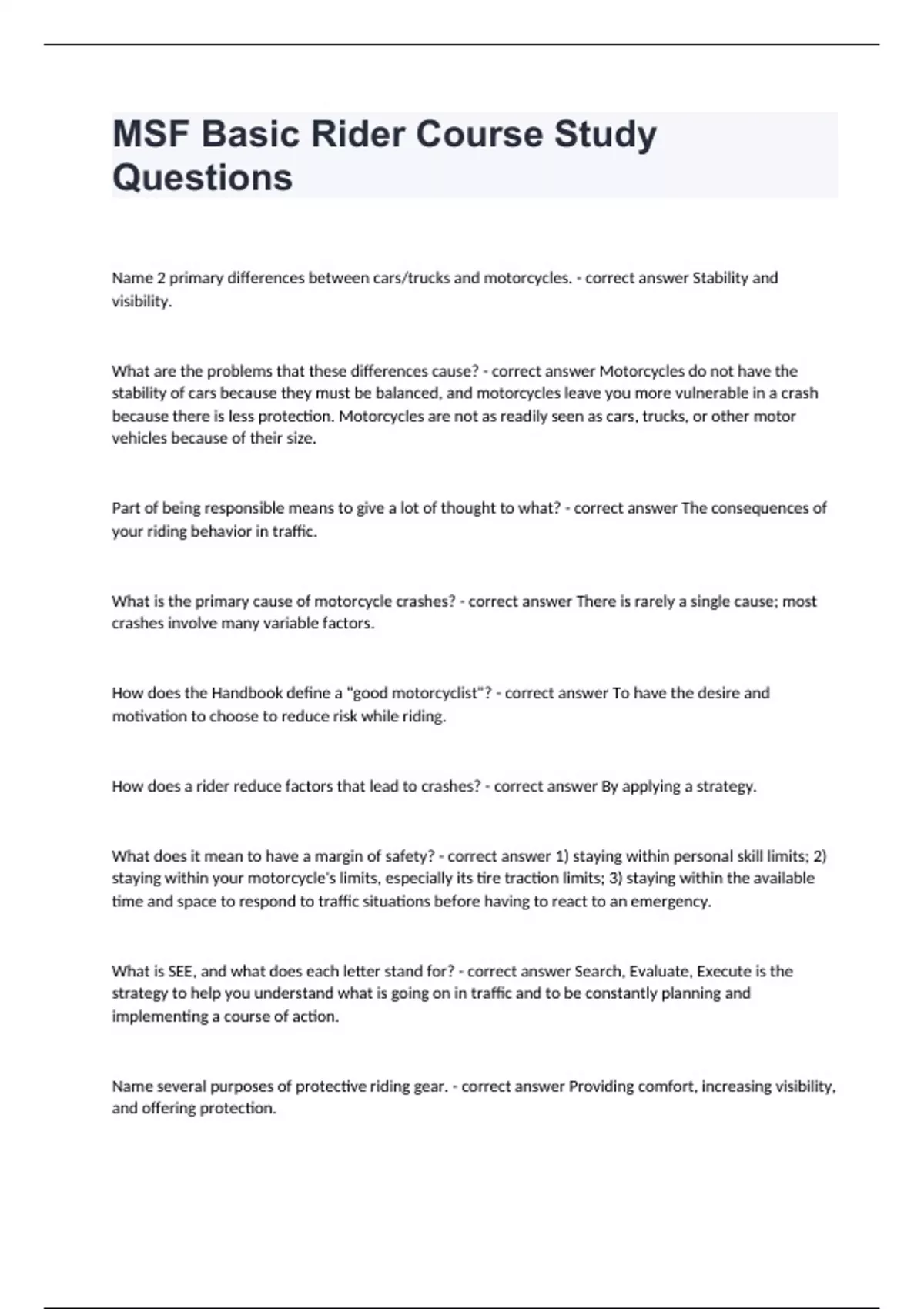 MSF Basic Rider Course Study QuestionsName 2 primary differences between cars/trucks and motorcycles. - correct answer Stability and visibility. What are the problems that these differences cause? - correct answer Motorcycles do not have the stability of cars because they must be balanced, and motorcycles leave you more vulnerable in a crash because there is less protection. Motorcycles are not as readily seen as cars, trucks, or other motor vehicles because of their size. Part of being responsible means to give a lot of thought to what? - correct answer The consequences of your riding behavior in traffic. What is the primary cause of motorcycle crashes? - correct answer There is rarely a single cause; most crashes involve many variable factors. How does the Handbook define a "good motorcyclist"? - correct answer To have the desire and motivation to choose to reduce risk while riding. How does a rider reduce factors that lead to crashes? - correct answer By applying a strategy. What does it mean to have a margin of safety? - correct answer 1) staying within personal skill limits; 2) staying within your motorcycle's limits, especially its tire traction limits; 3) staying within the available time and space to respond to traffic situations before having to react to an emergency. What is SEE, and what does each letter stand for? - correct answer Search, Evaluate, Execute is the strategy to help you understand what is going on in traffic and to be constantly planning and implementing a course of action. Name several purposes of protective riding gear. - correct answer Providing comfort, increasing visibility, and offering protection.