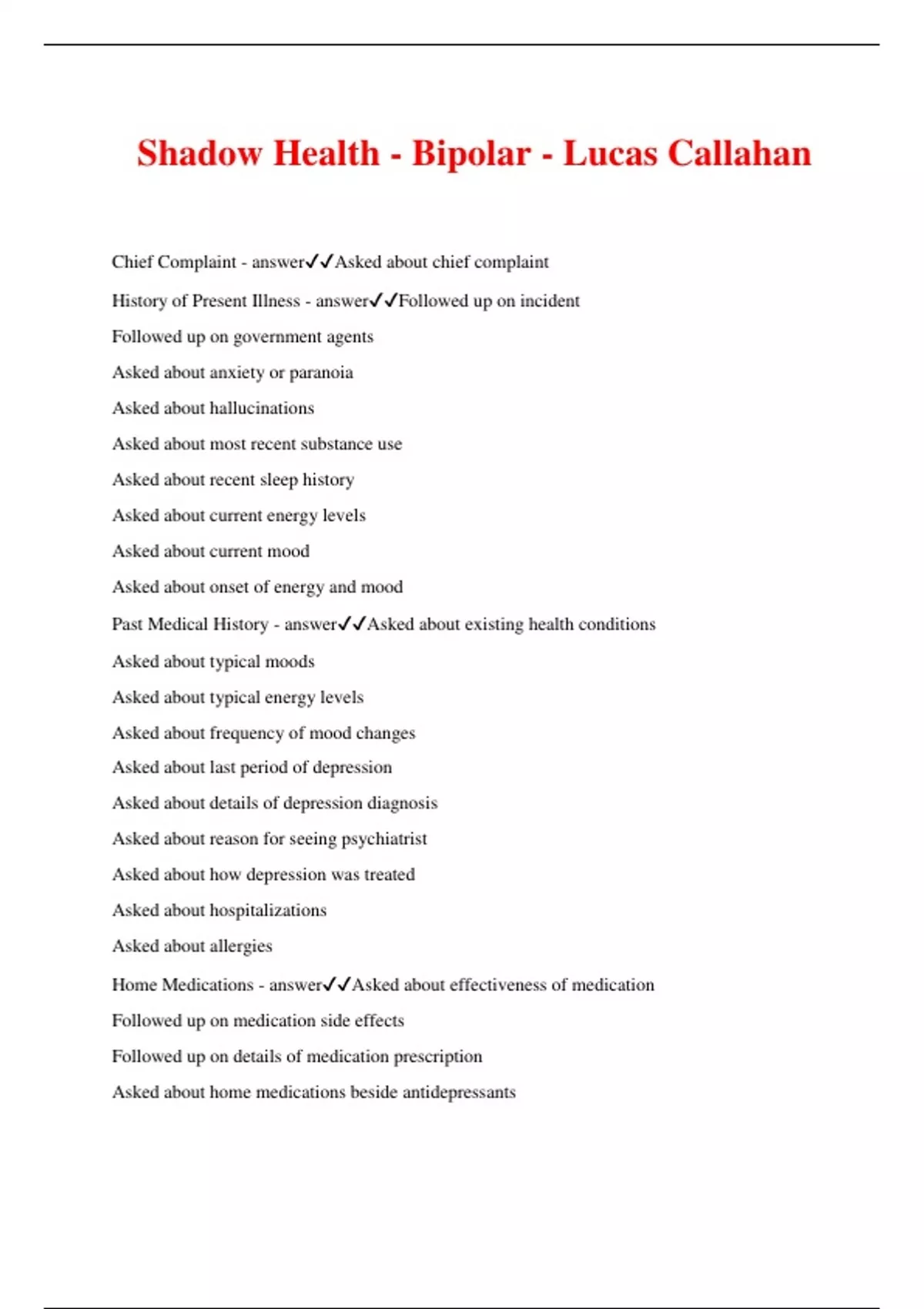 Shadow Health - Bipolar - Lucas Callahan Chief Complaint - answerAsked about chief complaint History of Present Illness - answerFollowed up on incident Followed up on government agents Asked about anxiety or paranoia Asked about hallucinations Asked about most recent substance use Asked about recent sleep history Asked about current energy levels Asked about current mood Asked about onset of energy and mood Past Medical History - answerAsked about existing health conditions Asked about typical moods Asked about typical energy levels Asked about frequency of mood changes Asked about last period of depression Asked about details of depression diagnosis Asked about reason for seeing psychiatrist Asked about how depression was treated Asked about hospitalizations Asked about allergies Home Medications - answerAsked about effectiveness of medication Followed up on medication side effects Followed up on details of medication prescription Asked about home medications beside antidepressants