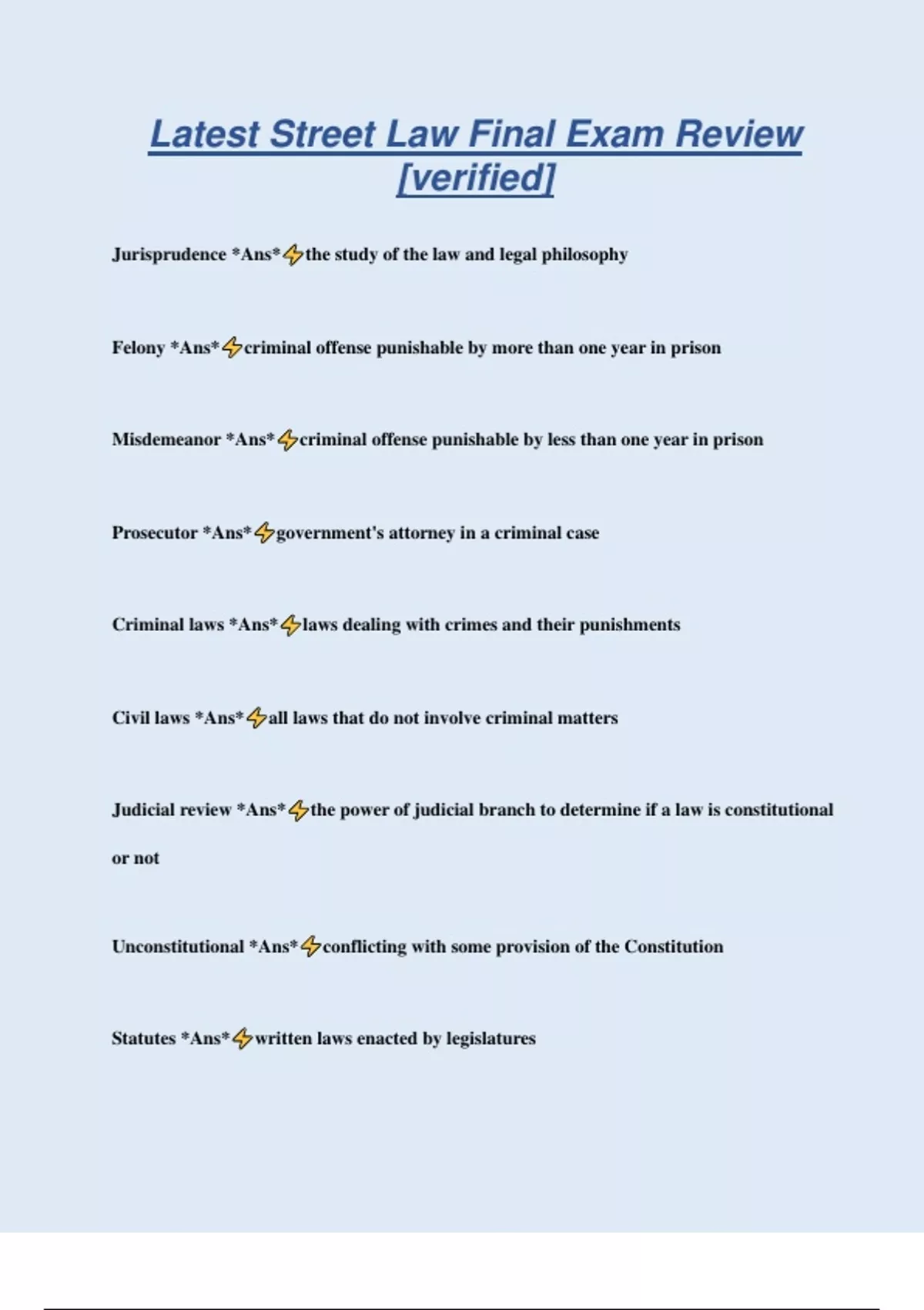 Latest Street Law Final Exam Review [verified] Jurisprudence *Ans* the study of the law and legal philosophy Felony *Ans* criminal offense punishable by more than one year in prison Misdemeanor *Ans* criminal offense punishable by less than one year in prison Prosecutor *Ans* government's attorney in a criminal case Criminal laws *Ans* laws dealing with crimes and their punishments Civil laws *Ans* all laws that do not involve criminal matters Judicial review *Ans* the power of judicial branch to determine if a law is constitutional or not Unconstitutional *Ans* conflicting with some provision of the Constitution Statutes *Ans* written laws enacted by legislatures Moral value *Ans* fundamental questions of right and wrong Economic value *Ans* growth, protection, use, and distribution of wealth Political value *Ans* relationship between government and individuals Social value *Ans* issues important to society Negotiation *Ans* Process by which people in a dispute discuss their problem and try to a solution acceptable to all Settlement *Ans* Agreement before the case goes to trial Arbitration *Ans* Parties in dispute agree to have one or more persons to listen to their arguments and make a decision for them. Decision is binding Mediation *Ans* A third party helps disputing parties talk about their problem and