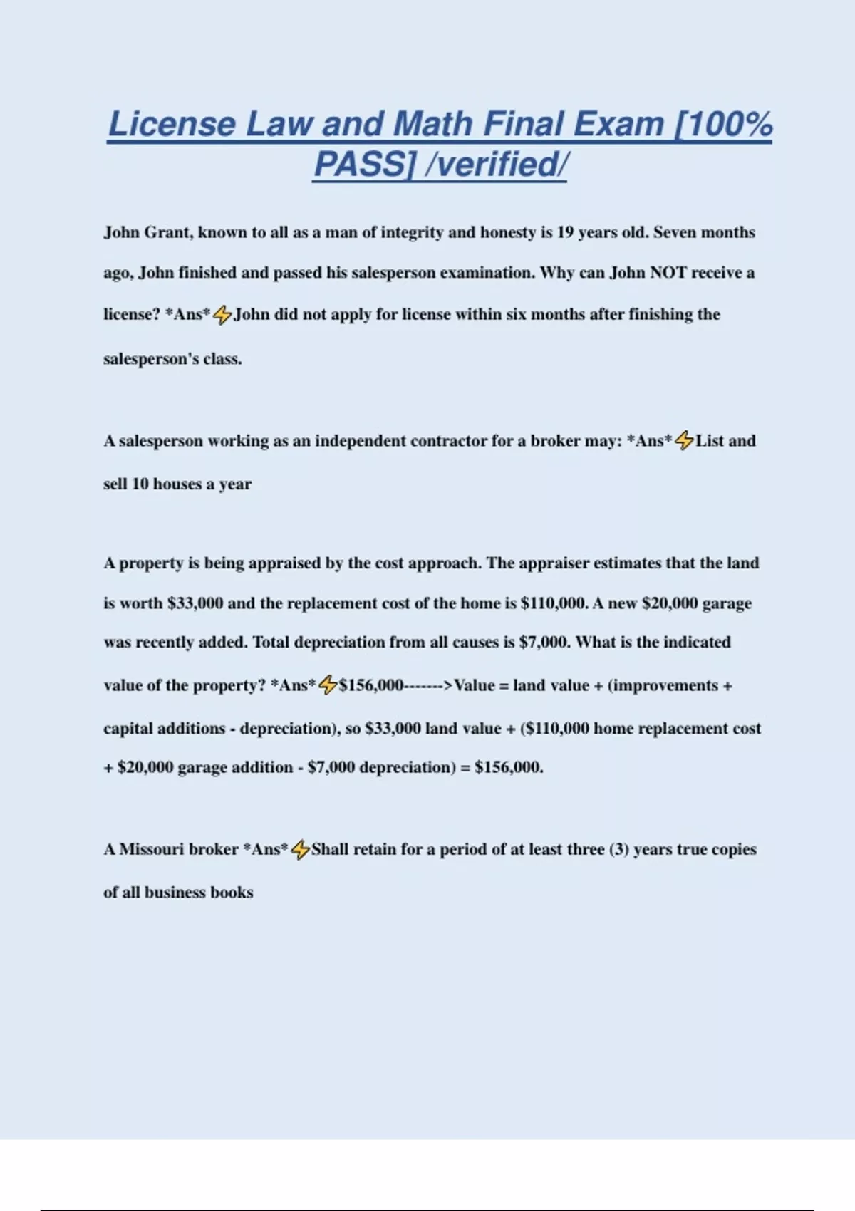 License Law and Math Final Exam [100% PASS] /verified/ John Grant, known to all as a man of integrity and honesty is 19 years old. Seven months ago, John finished and passed his salesperson examination. Why can John NOT receive a license? *Ans* John did not apply for license within six months after finishing the salesperson's class. A salesperson working as an independent contractor for a broker may: *Ans* List and sell 10 houses a year A property is being appraised by the cost approach. The appraiser estimates that the land is worth $33,000 and the replacement cost of the home is $110,000. A new $20,000 garage was recently added. Total depreciation from all causes is $7,000. What is the indicated value of the property? *Ans* $156,000------->Value = land value + (improvements + capital additions - depreciation), so $33,000 land value + ($110,000 home replacement cost + $20,000 garage addition - $7,000 depreciation) = $156,000. A Missouri broker *Ans* Shall retain for a period of at least three (3) years true copies of all business books If a sworn complaint is filed with the MREC alleging misconduct on the part of a licensee, the Commission *Ans* Shall investigate the actions of the licensee against whom the complaint is made A property has sold for $185,000. The listing agreement calls for a commission of 6.5%. The listing broker and selling broker agree to share the commission equally. What will the listing agent receive if the agent is scheduled to get a 65% share from his broker? *Ans* $3,908 Anne obtains a new loan @ 80% of her home's price of $740,000. The loan constant is 5.645. What is Anne's monthly payment? *Ans* $3,342------------------->Monthly payment = (loan amount / 1000) x loan constant. Loan amount = $740,000 x 80%, or $592,000. 592,000 / 1000 = 592 x 5.645 constant = $3,341.84, or $3,342. A property is purchased for $480,000. The land is valued at 10% of the initial purchase price of the property. Given a 39-year depreciation term, what is the annual depreciation expense? *Ans* $11,077 Annual depreciation = beginning depreciable basis (initial property value + capital improvements - land value) / depreciation term. So, ($480,000 - $48,