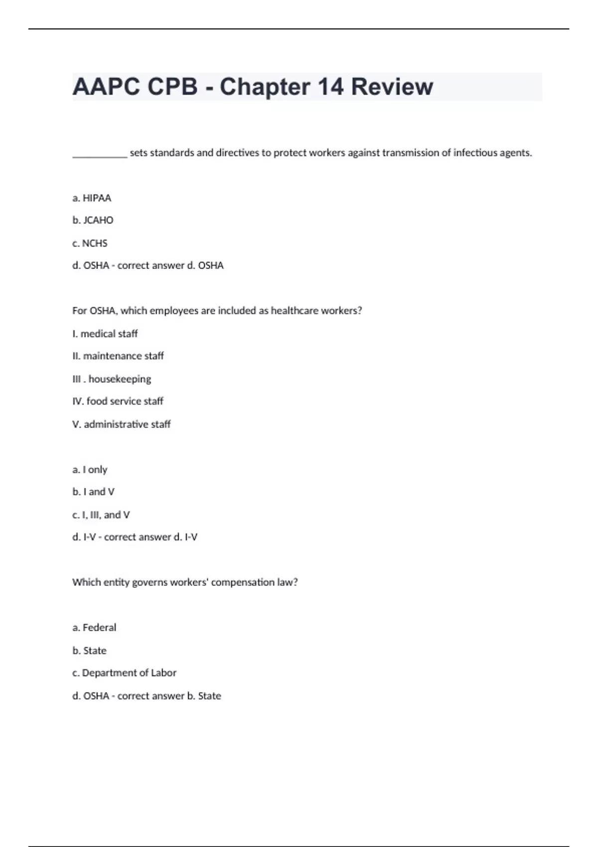 AAPC CPB - Chapter 14 Review__________ sets standards and directives to protect workers against transmission of infectious agents. a. HIPAA b. JCAHO c. NCHS d. OSHA - correct answer d. OSHA For OSHA, which employees are included as healthcare workers? I. medical staff II. maintenance staff III . housekeeping IV. food service staff V. administrative staff a. I only b. I and V c. I, III, and V d. I-V - correct answer d. I-V Which entity governs workers' compensation law? a. Federal b. State c. Department of Labor d. OSHA - correct answer b. State