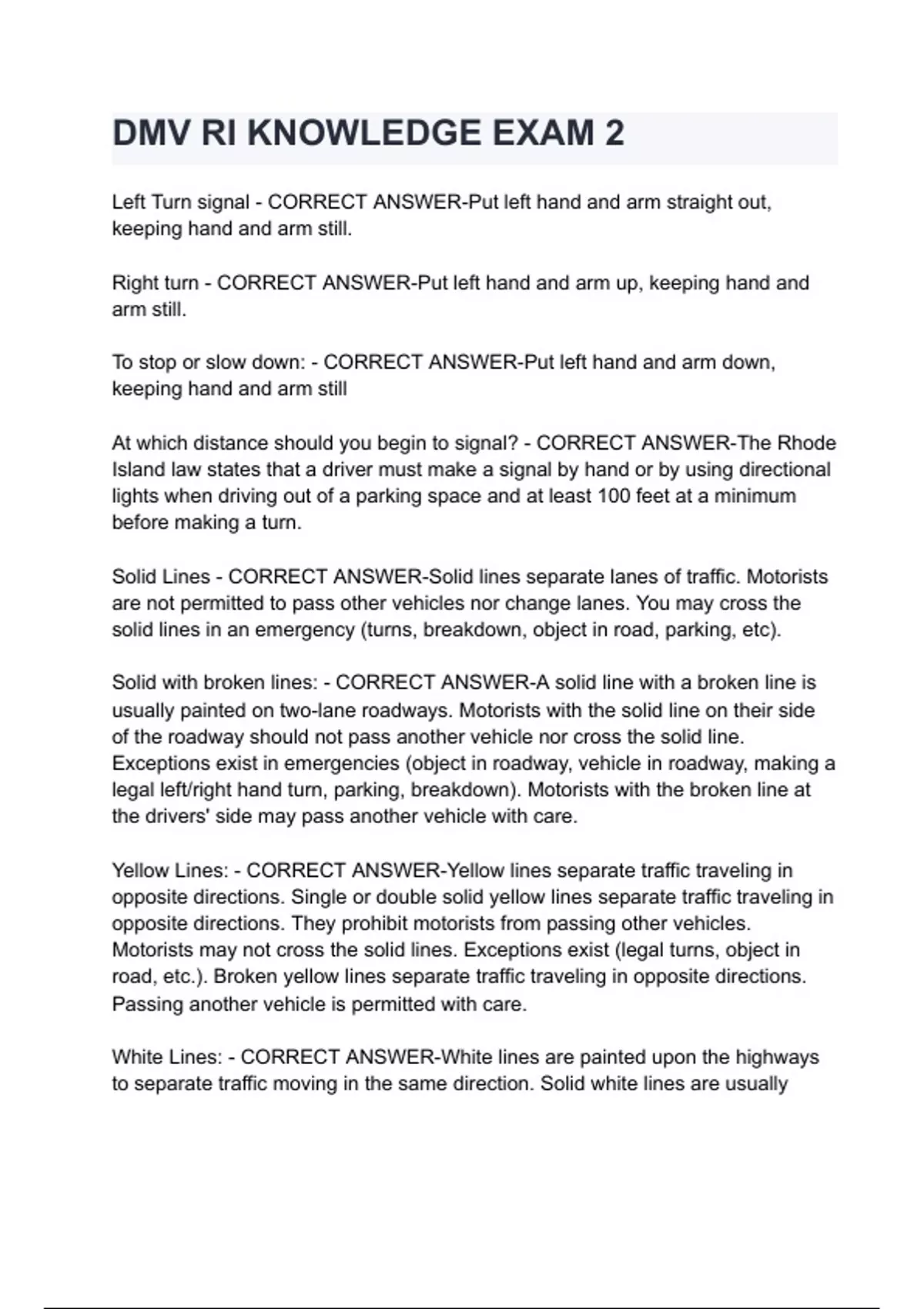 DMV RI KNOWLEDGE EXAM 2 Questions & answers