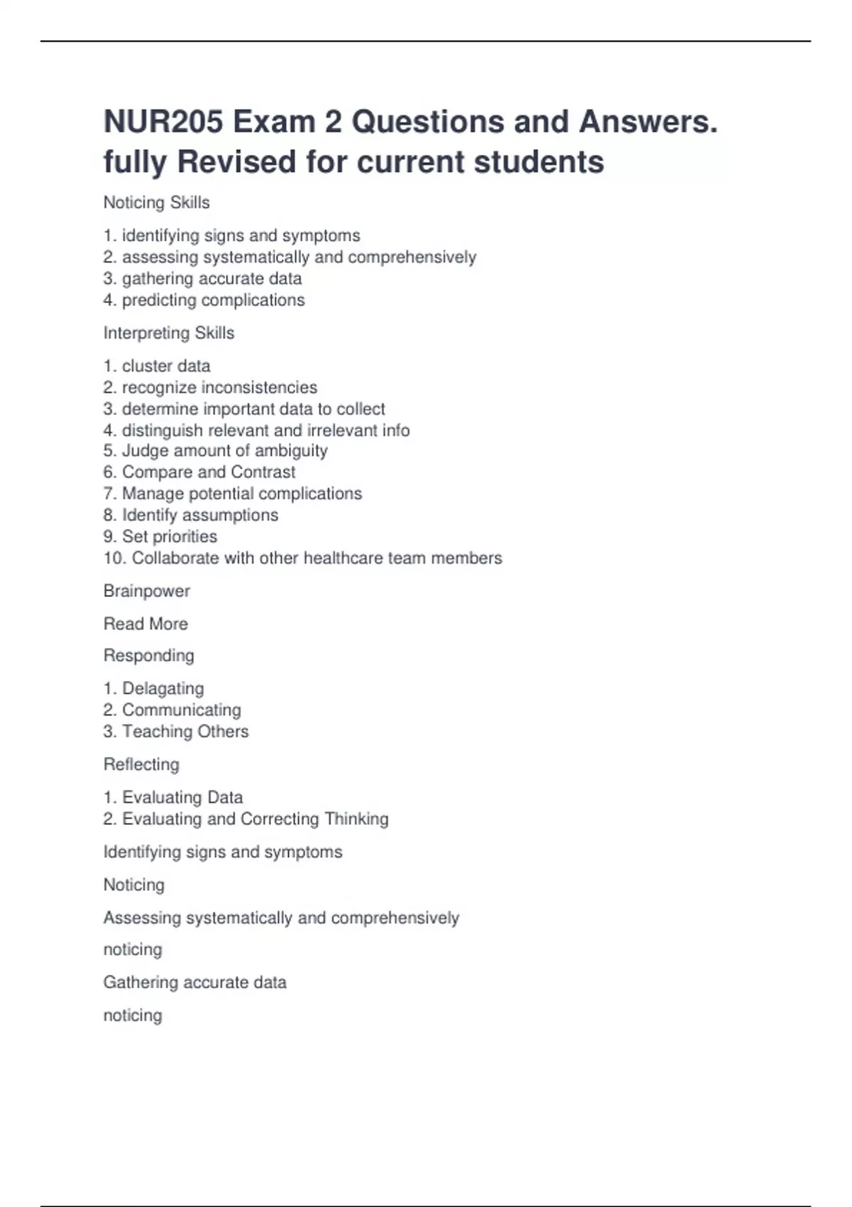 Noticing Skills 1. identifying signs and symptoms 2. assessing systematically and comprehensively 3. gathering accurate data 4. predicting complications Interpreting Skills 1. cluster data 2. recognize inconsistencies 3. determine important data to collect 4. distinguish relevant and irrelevant info 5. Judge amount of ambiguity 6. Compare and Contrast 7. Manage potential complications 8. Identify assumptions 9. Set priorities 10. Collaborate with other healthcare team members Brainpower Read More Responding 1. Delagating 2. Communicating 3. Teaching Others Reflecting 1. Evaluating Data 2. Evaluating and Correcting Thinking Identifying signs and symptoms Noticing Assessing systematically and comprehensively noticing Gathering accurate data noticing predicting potential complications noticing Clustering related information interpreting Recognizing inconsistencies interpreting determining important information to collect interpreting distinguishing relevant from irrelevant data interpreting Judging how much ambiguity is acceptable interpreting Comparing and Contrasting interpreting Managing potential complications interpreting identify assumptions interpreting setting priorities interpreting collaborating with other healthcare members interpreting delagating responding communicating responding teaching others responding evaluating data reflecting Evaluating and correcting thinking reflecting Ethocentrism the belief that one's own group or culture is superior to all other groups or cultures Cultural variables that affect learning 1. Communication 2. Personal Space 3. Social organizations 4. Time 5. Environmental control 6. Biological variations Printed education Materials (PEM) 5th grade level, lay terms Aspects of the developmental stage physical, cognitive, and psycho-social maturation