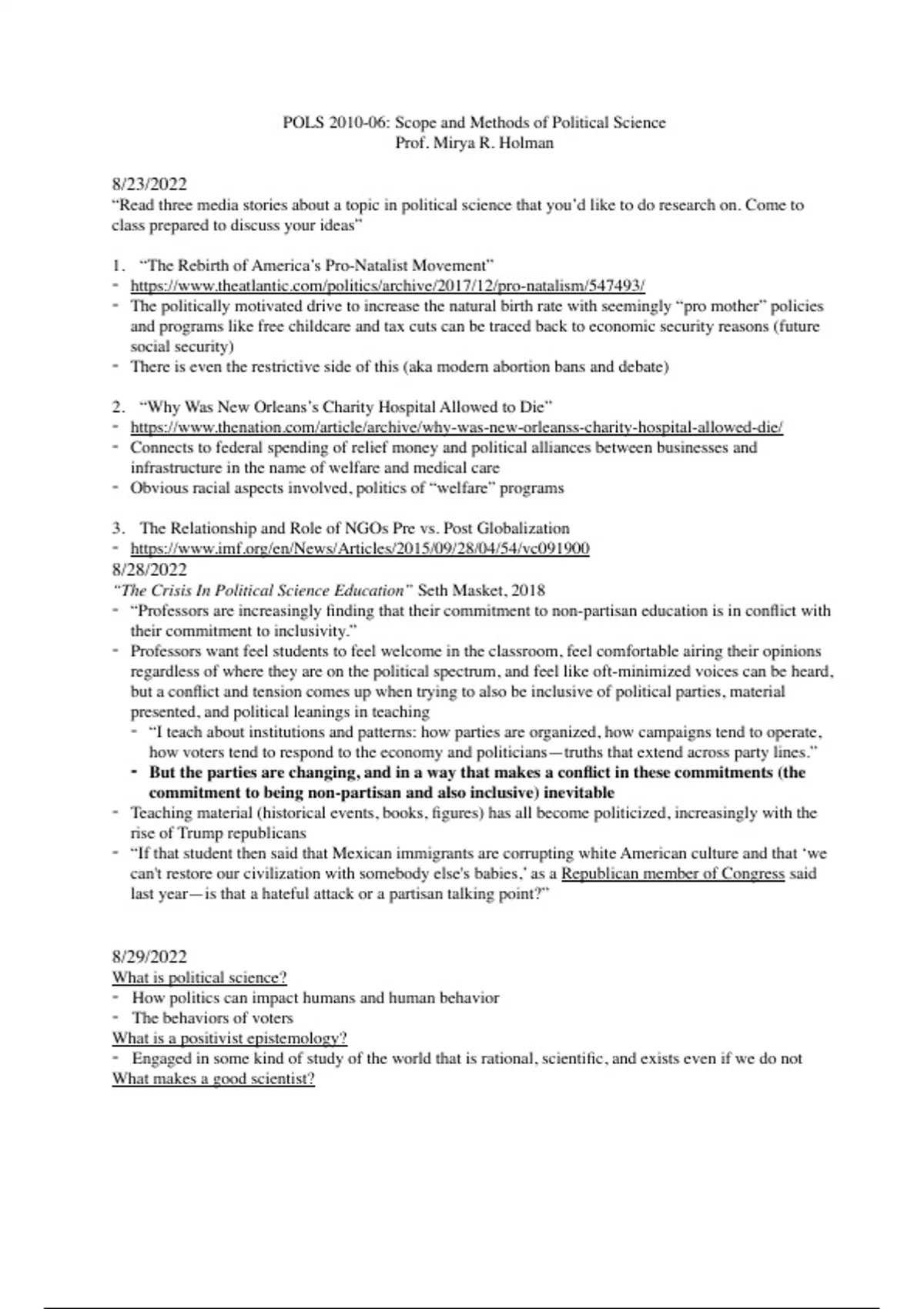 Summary of class notes from the semester for Scopes and Methods class, Political Science major requirement.