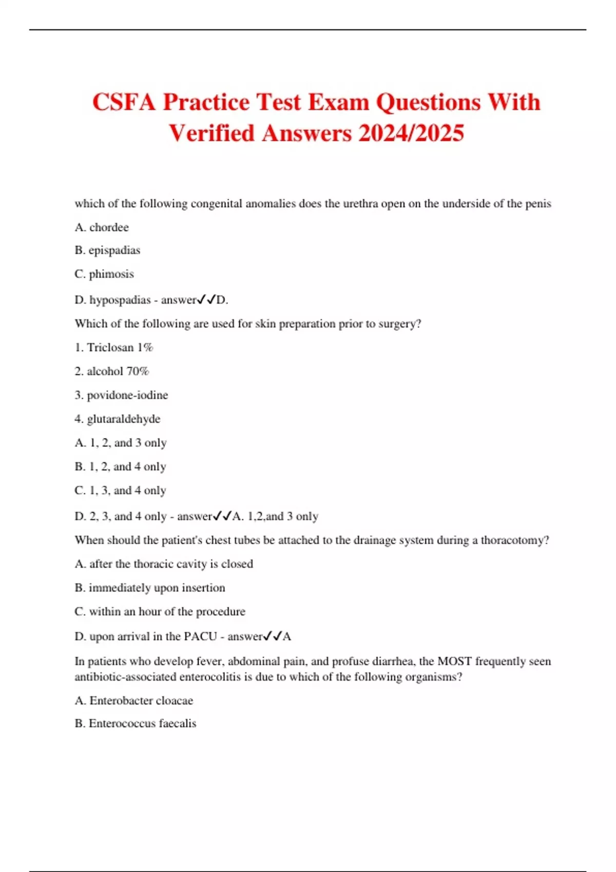 CSFA Practice Test Exam Questions With Verified Answers 2024/2025 which of the following congenital anomalies does the urethra open on the underside of the penis A. chordee B. epispadias C. phimosis D. hypospadias - answerD. Which of the following are used for skin preparation prior to surgery? 1. Triclosan 1% 2. alcohol 70% 3. povidone-iodine 4. glutaraldehyde A. 1, 2, and 3 only B. 1, 2, and 4 only C. 1, 3, and 4 only D. 2, 3, and 4 only - answerA. 1,2,and 3 only When should the patient's chest tubes be attached to the drainage system during a thoracotomy? A. after the thoracic cavity is closed B. immediately upon insertion C. within an hour of the procedure D. upon arrival in the PACU - answerA In patients who develop fever, abdominal pain, and profuse diarrhea, the MOST frequently seen antibiotic-associated enterocolitis is due to which of the following organisms? A. Enterobacter cloacae B. Enterococcus faecalis C. Pseudomonas aeruginosa D Clostridium difficile - answerD During a carotid endarterectomy, the final occlusion clamp to be removed after anastomosis is on the A. common carotid. B. internal carotid. C. external carotid. D. thyroid branch. - answerB. The clamp on the internal carotid artery should be removed last so that all debris left in the area is flushed out through the external carotid artery. During a routine abdominal hysterectomy, the anesthesiologist notes that the patient is becoming progressively tachycardic. He notes that there has been virtually no blood loss. The surgeon requests additional muscle relaxation because the patient's abdominal musculature is "tightening up." The esophageal temperature probe indicates a core body temperature of 103°F (39°C). The anesthesiologist notices that the CO2 monitors are alarming with high levels. The anesthesiologist turns off his anesthetic agent, hyperventilates the patient with 100% oxygen, and administers which of the following drugs? A. succinylcholine B. dantrolene C. atropine D. epinephrine - answerB.The scenario is describing the anesthesia emergency malignant hyperthermia (MH). Dantrolene is the medication given to combat MH (2-3 mg/kg until signs are controlled). Some signs of MH are tachycardia, tachypnea, hypercarbia, muscle stiffness and rigidity, hypoxia, elevated BP, cardiac dysrhythmias, changes in CO2 absorption, and elevated temperature. A pledgeted suture is used for hemostasis in liver injury to A. align the suture placement. B. add bulk to the injury site. C. reduce the likelihood of suture cut- through. D. provide traction for increased exposure. - answerC. Pledgeted sutures (buttresses) are sutures passed through a small patch of reinforcing material (usually Teflon). This type of suture is used in areas where the surgeon considers buffering to be beneficial, particularly in delicate or friable tissue.