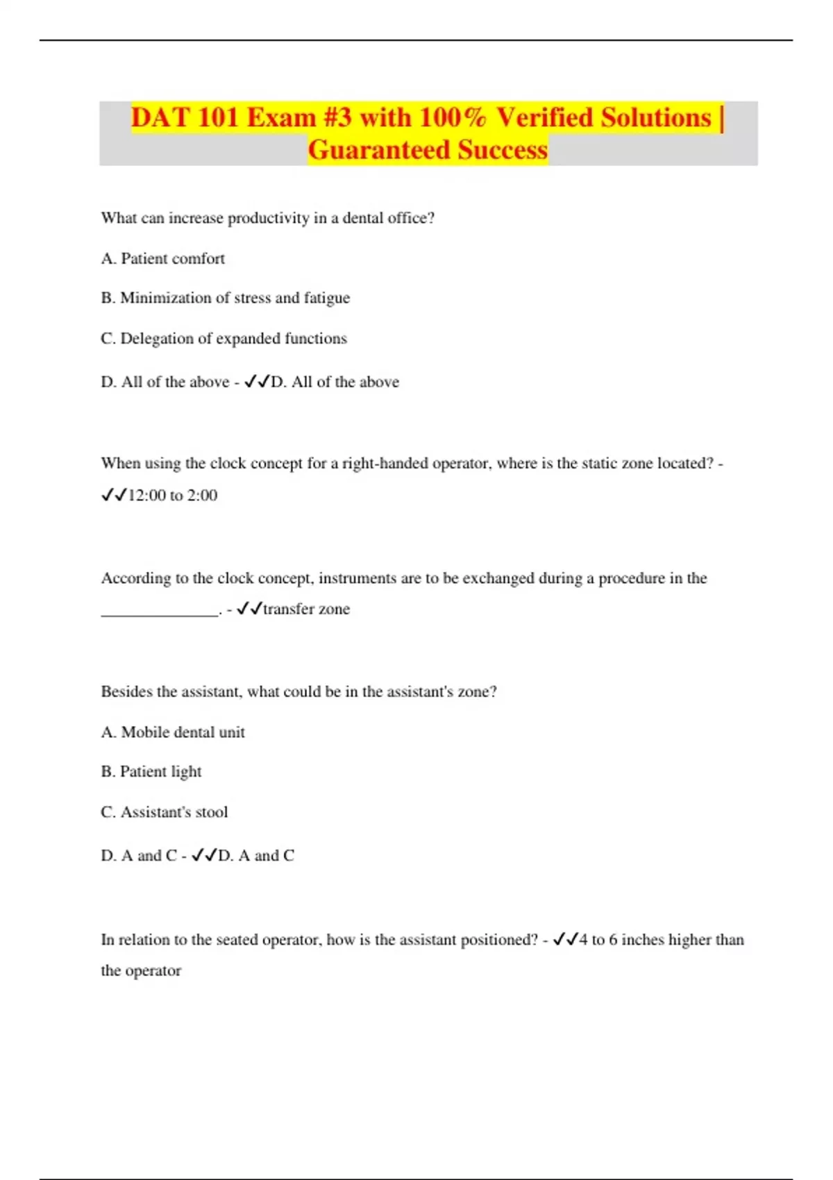 DAT 101 Exam #3 with 100% Verified Solutions | Guaranteed Success What can increase productivity in a dental office? A. Patient comfort B. Minimization of stress and fatigue C. Delegation of expanded functions D. All of the above - D. All of the above When using the clock concept for a right-handed operator, where is the static zone located? - 12:00 to 2:00 According to the clock concept, instruments are to be exchanged during a procedure in the ______________. - transfer zone Besides the assistant, what could be in the assistant's zone? A. Mobile dental unit B. Patient light C. Assistant's stool D. A and C - D. A and C In relation to the seated operator, how is the assistant positioned? - 4 to 6 inches higher than the operator How should the operator maintain his or her posture while performing intraoral functions? A. Upright B. Elbows at side C. Feet flat on floor D. All of the above - D. All of the above