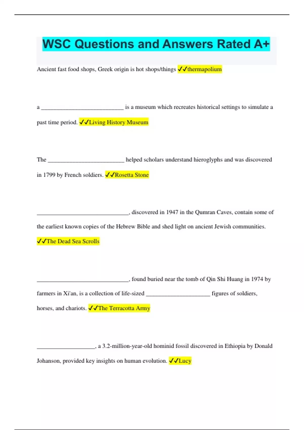 WSC Questions and Answers Rated A+ Ancient fast food shops, Greek origin is hot shops/things thermapolium a ___________________________ is a museum which recreates historical settings to simulate a past time period. Living History Museum The _________________________ helped scholars understand hieroglyphs and was discovered in 1799 by French soldiers. Rosetta Stone ______________________________, discovered in 1947 in the Qumran Caves, contain some of the earliest known copies of the Hebrew Bible and shed light on ancient Jewish communities. The Dead Sea Scrolls ______________________________, found buried near the tomb of Qin Shi Huang in 1974 by farmers in Xi'an, is a collection of life-sized _____________________ figures of soldiers, horses, and chariots. The Terracotta Army ___________________, a 3.2-million-year-old hominid fossil discovered in Ethiopia by Donald Johanson, provided key insights on human evolution. Lucy ___________________, discovered in 1939 in Suffolk, England, contained a ship burial and valuable artifacts, providing insights into early Anglo-Saxon society. Sutton Hoo ________________________ measures the amount of ______________-14 in an object and is used to determine the age of organic materials such as fossils, artifacts, and archaeological finds. Carbon dating _______________________________ is the use of selective or distorted evidence to support non-scientific claims about the past and is often used to promote unscientific or even fraudulent ideas. Pseudoarchaeology ___________________________________ is a collection of Buddhist texts carved onto wooden tablets in the 13th century in Korea, surviving numerous ___________________ due to the use of special buildings designed to regulate temperature and humidity. The Tripitaka Koreana ___________________________ include the Century Safe, the Westinghouse _________________, and the 1939 World's Fair _____________________, while items that could be included today are current newspapers, photographs, a smartphone, a letter to future generations, and cultural artifacts. Early time capsules The question of whether certain practices, such as limiting the teaching of history or maintaining strict gender roles, should be allowed is complex and has no easy answer, with some arguing for personal ________________ while others believe in protecting against potential harm. freedom ______________________________ criticized for lack of attention to indigenous peoples. Non- tribal members in Native American area raise questions of exploitation. Breeding animals for exhibit is ___________________. Plimoth Patuxet Museums Archaeologists and historians reconstruct _____________________________. Medieval Times serves pre-modern cuisine. historical food establishments __________________________________________ reconstructs and markets Irish history, sparking questions of appropriateness. Ulster American Folk Park ______________________________, like Tomorrowland, offer glimpses of what the future may hold. Living Future Museums