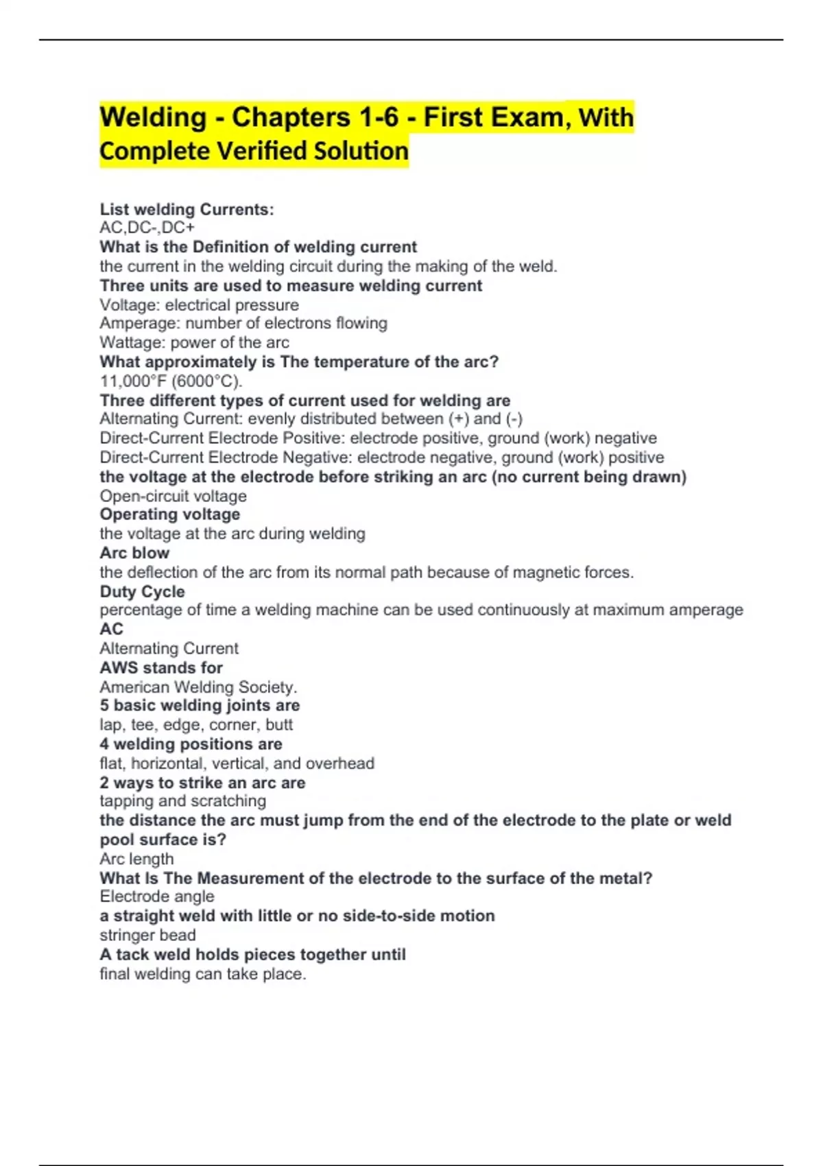Welding - Chapters 1-6 - First Exam, With Complete Verified Solution List welding Currents: AC,DC-,DC+ What is the Definition of welding current the current in the welding circuit during the making of the weld. Three units are used to measure welding current Voltage: electrical pressure Amperage: number of electrons flowing Wattage: power of the arc What approximately is The temperature of the arc? 11,000°F (6000°C). Three different types of current used for welding are Alternating Current: evenly distributed between (+) and (-) Direct-Current Electrode Positive: electrode positive, ground (work) negative Direct-Current Electrode Negative: electrode negative, ground (work) positive the voltage at the electrode before striking an arc (no current being drawn) Open-circuit voltage Operating voltage the voltage at the arc during welding Arc blow the deflection of the arc from its normal path because of magnetic forces. Duty Cycle percentage of time a welding machine can be used continuously at maximum amperage AC Alternating Current AWS stands for American Welding Society. 5 basic welding joints are lap, tee, edge, corner, butt 4 welding positions are flat, horizontal, vertical, and overhead 2 ways to strike an arc are tapping and scratching the distance the arc must jump from the end of the electrode to the plate or weld pool surface is? Arc length What Is The Measurement of the electrode to the surface of the metal? Electrode angle a straight weld with little or no side-to-side motion stringer bead A tack weld holds pieces together until final welding can take place. DC+ vs DC- DC+ will mean the current flows from the electrode to the base metal. This creates more heat at the electrode which creates less penetration but results in a better deposition. DC- gives you better penetration into the base metal but less filler metal is deposited. Conventional Flow Theory Starts at the positive and flows towards the negative. This is commonly illustrated in diagrams, but is not recognized as the chosen theory. Electron Flow Theory Theory which states electrons flow from negative to positive weld "a localized coalescence (the fusion or growing together of the grain structure of the materials being welded) of metals or nonmetals produced either by heating the materials to the required welding temperatures, with or without the application of pressure, or by the application of pressure alone, and with or without the use of filler materials.". smaw Shielded metal arc welding (SMAW) - also known as "stick welding", uses an electrode that has flux, the protectant for the puddle, around it. The electrode holder holds the electrode as it slowly melts away. Slag protects the weld puddle from atmospheric contamination. gtaw Gas tungsten arc welding... TIG..heliarc...manual welding process that uses a non-consumable tungsten electrode, an inert gas, and a separate filler material. gmaw Gas metal arc welding (GMAW) - commonly termed MIG (metal, inert gas), uses a wire feeding gun that feeds wire at an adjustable speed and flows an argon-based shielding gas or a mix of argon and carbon dioxide (CO2) over the weld puddle to protect it from atmospheric contamination. FCAW Flux-cored arc welding (FCAW) forge weld the most ancient welding processes, is a solid-state welding process that joins two pieces of metal by heating them to a high temperature and then hammering them together elihu thomson inventor of arc welding in 1886 OFW Oxyfuel Gas Welding, usually acytelene OFC Oxyfuel Gas Cutting Ideal process for high welding rates on thin-guage GMAW ppe Personal Protective Equipment GFCI Ground Fault Circuit Interrupter - Protect humans from deadly shock Type A fire extinguisher Combustible solids, paper, wood, and cloth. Green triangle symbol Type B fire extinguisher Combustible liquids, gas, oil, paint thinner. Red square symbol Type C fire extinguisher Electrical fires, motors, fuse boxes, welders, computers. Blue circle symbol Type D fire extinguisher Combustible metals, zinc, magnesium, and titanium. Yellow star symbol infrared light Infrared light has longer wavelengths, penetrates more deeply, has less energy, and produces more than visible light; makes up 60 percent of natural sunlight. Types of light that can cause burns ultraviolet and infrared ultraviolet (adj) of or relating to electromagnetic radiation having wavelengths shorter than those of visible light but lover than those of x-rays flash burn the damage that can be done to eyes after even brief exposure to ultraviolet light from arc welding. Flash burn requires medical attention. msds A widely used abbreviation for Material Safety Data Sheet. A MSDS contains details of the hazards associated with a chemical, and gives information on its safe use. Welding cables must never be spliced within ___ feet of the electrode holder 10 feet electrical resistance the property of some materials to block the flow of electrons. Measured in ohms electrical ground A conductive connection that provides a path for electrical current to pass from an electrical component into the earth. ansi American National Standards Institute: A private, non-profit organization that coordinates the development and use of voluntary consensus standards in the United States. ansi z89 ANSI rating required for hard hats to be used on the job. first degree burn Superficial burns through only the epidermis. second degree burn characterized by epidermal blisters, mottled appearance, and a red base? Damage extends into but not through the dermis. Recovery usually takes 2 to 3 weeks. third-degree burn a burn involving all layers of the skin; characterized by the destruction of the epidermis and dermis, with damage or destruction of subcutaneous tissue spot welding A form of resistance welding where the metal components being joined are clamped between two electrodes. An electric current is passed between the electrodes causing a build up of heat at the centre of the joint, fusing the two comp
