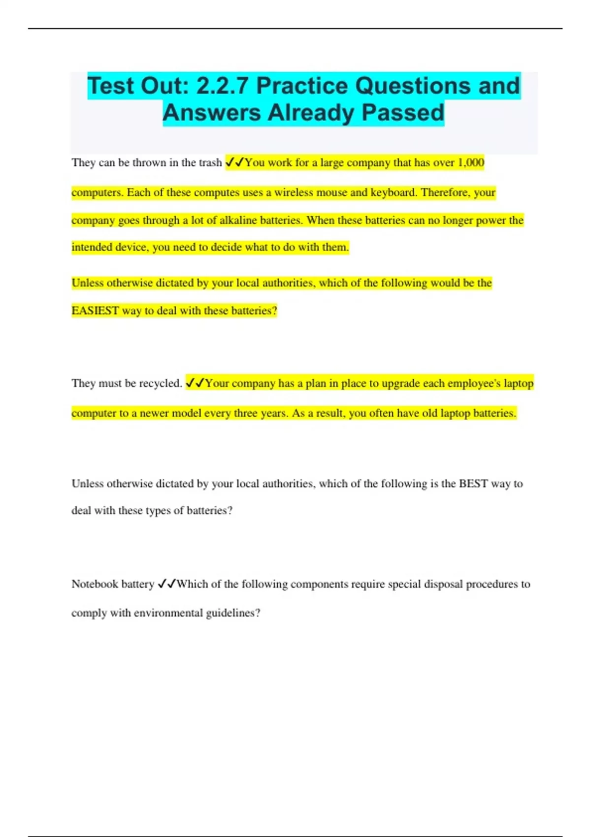 Test Out: 2.2.7 Practice Questions and Answers Already Passed They can be thrown in the trash You work for a large company that has over 1,000 computers. Each of these computes uses a wireless mouse and keyboard. Therefore, your company goes through a lot of alkaline batteries. When these batteries can no longer power the intended device, you need to decide what to do with them. Unless otherwise dictated by your local authorities, which of the following would be the EASIEST way to deal with these batteries? They must be recycled. Your company has a plan in place to upgrade each employee's laptop computer to a newer model every three years. As a result, you often have old laptop batteries. Unless otherwise dictated by your local authorities, which of the following is the BEST way to deal with these types of batteries? Notebook battery Which of the following components require special disposal procedures to comply with environmental guidelines? Decrease the humidity in the data center. Katy is a IT engineer who is responsible for maintaining the environment in her company data center in San Francisco. While swapping motherboards in a server in the data center, she notices that the original motherboard is showing signs of corrosion. Which of the following is the BEST solution to resolve the corrosion issue? Return them to the manufacturer for recycling. What is the BEST way to dispose of printer cartridges? Hot and cold aisles What method is used to ensure proper ventilation in a server room? Brownout Your company provides testing services that help customers identify and resolve performance issues with their software and e-commerce sites before they go live. To perform accurate testing, a large number of computers are required, sometimes numbering in the hundreds. Recently, you have noticed that the lights in the testing lab seem dimmer than normal and sometimes flicker. Which of the following electrical terms BEST describes the condition you are most likely experiencing? Laser printer Which of the following device types should be plugged into a surge-protected- only outlet on a UPS unit and not a battery backup outlet? Conditions the power signal