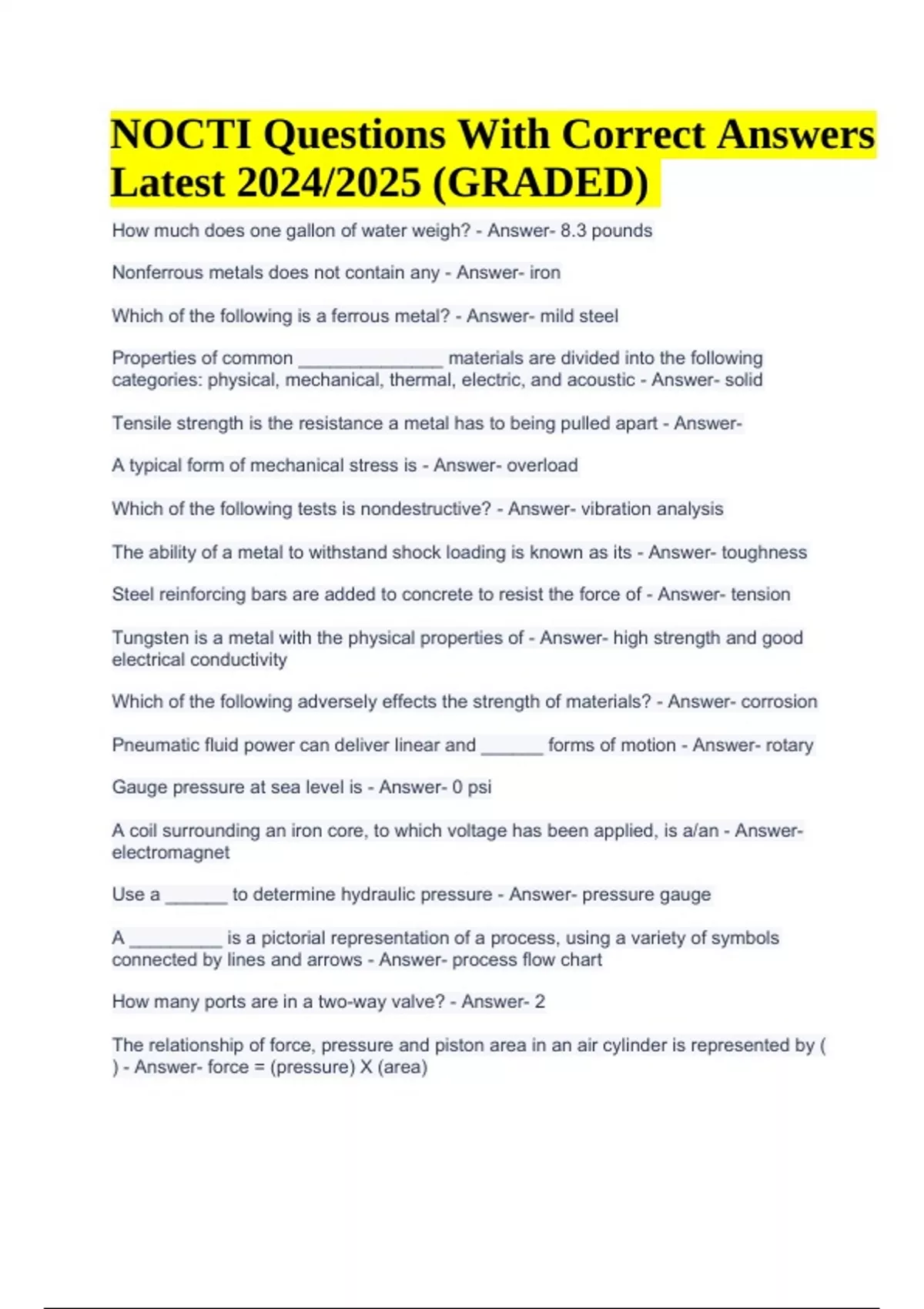 How much does one gallon of water weigh? - Answer- 8.3 pounds Nonferrous metals does not contain any - Answer- iron Which of the following is a ferrous metal? - Answer- mild steel Properties of common ______________ materials are divided into the following categories: physical, mechanical, thermal, electric, and acoustic - Answer- solid Tensile strength is the resistance a metal has to being pulled apart - AnswerA typical form of mechanical stress is - Answer- overload Which of the following tests is nondestructive? - Answer- vibration analysis The ability of a metal to withstand shock loading is known as its - Answer- toughness Steel reinforcing bars are added to concrete to resist the force of - Answer- tension Tungsten is a metal with the physical properties of - Answer- high strength and good electrical conductivity Which of the following adversely effects the strength of materials? - Answer- corrosion Pneumatic fluid power can deliver linear and ______ forms of motion - Answer- rotary Gauge pressure at sea level is - Answer- 0 psi A coil surrounding an iron core, to which voltage has been applied, is a/an - Answerelectromagnet Use a ______ to determine hydraulic pressure - Answer- pressure gauge A _________ is a pictorial representation of a process, using a variety of symbols connected by lines and arrows - Answer- process flow chart How many ports are in a two-way valve? - Answer- 2 The relationship of force, pressure and piston area in an air cylinder is represented by ( ) - Answer- force = (pressure) X (area) NOCTI Questions With Correct Answers Latest 2024/2025 (GRADED) When energized, a solenoid actuates upon which of the following? - Answer- steel A solenoid works on the principle of - Answer- electromagnetic force pneumatic directional control valves are, many times, sized for convenience of piping; however, a more efficient method is to size according to - Answer- flow coefficient An engineer has connected an oscilloscope to measure the output of a standard wall electrical outlet. The oscilloscope shows a 60 hertz sine wave measuring 120 volts. This signal is - Answer- analog The worst enemy of a pneumatic system is - Answer- contamination A specialized schematic used to document industrial control logic systems is a - Answer- ladder diagram The flow through a flow control valve will increase with increase with an increased - Answer- orifice or throat size In a fluid system, fluid encounters more ______ when it travels long distances - Answerresistance The relationship of force, pressure, and piston area in an air cylinder is represented by - Answer- force = pressure x area A photo detector converts light to a/an ____________ signal - Answer- electrical Fluid in a hydraulic system is basically - Answer- not compressible In fluid resistance systems, resistance is affected by the ______ of the pipe - Answerdiameter To determine pressure in a hydraulic system, ________ the total force by the area on which it acts - Answer- divide The purpose of a hydraulic system is to - Answer- transform mechanical energy into hydraulic energy Atmospheric pressure at sea level is - Answer- 14.7 psi Increasing a flowing liquids viscosity or friction, or changing flow direction, will result in - Answer- velocity increase The formula for force of a hydraulic cylinder is (4 words) - Answer- pressure multiplied by area If containments block a system, the first place the blockage occurs is in - Answer- the suction side of a systems pump The speed of a pneumatic cylinder is affected mainly by - Answer- compressibility of air A network interface card (NIC) on a computer is receiving a series of pulses measuring +5 volts DC then alternating back to 0 volts. The +5 volt signal is referred to as - Answer- high Compared with hydraulic systems, pneumatic systems provide inexpensive material, faster operation and - Answer- a non-hazardous medium A photo diode - Answer- emits light when a current passes through it The relationship between gauge and absolute pressure is ( ) - Answer- gauge pressure = (absolute pressure) - (atmospheric pressure) When installing a new three-way pneumatic valve, a technician, should attach ports A and B to the - Answer- pneumatic cylinder Typical pressure gauges will read ______ at atmospheric pressures - Answer- 0 psi A _________ switch opens automatically when the current exceeds a predetermined safety level - Answer- limit The main advantage of drilling on the vertical mill rather than the drill press is that - Answer- holes can be more accurately located and spaced The technician should use a _____________ to cut a keyway in a shaft - Answermilling machine The most accurate way to cut square metal steel tubing is to use a/an - Answerhorizontal band saw The best use for a chasing die is to - Answer- recut damaged threads Undercutting is a condition that generally occurs when the - Answer- welding current is too high Abrasive cutoff saws penetrate material by grinding, which makes them valuable for cutting - Answer- extremely tough or hardened material The _________ code details welding requirements - Answer- AWS Use _______________ to join a nut to sheet material - Answer- arc welding When milling aluminum, set the mill at __________ RPM speed - Answer- high The _____________ code defines requirements when joining metals using the MIG (magnesium inert gas) process - Answer- AWS The acronym, OEM, refers to - Answer- original equipment manufacturers While the use of automated production and assembly systems in product manufacturing is well known, such work is still predominately accomplished manually by - Answerhuman operators A structural engineering company is designing a new stadium. The company has hired specialists to design the video and sound system, parking lot, and playing surface. The specialists are referred to as - Answer- sub contractors Which statement best describes precision alignment? - Answer- it projects shaft rotational centers in a straight line Having thi