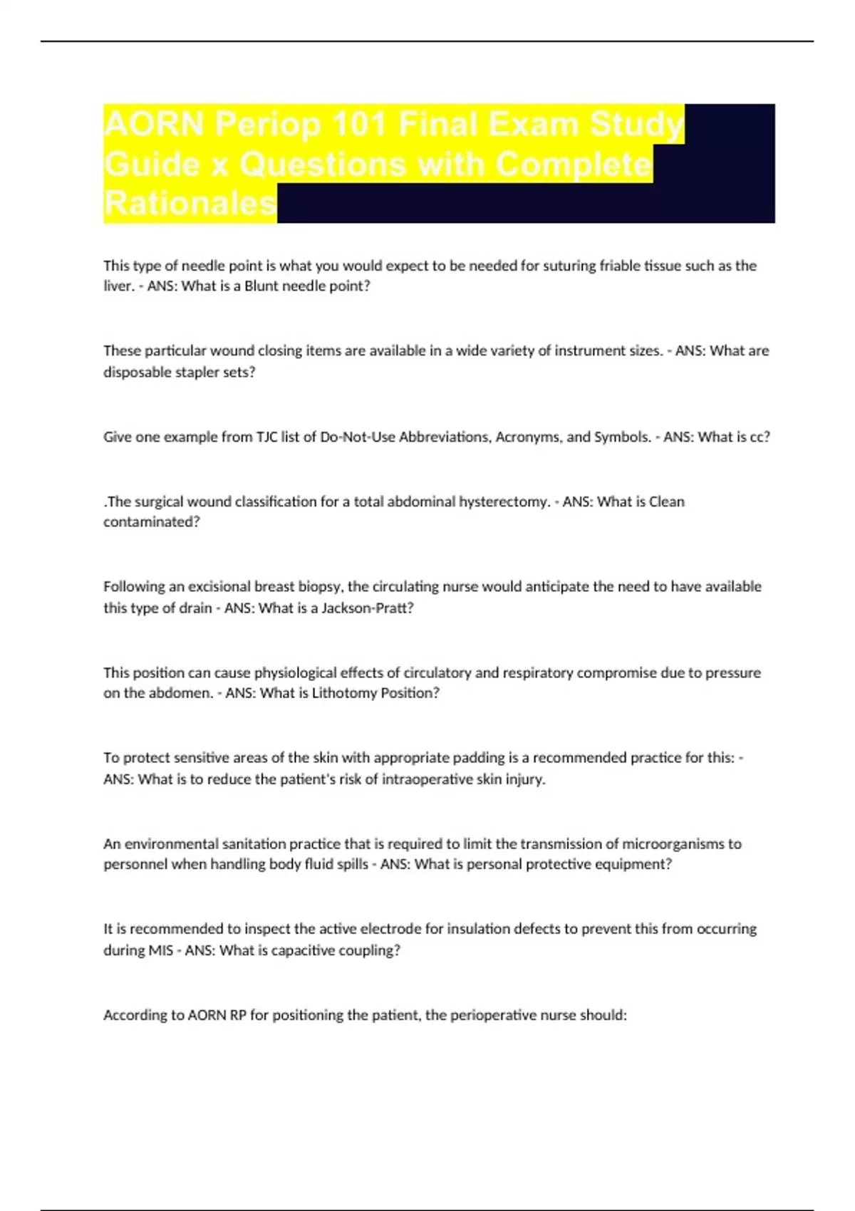AORN Periop 101 Final Exam Study Guide x Questions with Complete Rationales