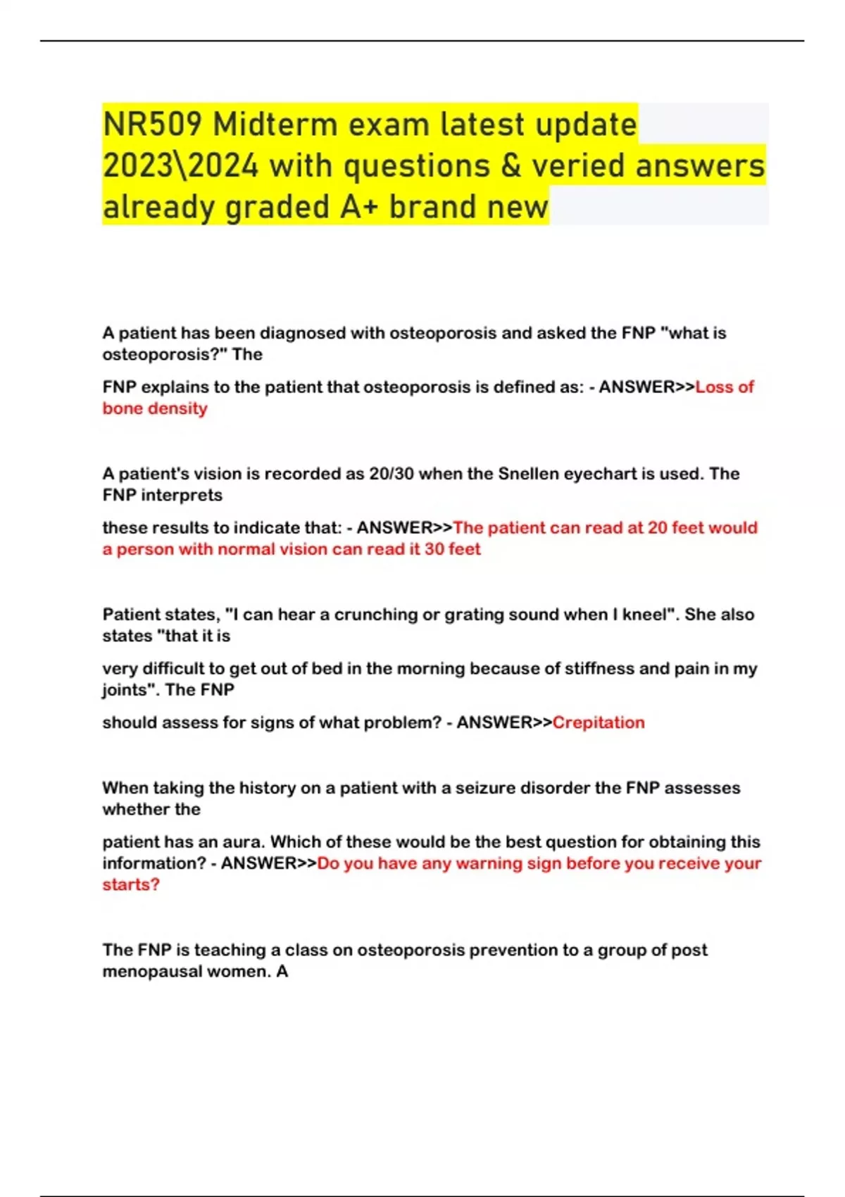 NR509 Midterm exam latest update with questions & veried answers already graded A+ brand new A patient has been diagnosed with osteoporosis and asked the FNP "what is osteoporosis?" The FNP explains to the patient that osteoporosis is defined as: - ANSWER>>Loss of bone density A patient's vision is recorded as 20/30 when the Snellen eyechart is used. The FNP interprets these results to indicate that: - ANSWER>>The patient can read at 20 feet would a person with normal vision can read it 30 feet Patient states, "I can hear a crunching or grating sound when I kneel". She also states "that it is very difficult to get out of bed in the morning because of stiffness and pain in my joints". The FNP should assess for signs of what problem? - ANSWER>>Crepitation When taking the history on a patient with a seizure disorder the FNP assesses whether the patient has an aura. Which of these would be the best question for obtaining this information? - ANSWER>>Do you have any warning sign before you receive your starts? The FNP is teaching a class on osteoporosis prevention to a group of post menopausal women. A participant shows that she needs more instruction when she states I will: - ANSWER>>" Start swimming to increase my weight bearing exercise" A patient's uvula rises midline when she says"ahh" and she has a positive gag reflex. The FNP has just tested which cranial nerves? - ANSWER>>IX, X During an examination the FNP notices that a patient is unable to stick out his tongue. Which cranial nerve is involved with successful performance of this action? - ANSWER>>XII The FNP is performing a neurological assessment on a 41-year-old woman with a history of diabetes. When testing her ability to feel the vibrations of a tuning fork the FNP notices that the patient is unable to feel vibrations on the great toe or ankle bilaterally, but she is able to feel vibrations on both patella. Given this information what would the FNP suspect? - ANSWER>>Peripheral neuropathy And 80-year-old woman is visiting the clinic for a check up. She states "I can't walk as much as I used to". The FNP is observing from motor dysfunction in her hip and should have her: - ANSWER>>Abduct her hip while she is lying on her back The FNP is testing the function of cranial nerve XI. Which of these best describes the response the FNP should expect if the nerve is intact?The patient - ANSWER>>Moves the head and shoulders against resistance with equal strength A 50-year-old woman is in a clinic for weakness in her left arm and leg that she noticed for the