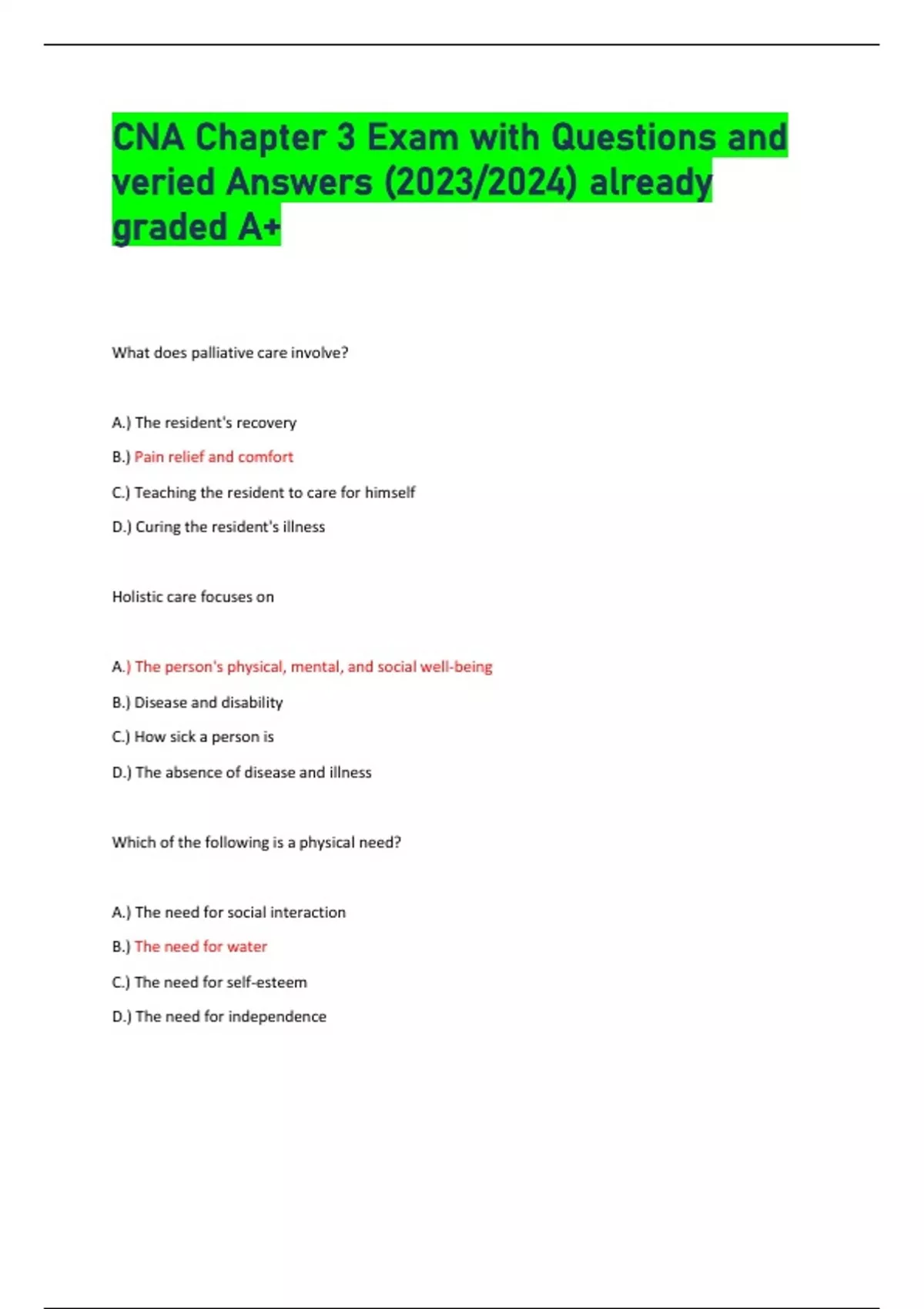 TI COMPREHENSIVE EXIT EXAM NGN 2023 WITH QUESTIONS & VERIED ANSWES ALREADY GRADED A+ A nurse is caring for a client who has end stage liver disease and is undergoing a paracentesis. Which of the following actions should the nurse take to evaluate the effectiveness of the procedure? - ANSWER>>Compare the client's current weight with the preprocedural weight A nurse is reviewing the lab data of a client who received 2 units of packed RBCs. Which of the following lab findings should the nurse expect following the transfusion? - ANSWER>>Increased HCT A school nurse is teaching a parent about absence seizures. Which of the following information should the nurse include? - ANSWER>>This type of seizure can be mistaken for daydreaming A charge nurse is teaching a newly licensed nurse about the facility's computerized documentation system. Which of the following information should the nurse include? - ANSWER>>Information technology will install a firewall to secure client information A nurse inadvertently administers 160mg of valsartan PO to a client who was scheduled to receive 80mg. Which of the following actions is the priority for the nurse to take? - ANSWER>>Evaluate the client for orthostatic hypotension A home health nurse is caring for a child who has Lyme disease. Which of the following is an appropriate action for the nurse to take? - ANSWER>>Ensure the state health department has been notified A nurse is caring for a client who has a vented NG tube set to low intermittent suction and has vomited. Which of the following actions should the nurse perform first? - ANSWER>>Evaluate functioning of the suction device While performing a routine assessment, a nurse notices fraying on the electrical cord of a client's continuous passive motion device. Which of the following actions should the nurse take first? - ANSWER>>Remove the device from the room A nurse is setting up a sterile field to perform wound irrigation for a client. Which of the following actions should the nurse take when pouring the sterile solution? - ANSWER>>Remove the cap and place it sterile side up on a CLEAN surface A nurse is conducting health promotion education regarding contraindications to combination oral contraceptives use to a group of women. Which of the following conditions should the nurse include in the teaching? - ANSWER>>Hypertension A nurse is providing teaching to a client who has a depressive disorder and a new prescription for amitriptyline. Which of the following statements by the client indicates an understanding of the teaching? - ANSWER>>"I know it will be a couple of weeks before the medication helps me feel better."