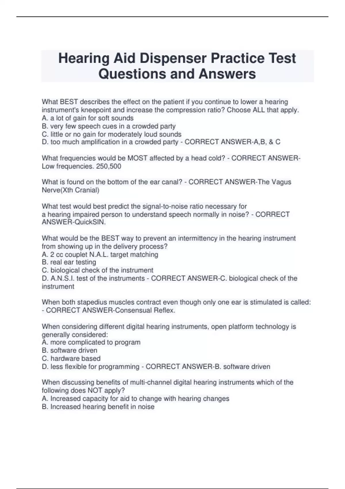 Hearing Aid Dispenser Practice Test Questions and Answers What BEST describes the effect on the patient if you continue to lower a hearing instrument's kneepoint and increase the compression ratio? Choose ALL that apply. A. a lot of gain for soft sounds B. very few speech cues in a crowded party C. little or no gain for moderately loud sounds D. too much amplification in a crowded party - CORRECT ANSWER-A,B, & C What frequencies would be MOST affected by a head cold? - CORRECT ANSWERLow frequencies. 250,500 What is found on the bottom of the ear canal? - CORRECT ANSWER-The Vagus Nerve(Xth Cranial) What test would best predict the signal-to-noise ratio necessary for a hearing impaired person to understand speech normally in noise? - CORRECT ANSWER-QuickSIN. What would be the BEST way to prevent an intermittency in the hearing instrument from showing up in the delivery process? A. 2 cc couplet N.A.L. target matching B. real ear testing C. biological check of the instrument D. A.N.S.I. test of the instruments - CORRECT ANSWER-C. biological check of the instrument When both stapedius muscles contract even though only one ear is stimulated is called: - CORRECT ANSWER-Consensual Reflex. When considering different digital hearing instruments, open platform technology is generally considered: A. more complicated to program B. software driven C. hardware based D. less flexible for programming - CORRECT ANSWER-B. software driven When discussing benefits of multi-channel digital hearing instruments which of the following does NOT apply? A. Increased capacity for aid to change with hearing changes B. Increased hearing benefit in noise C. Exact fit to the patient's hearing loss D. More "natural" sound reproduction - CORRECT ANSWER-C. Exact fit to patient's hearing loss. When IA is exceeed, and one cochlea is better than the other ____ - CORRECT ANSWER-Cross-Over is poss