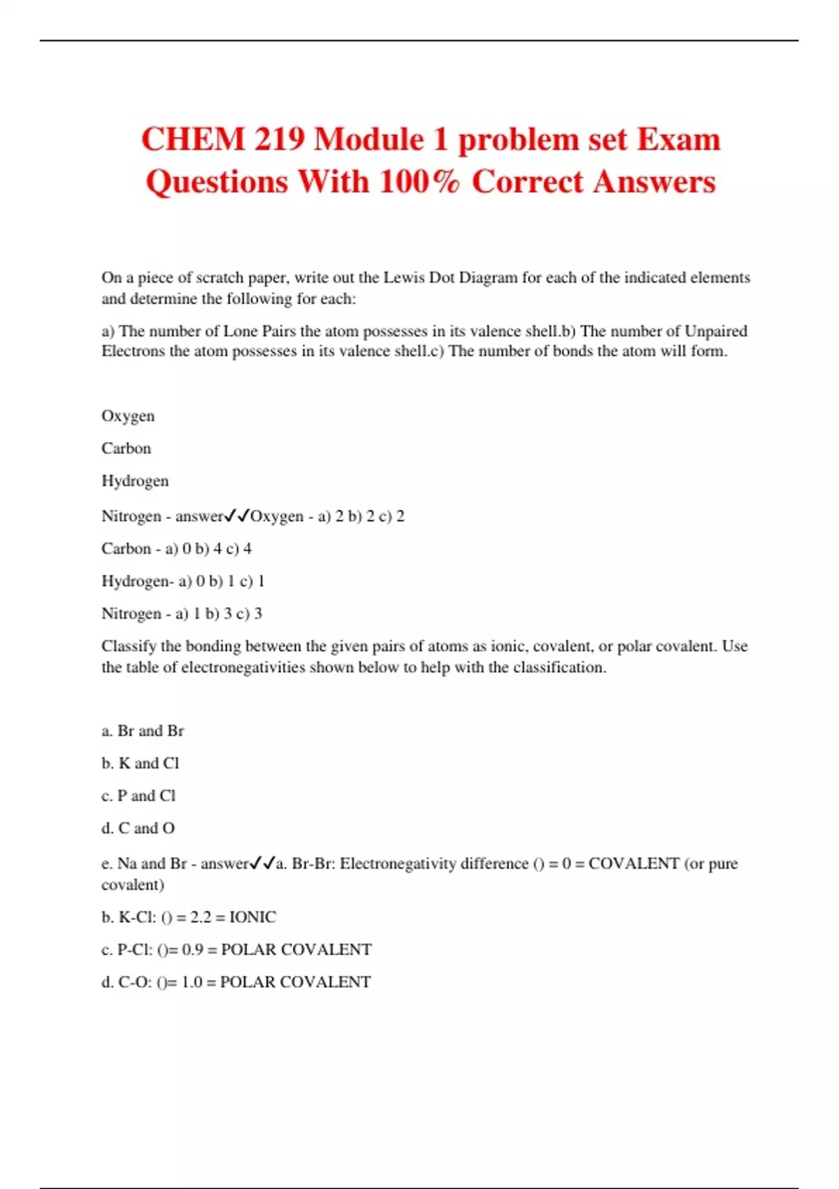 CHEM 219 Module 1 problem set Exam Questions With 100% Correct Answers On a piece of scratch paper, write out the Lewis Dot Diagram for each of the indicated elements and determine the following for each: a) The number of Lone Pairs the atom possesses in its valence shell.b) The number of Unpaired Electrons the atom possesses in its valence shell.c) The number of bonds the atom will form. Oxygen Carbon Hydrogen Nitrogen - answerOxygen - a) 2 b) 2 c) 2 Carbon - a) 0 b) 4 c) 4 Hydrogen- a) 0 b) 1 c) 1 Nitrogen - a) 1 b) 3 c) 3 Classify the bonding between the given pairs of atoms as ionic, covalent, or polar covalent. Use the table of electronegativities shown below to help with the classification. a. Br and Br b. K and Cl c. P and Cl d. C and O e. Na and Br - answera. Br-Br: Electronegativity difference () = 0 = COVALENT (or pure covalent) b. K-Cl: () = 2.2 = IONIC c. P-Cl: ()= 0.9 = POLAR COVALENT d. C-O: ()= 1.0 = POLAR COVALENT e. Na-Br: () = 1.8 = POLAR COVALENT Define the term constitutional isomer. - answerTwo (or more) different chemical compounds with the same molecular formula but different connectivity between the atoms in their structural formulae. Explain (using specific evidence) wh